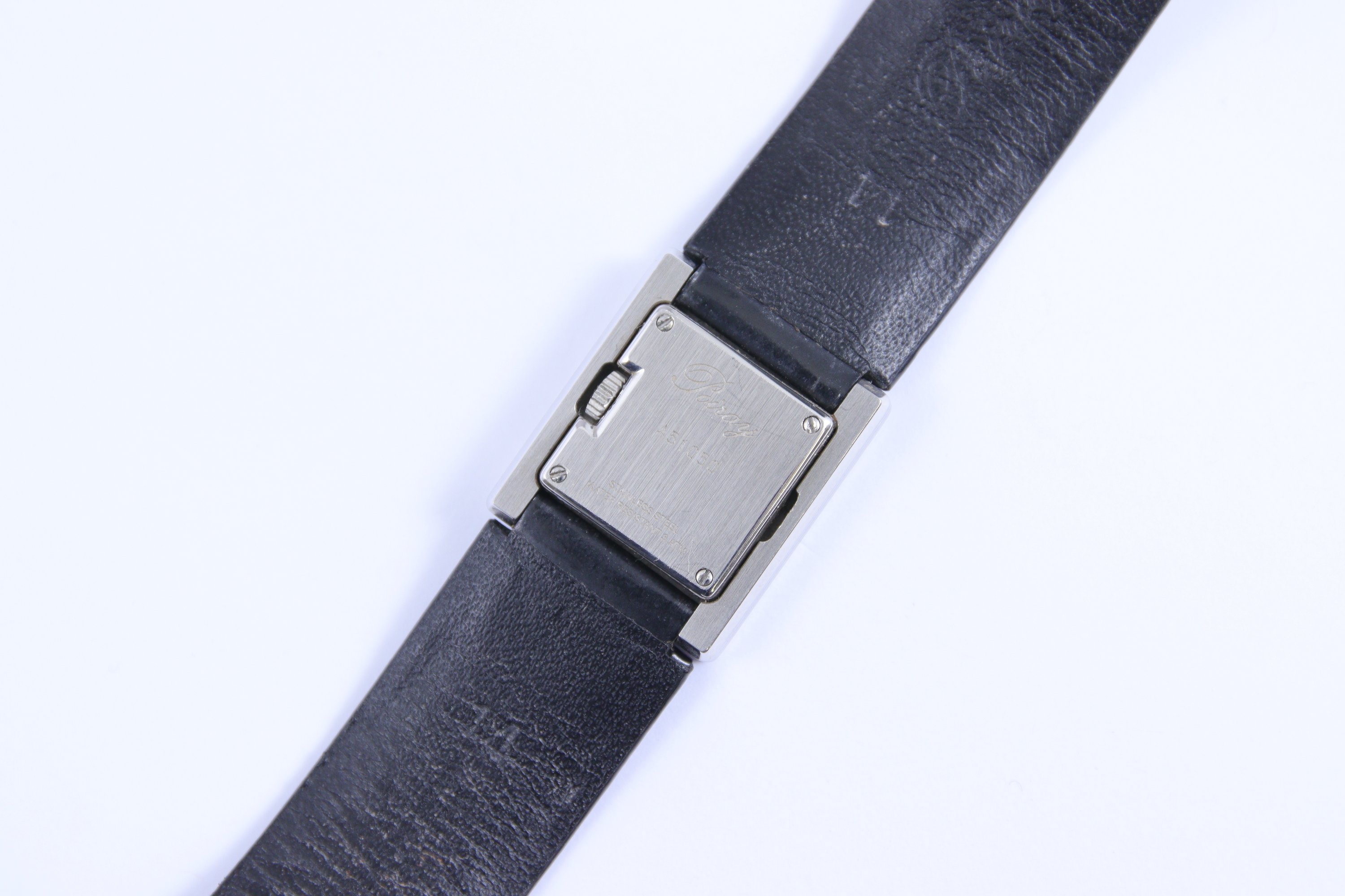 POIRAY. MONTRE BRACELET MA PREMIÈRE de dame en acier . Le boitier de forme rectangulaire. le cadran rose avec les heures 3, 6, 9 et 12 en chiffres arabes. Mouvement à quartz et bouton à six heures. Numérotée A51050.
