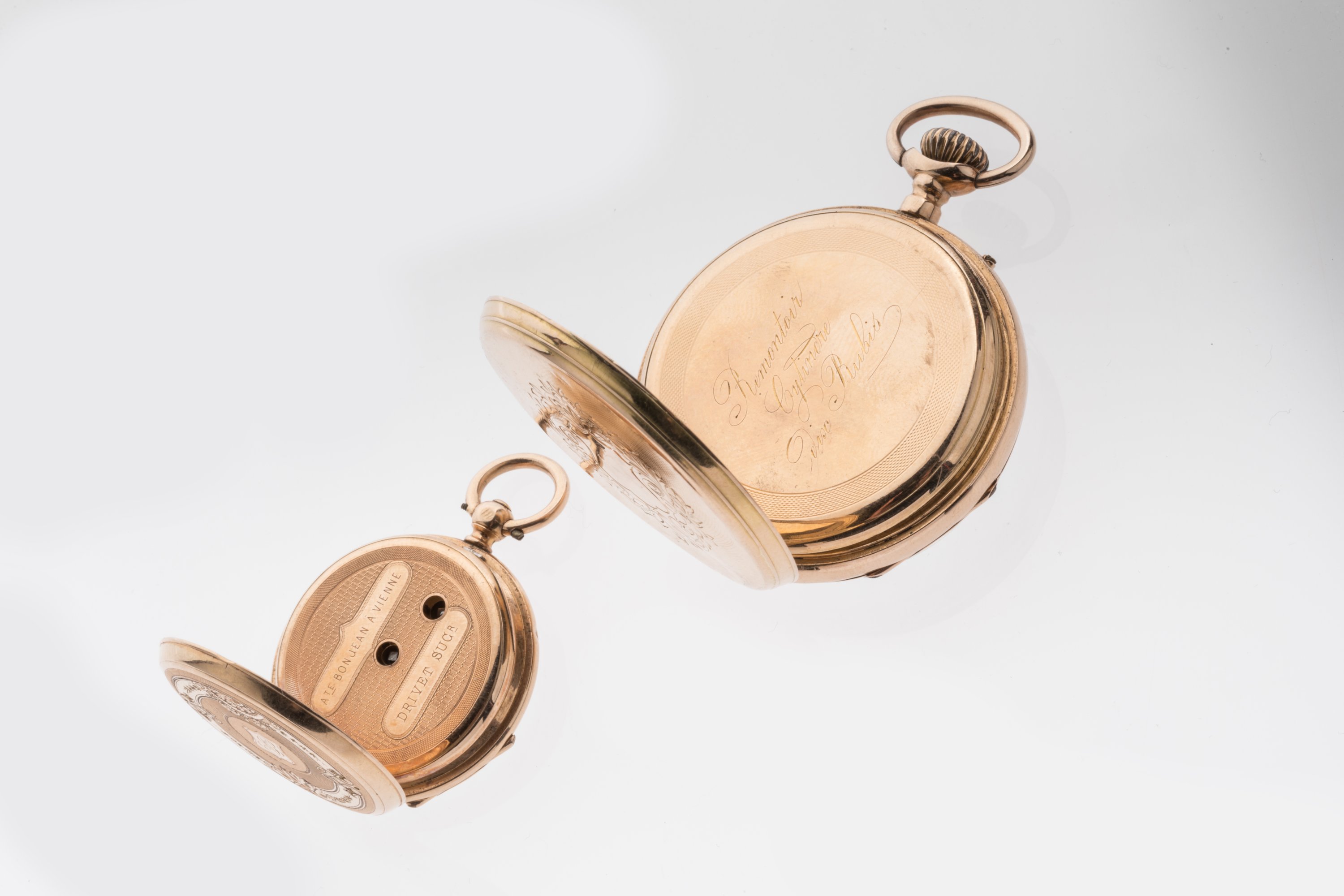 - L'une à cadran émaillé à chiffres romains. Remontage à clé, fond guilloché et monogrammé. Cache poussière gravé "BONJEAN À VIENNE - DRIVET SUC". Numérotée 155406.