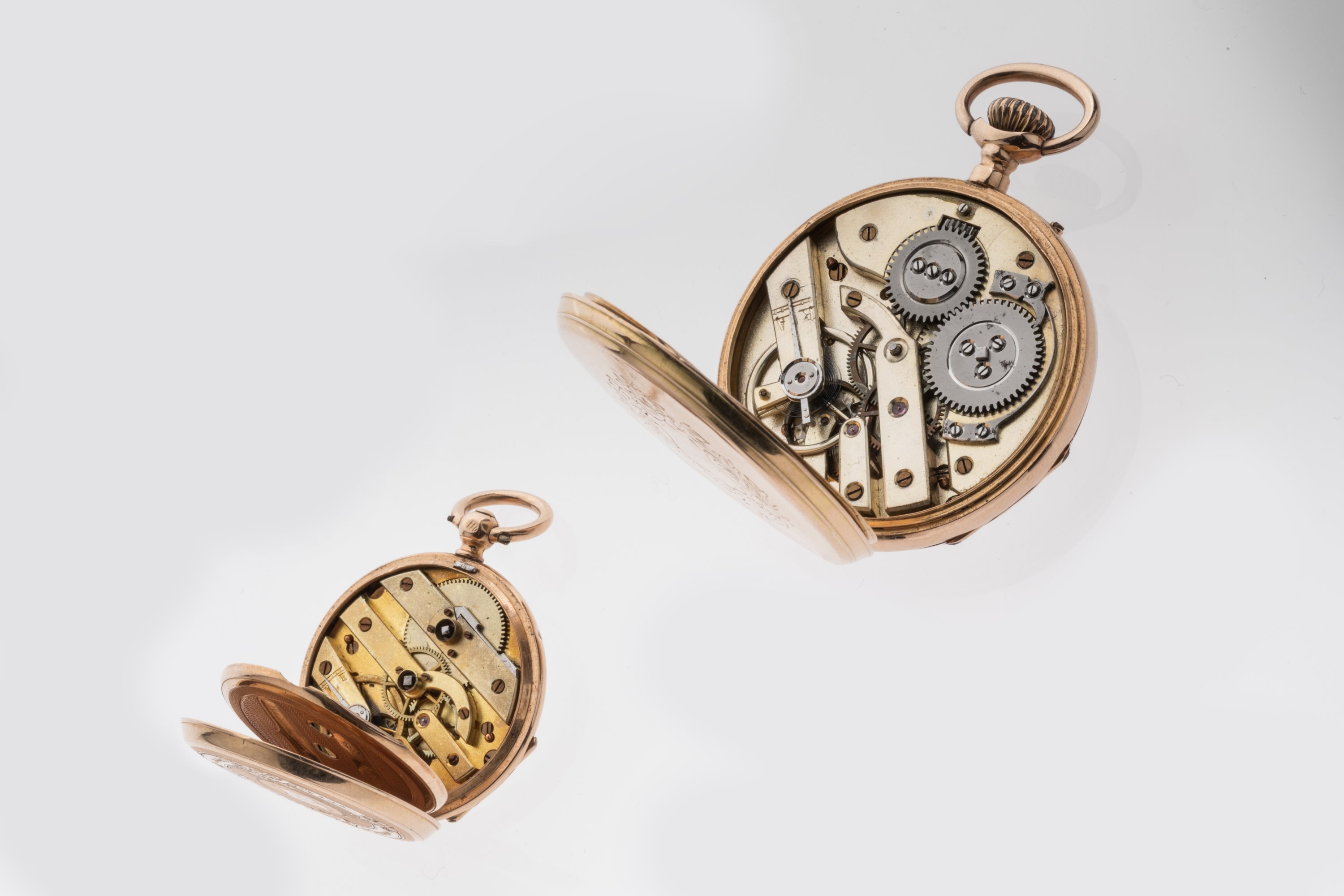 - L'autre à cadran émaillé à chiffres romains. Remontoir et cylindre dix rubis, fond guilloché et ciselé. Cache poussière. Numérotée 15069.
