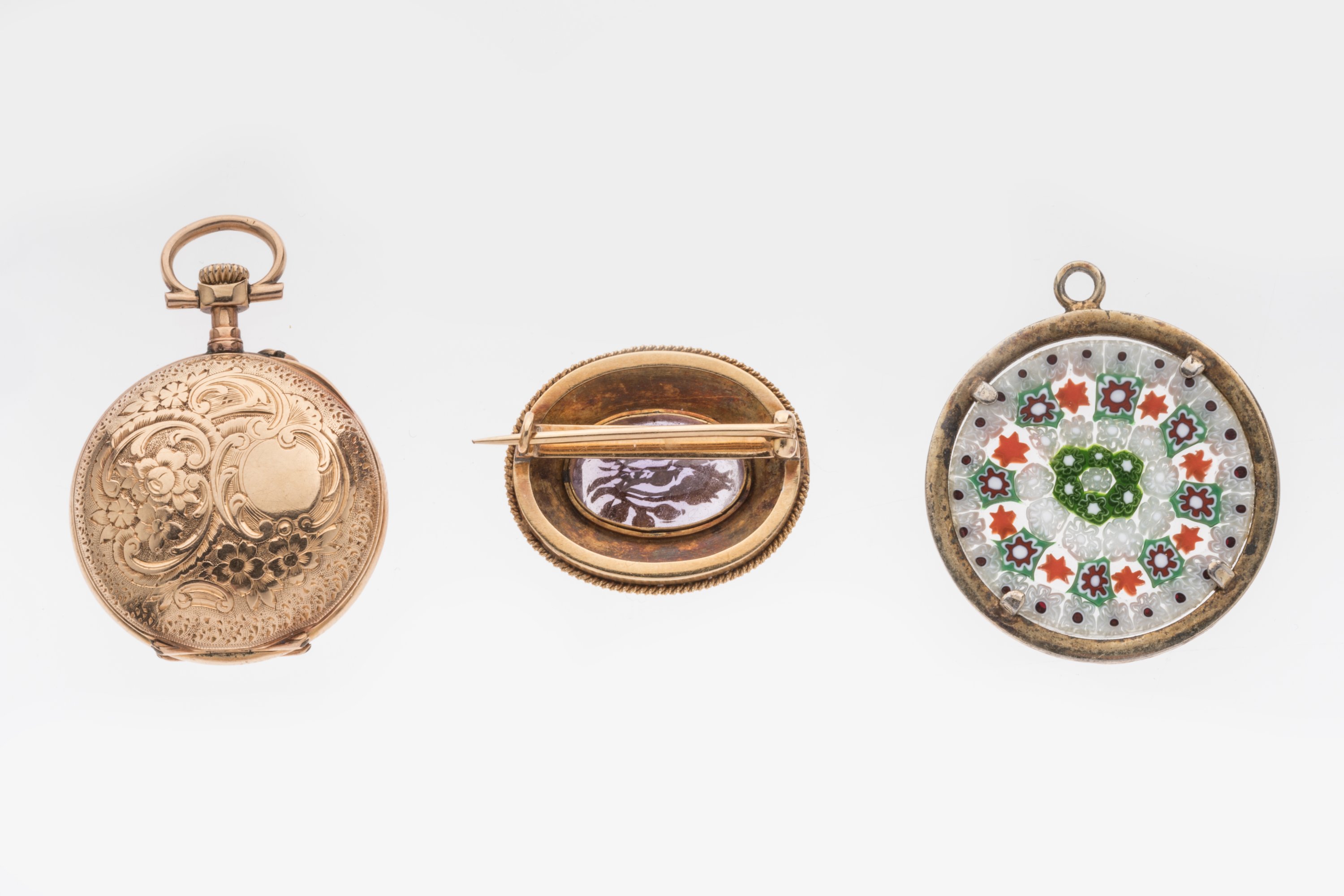 - BROCHE en or 750 millièmes ornée d'une pierre violette façon améthyste gravée d'un motif floral. Frise de semences de perles. Haut. 25 mm. Poids brut 7,3 g.