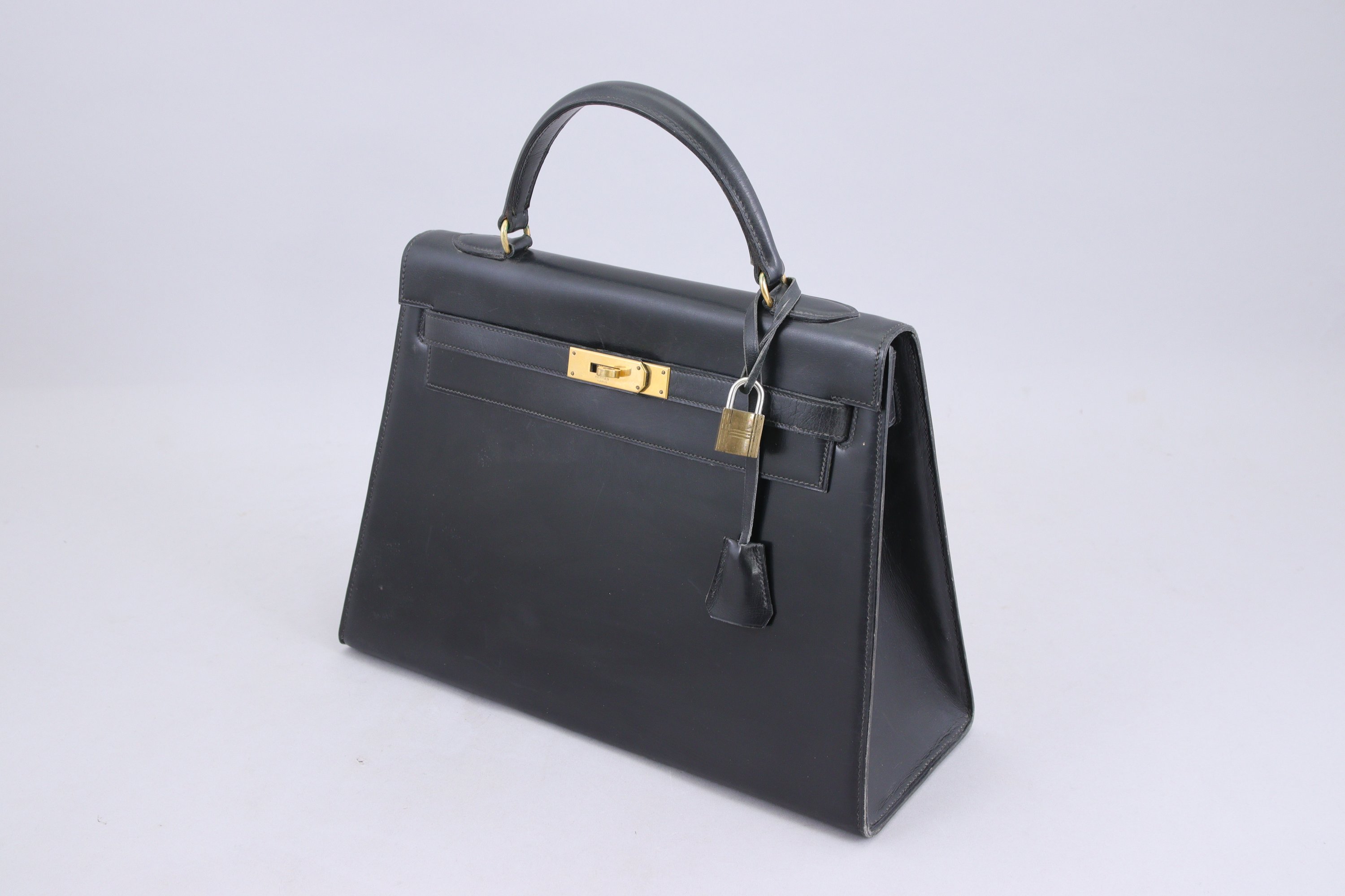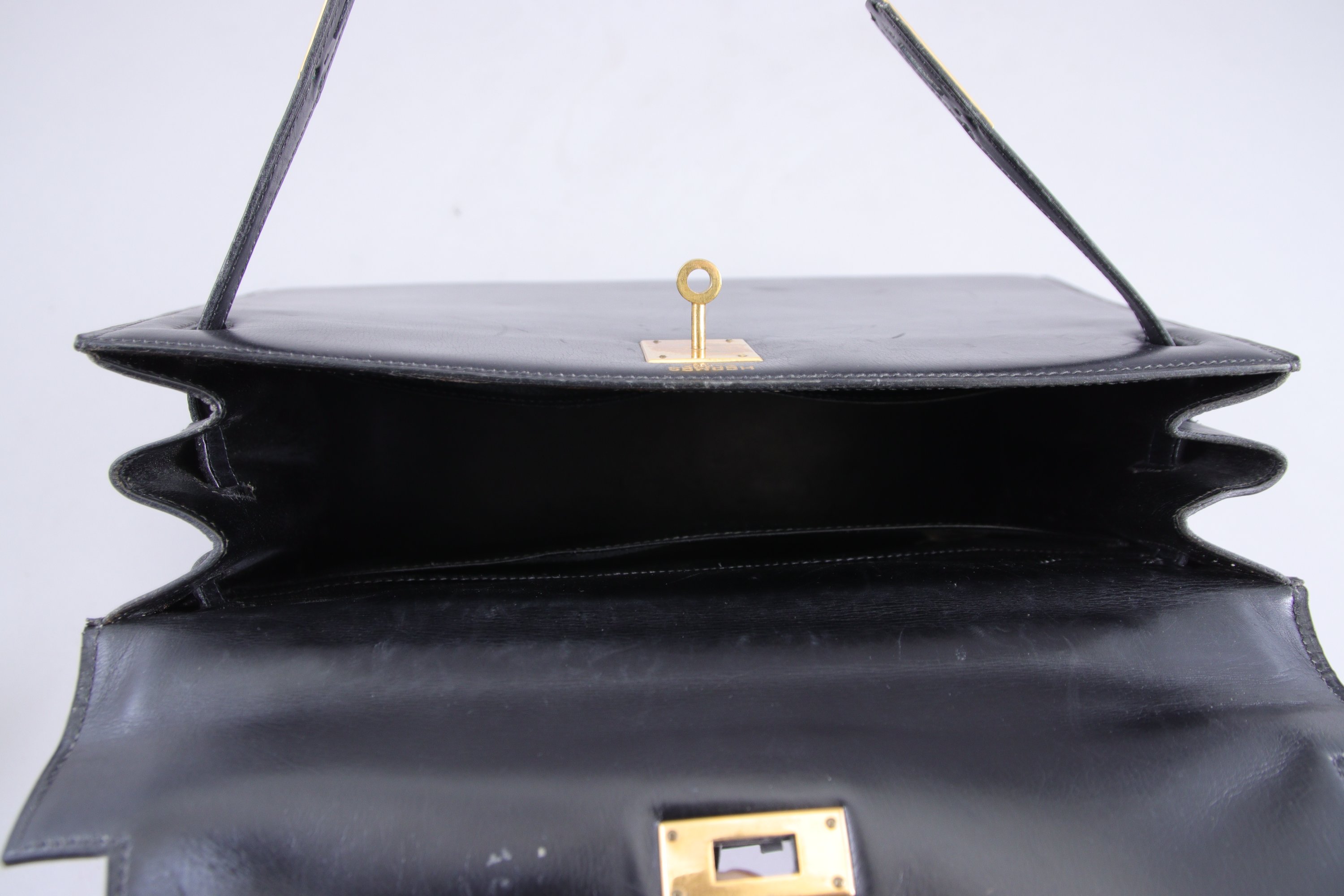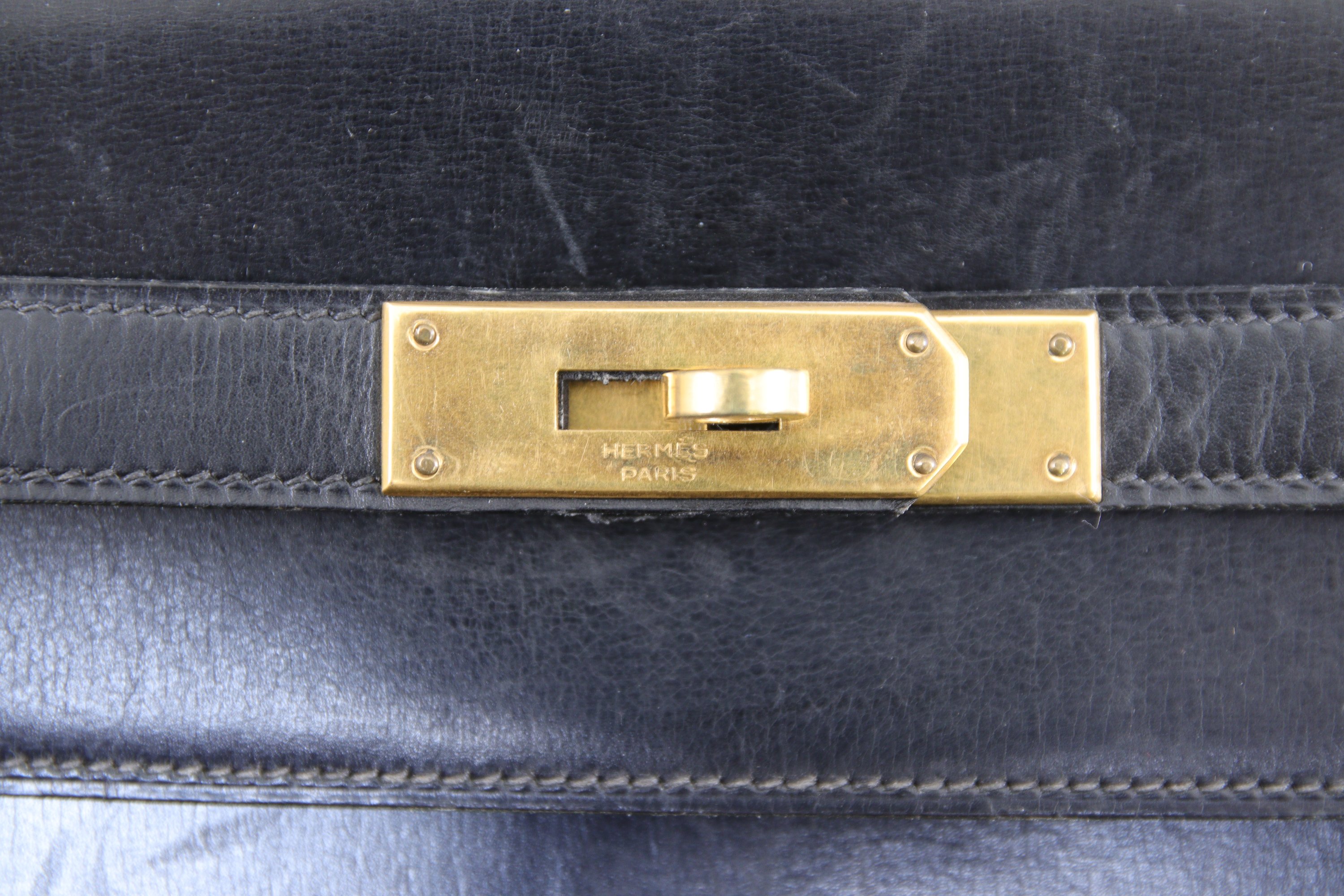 HERMÈS. SAC à MAIN modèle Kelly en cuir noir vintage. Fermoir et patins en métal doré, avec clochette, cadenas et deux clés.