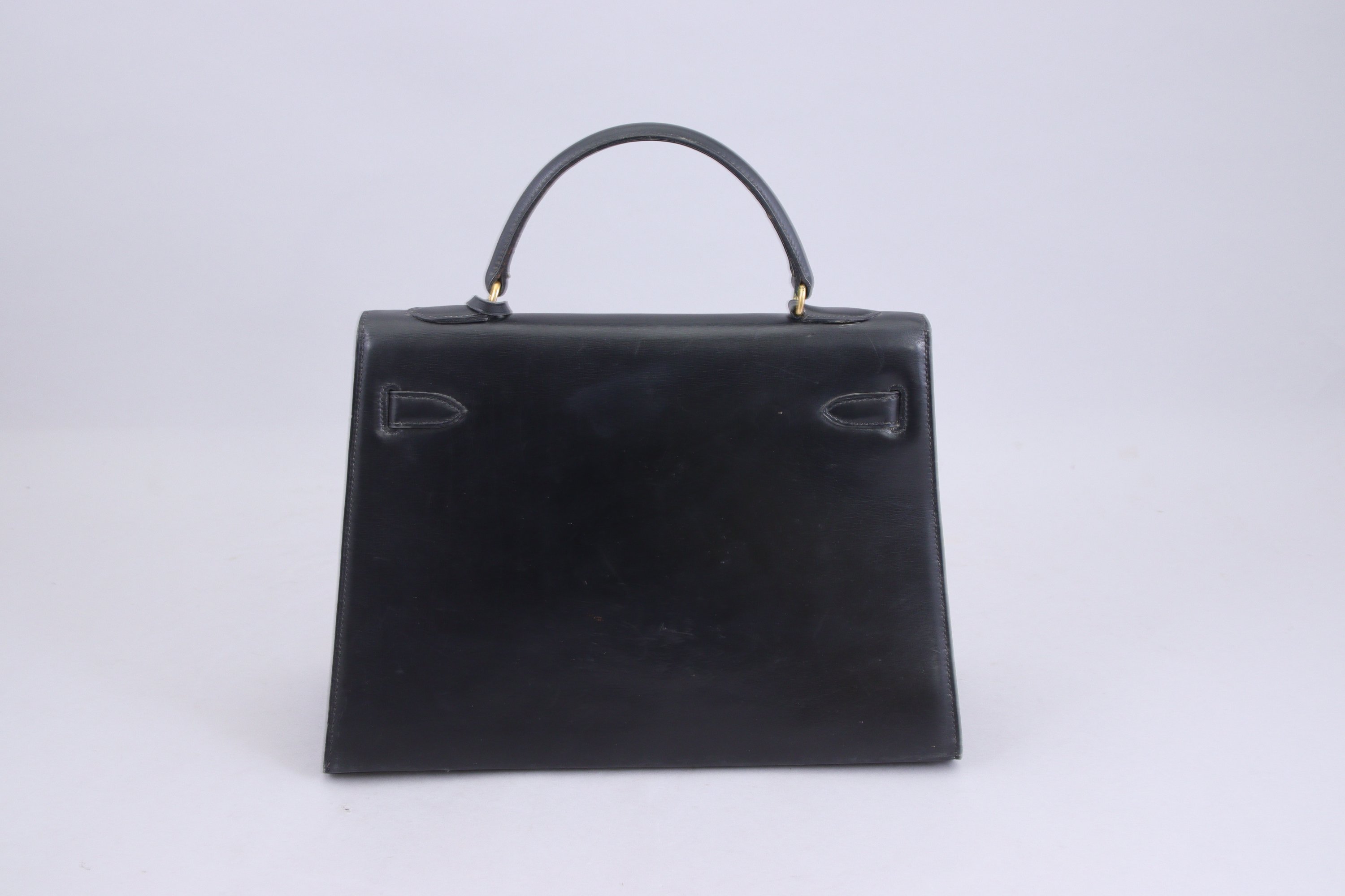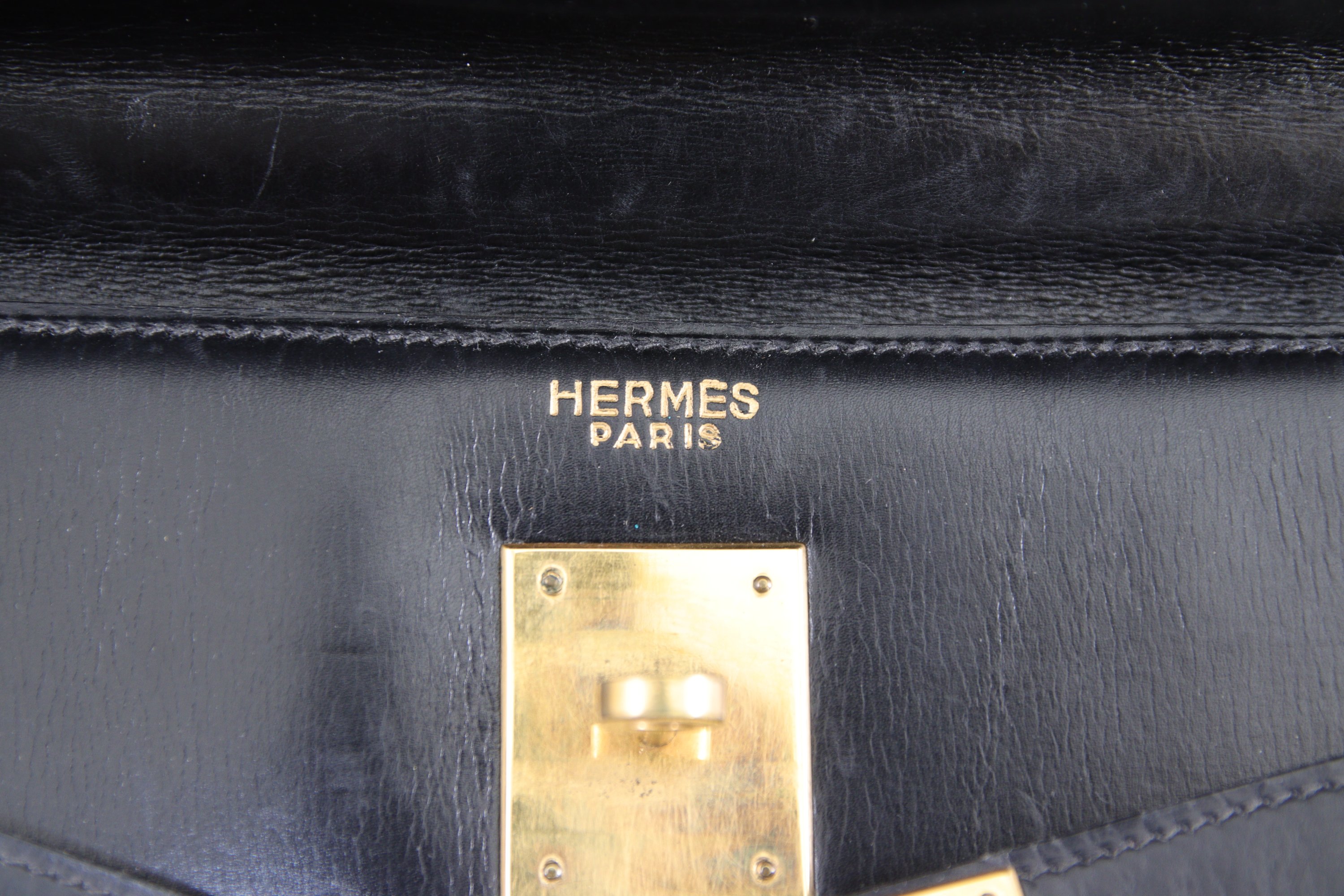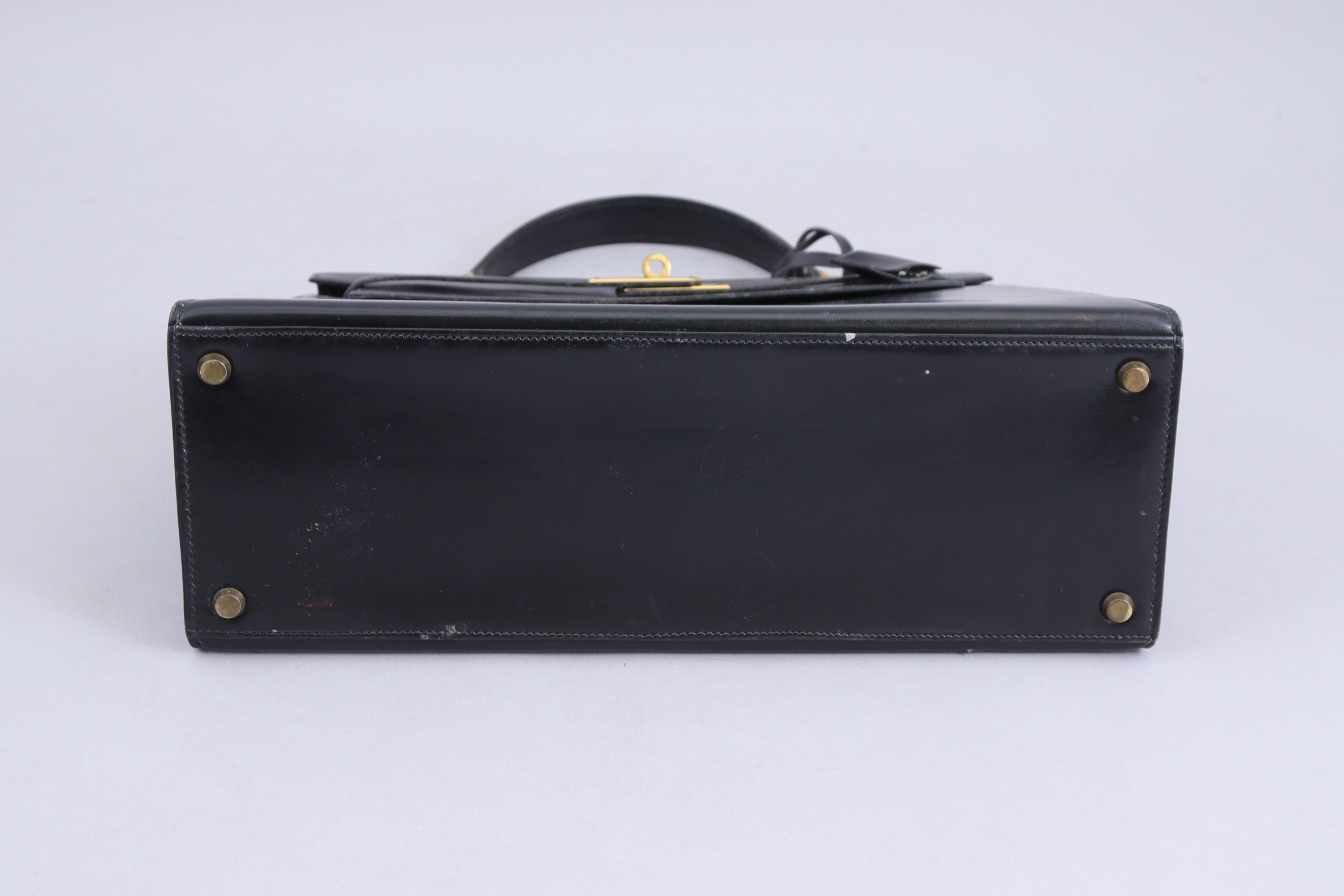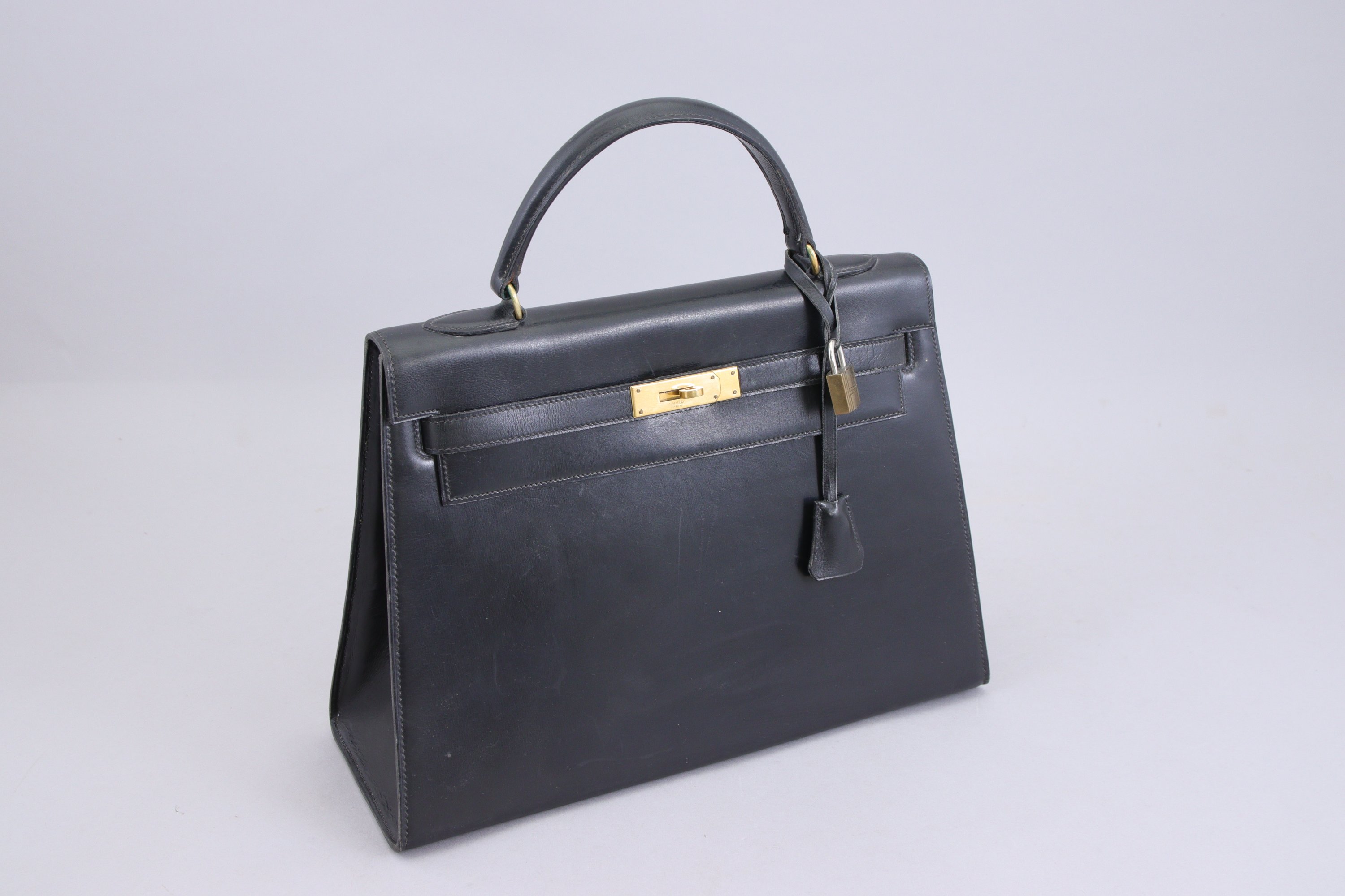 HERMÈS. SAC à MAIN modèle Kelly en cuir noir vintage. Fermoir et patins en métal doré, avec clochette, cadenas et deux clés.