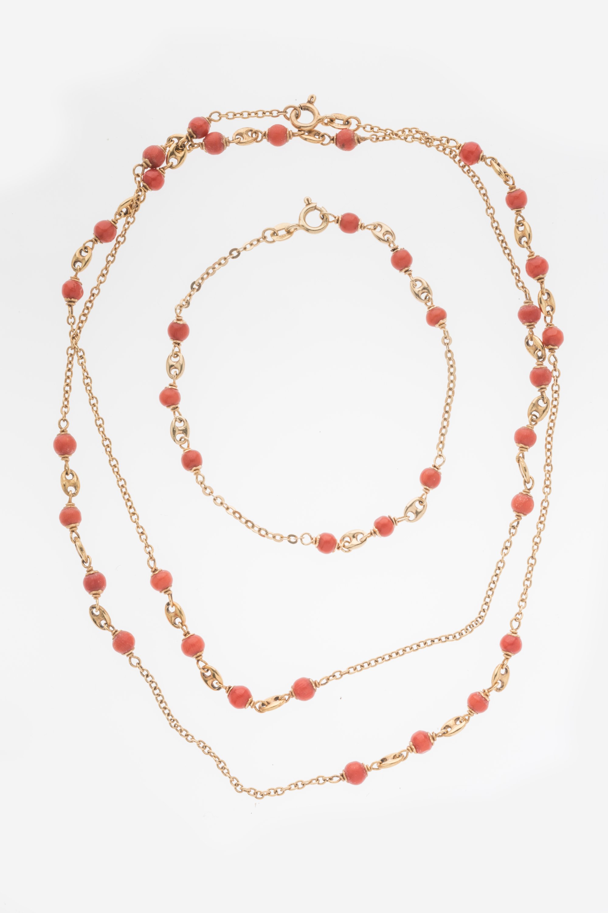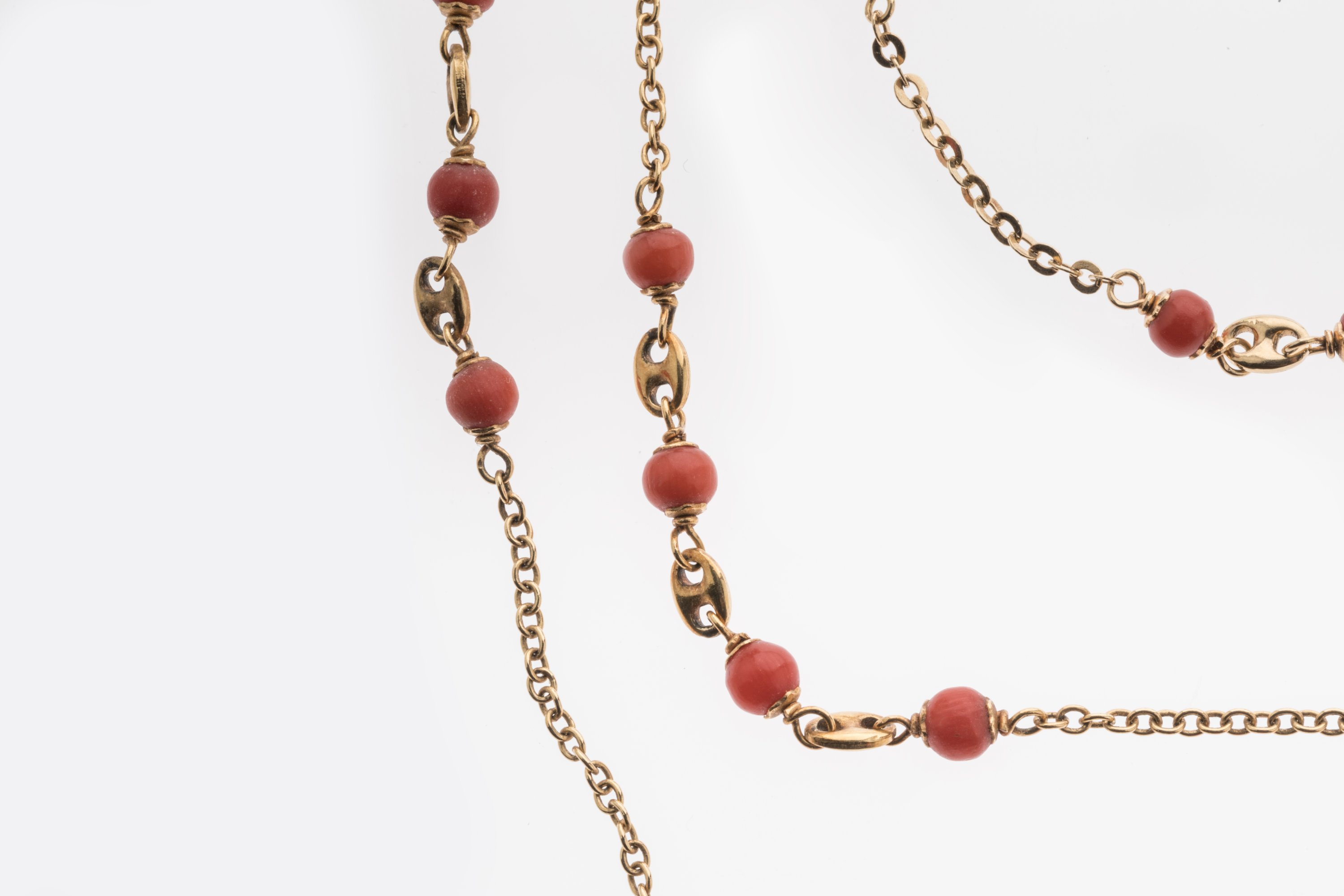 COLLIER et CHAÎNE en or jaune 750 millièmes ornée de sphères rouges et de maillons grains de cafés.