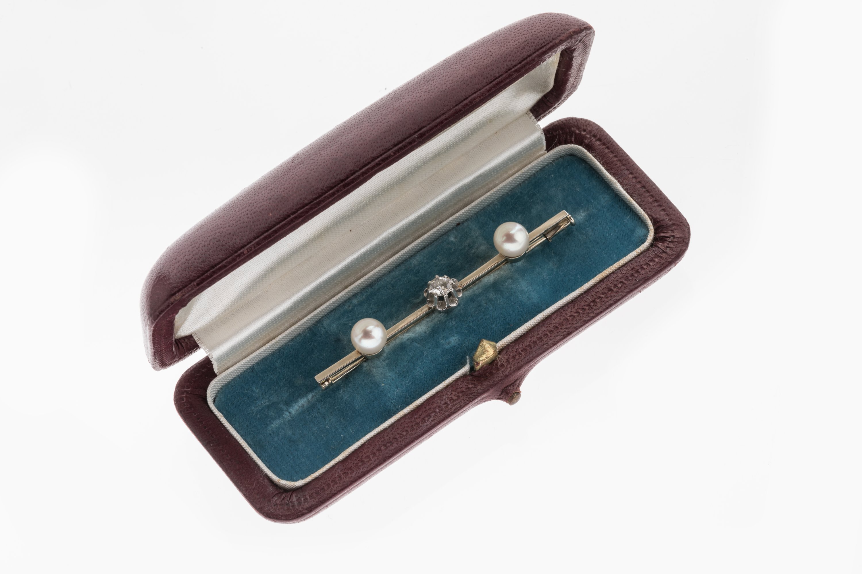 BROCHE barrette en platine ornée au centre d'un DIAMANT monté en griffes et deux perles.