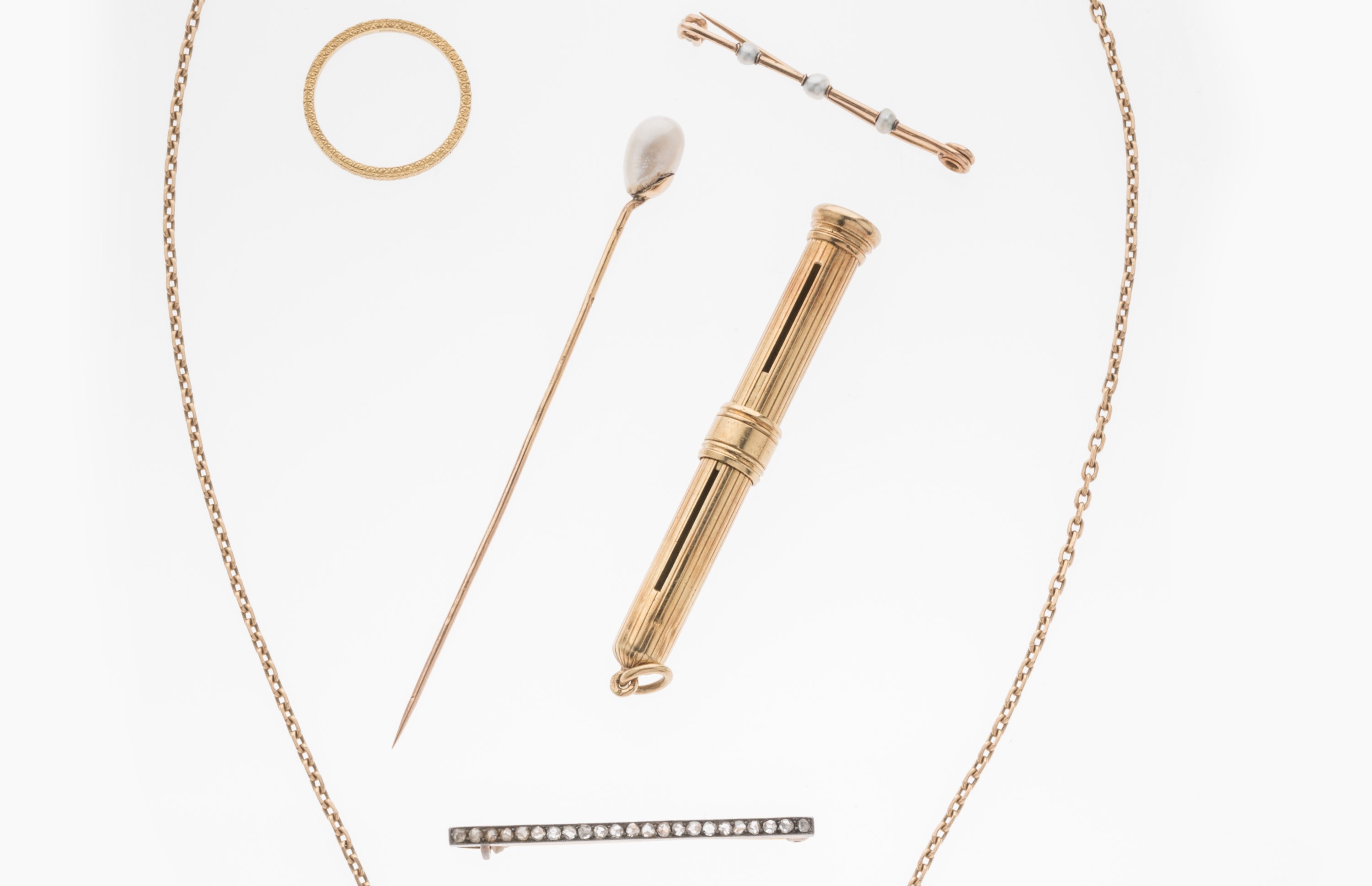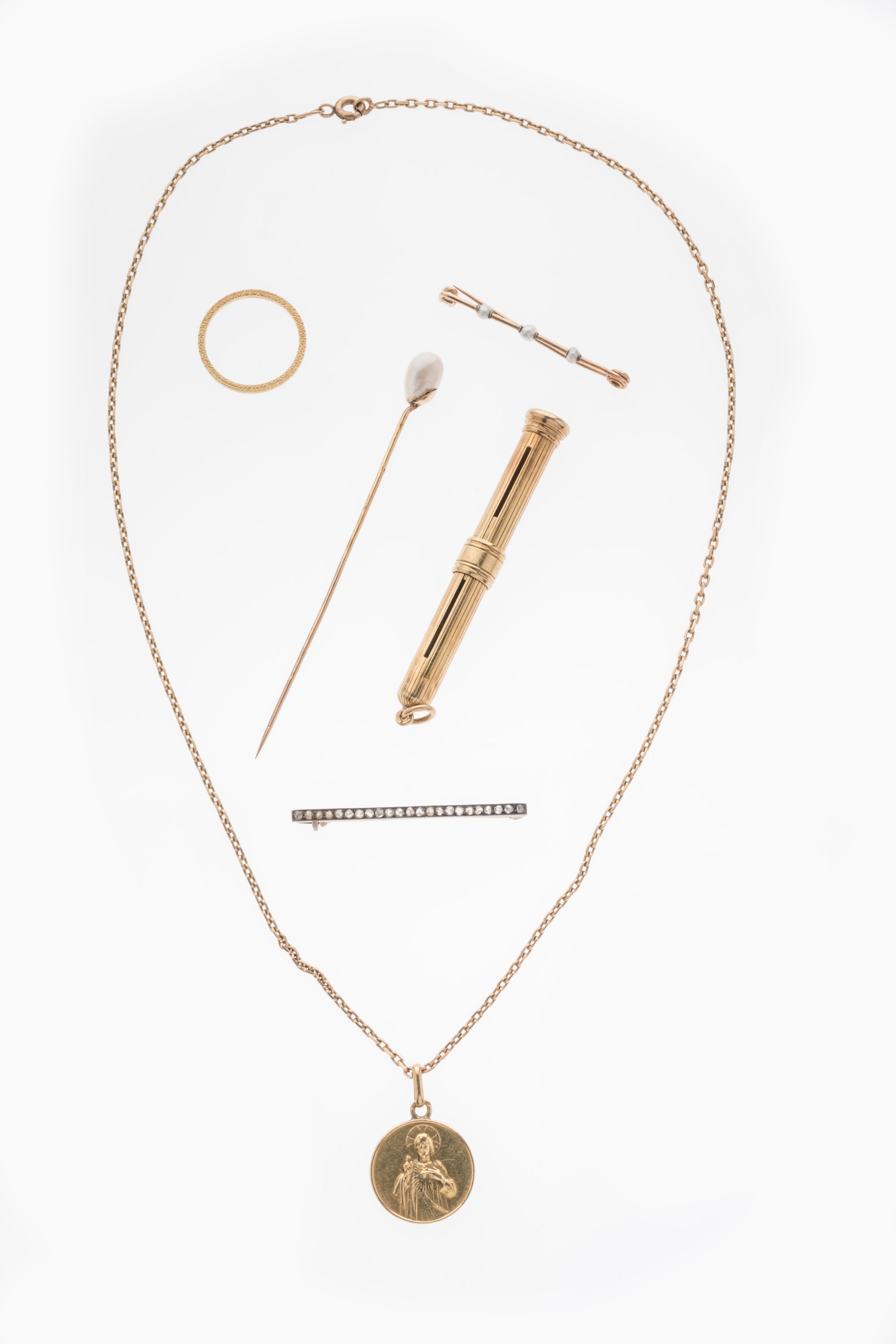 RÉUNION de bijoux en or jaune 750 millièmes comprenant : une CHAÎNE et sa MÉDAILLE, une ALLIANCE (TDD 53), une BROCHE ornée de trois petites perles de culture, une ÉPINGLE ornée d'une perle de culture, un PORTE-CRAYON (petits chocs), une BROCHE BARRETTE ornée de pierres blanches.