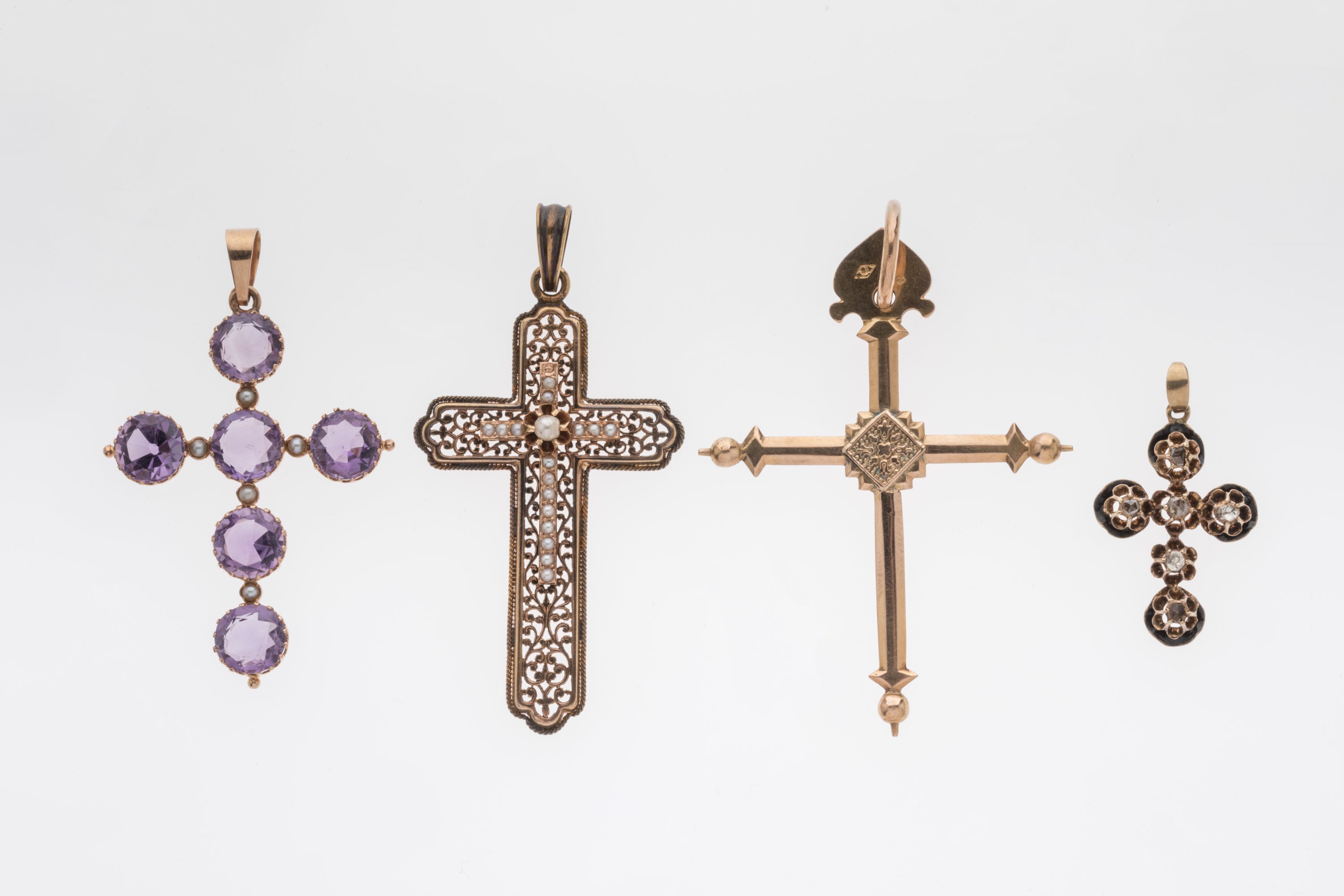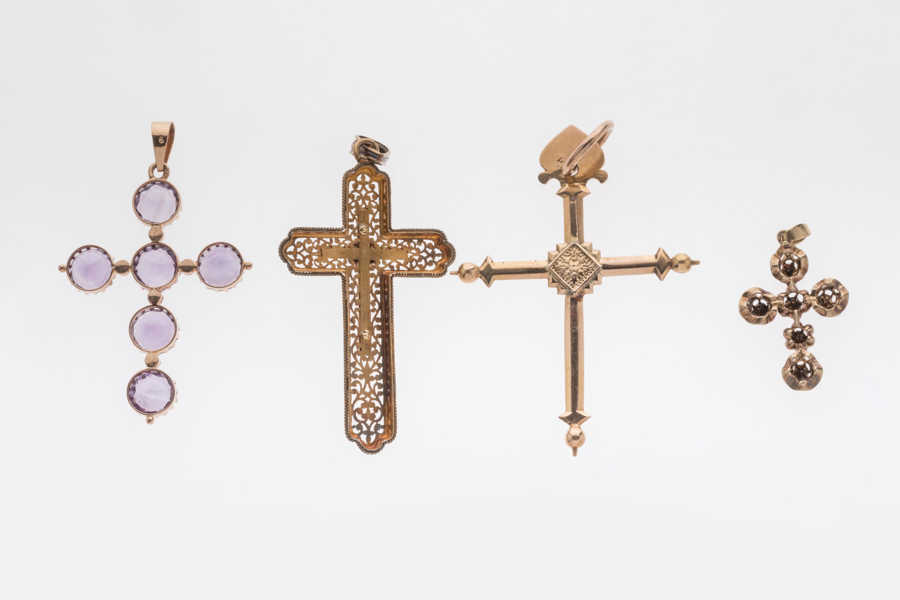 QUATRE CROIX PENDENTIFS en or jaune 750 millièmes, une ornée de petites perles, une d'AMÉTHYSTES et une troisième de six DIAMANTS.