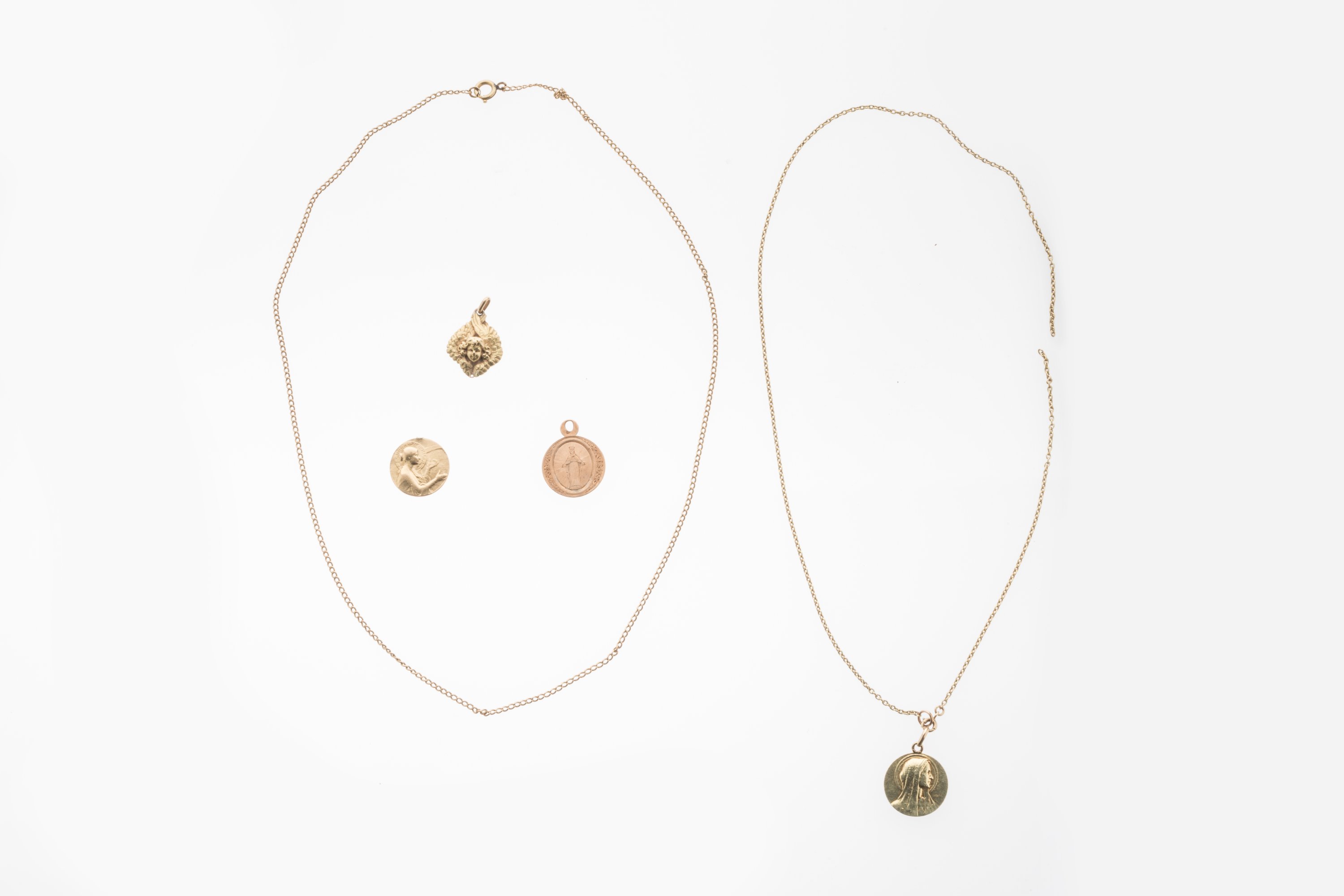 QUATRE MÉDAILLES de BAPTÈME et deux CHAINES à mailles anglaises (une accidentée) en or jaune 750 millièmes.