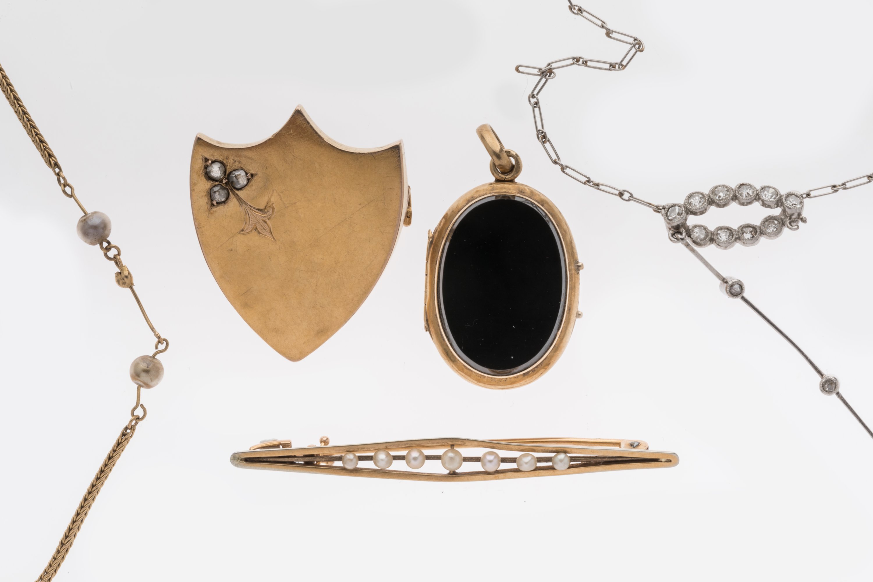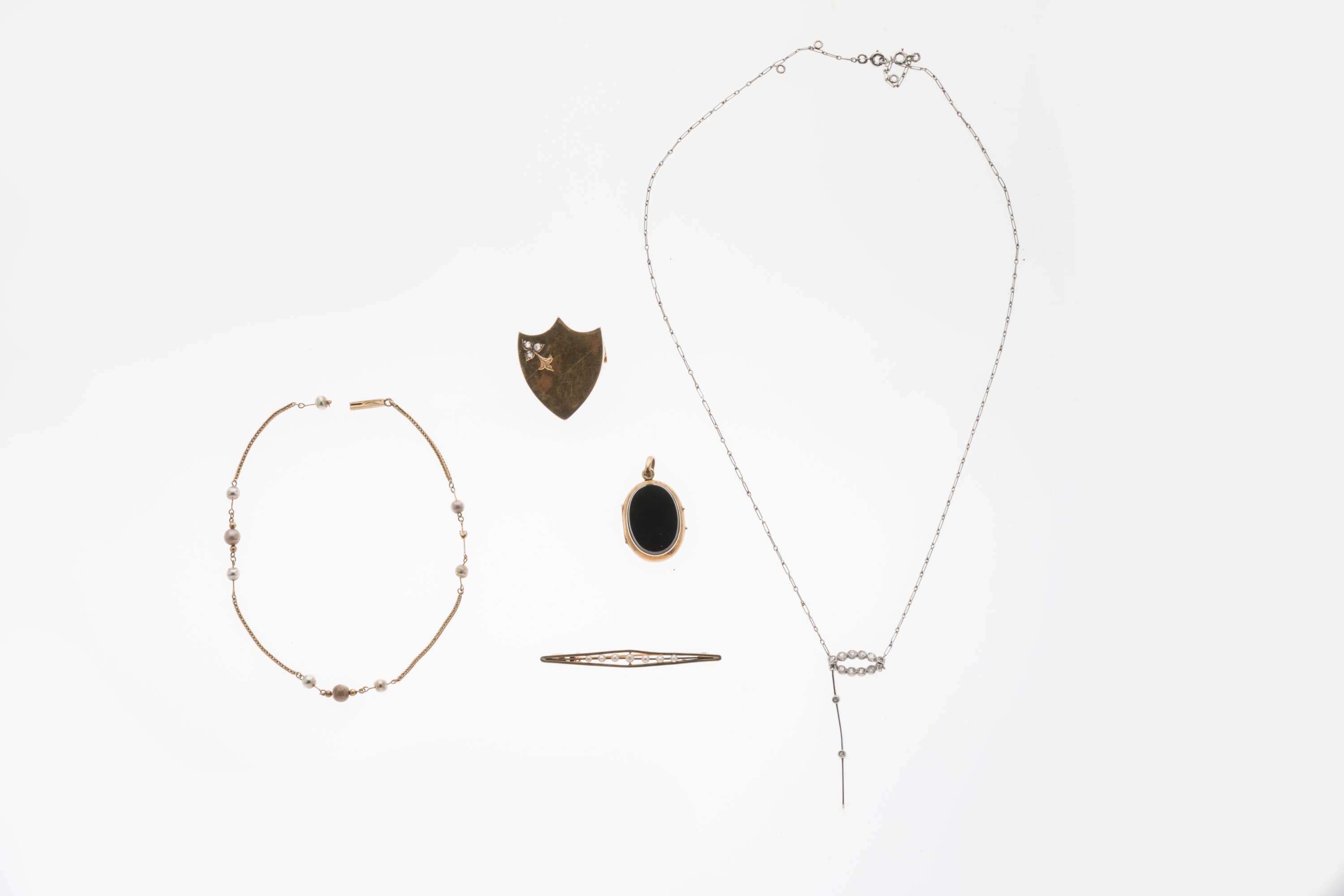 DEUX COLLIERS, UNE BARETTE, UNE BROCHE et UN PENDENTIF en or 750 millièmes, décor émaillé, petites perles ou brillant.