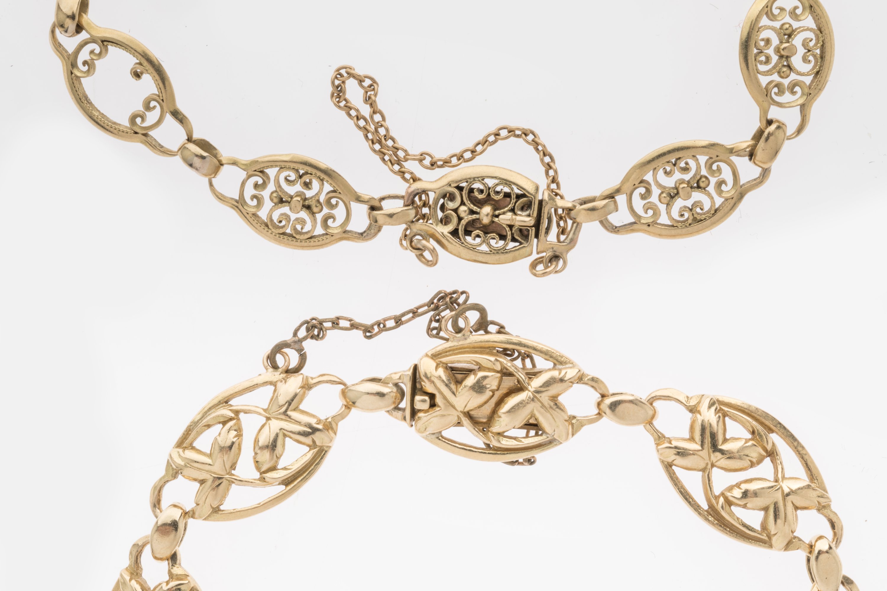 DEUX BRACELETS en or jaune 750 millièmes. Le premier orné de motifs végétaux stylisés et ajourés. Le second de médaillons ajourés d'entrelacs (un accident).