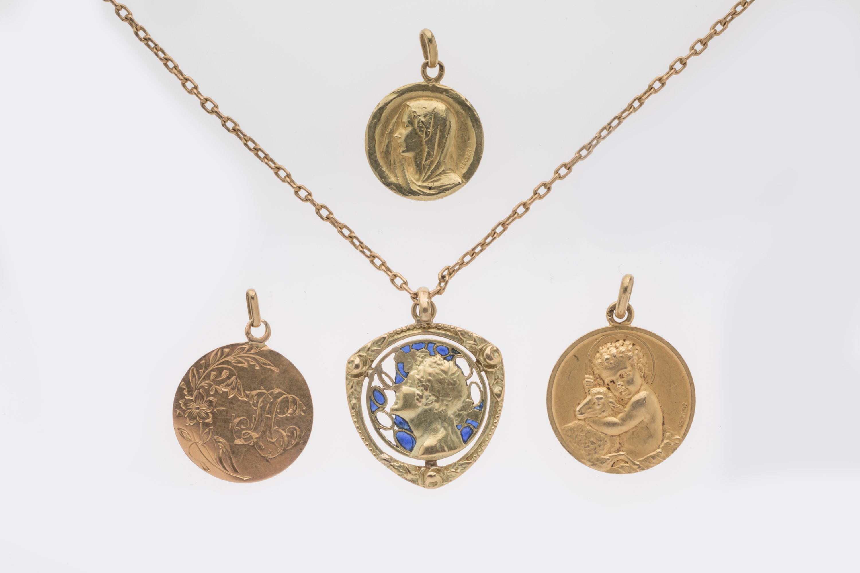 RÉUNION de QUATRE médailles en or jaune 750 millièmes, l'une émaillée bleu avec sa chaîne en or.