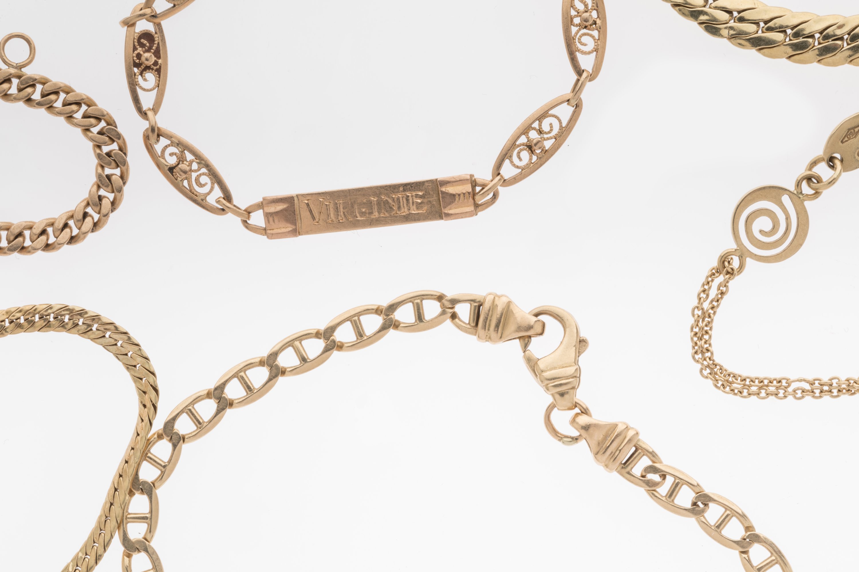 RÉUNION de six bracelets en or jaune 750 millièmes.Le plus...
