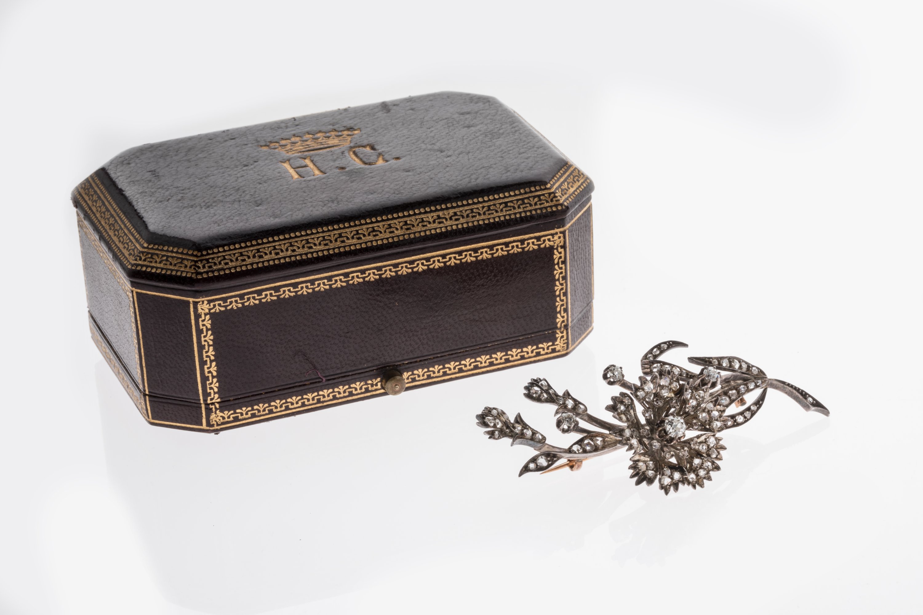 Dans son écrin de forme, monogrammé "H.G" surmonté d'une couronne comtale.
