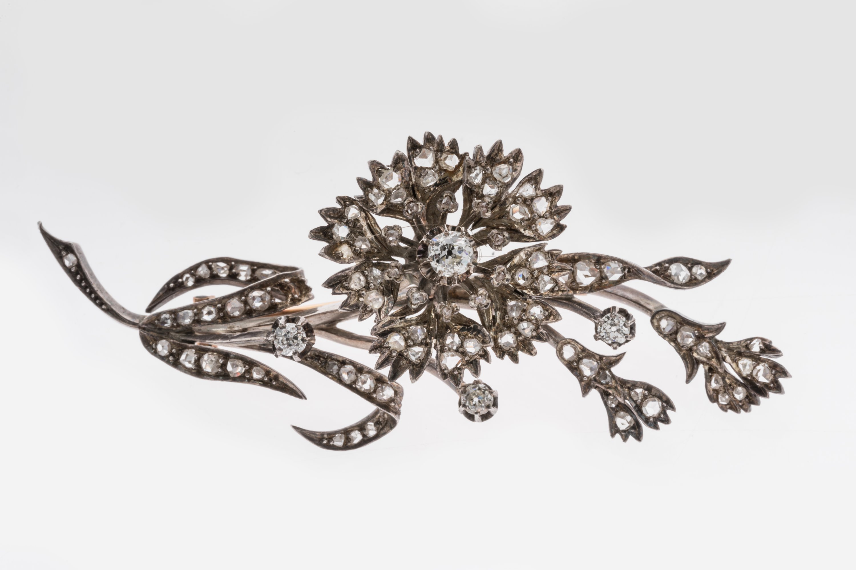 BROCHE FLEUR TREMBLEUSE en argent, ornée de DIAMANTS de taille ancienne et centrée au pistil d'un DIAMANT plus important. Épingle en or jaune 750 millièmes.