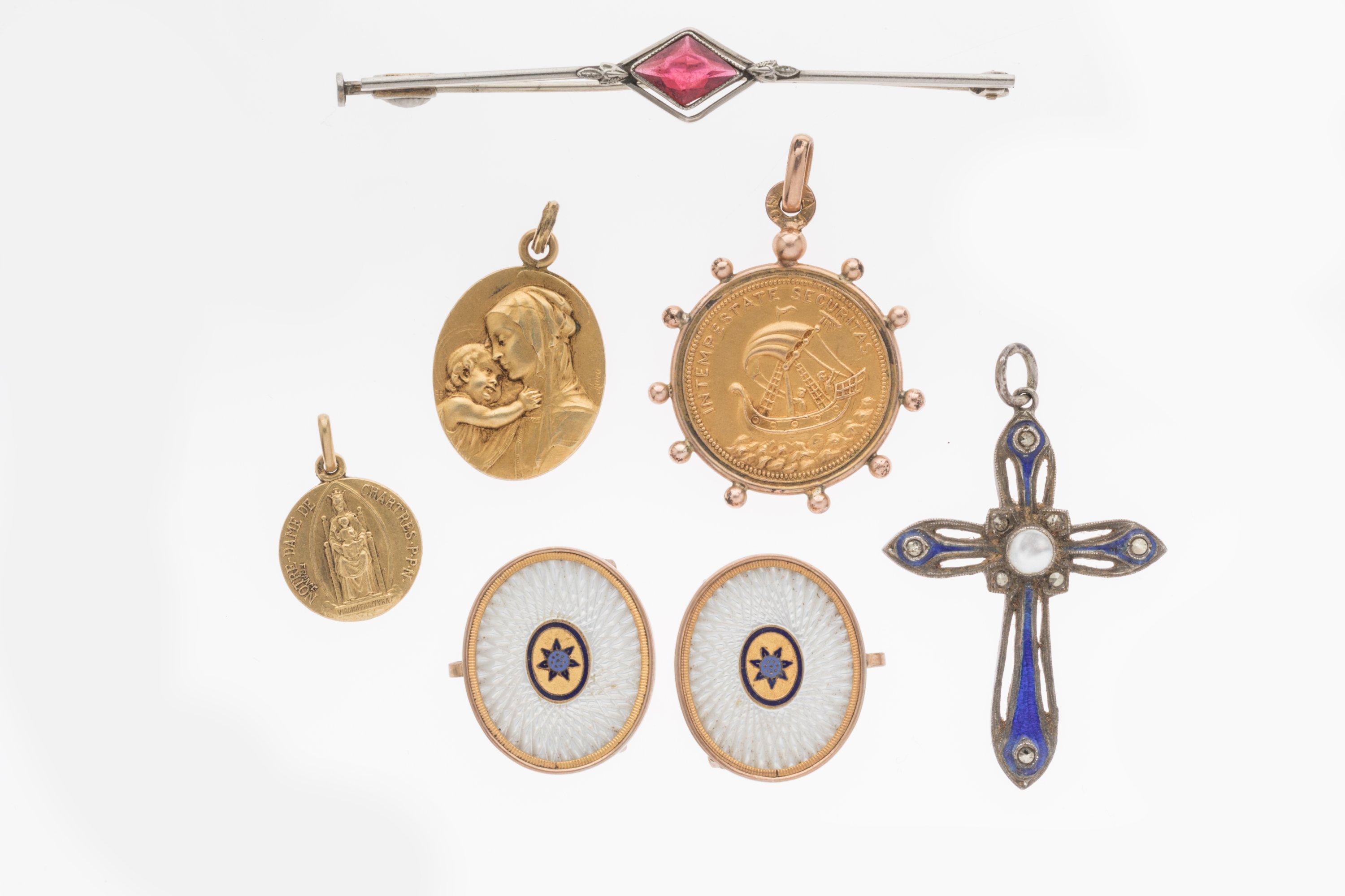 JOINT : TROIS MÉDAILLES (Vierge Marie, Saint Georges, Notre-Dame de Chartres) en métal doré, DEUX BOUTONS à l'imitation de nacre, ÉPINGLE en métal ornée d'une pierre rouge et une CROIX en métal, ornée d'un cabochon en nacre et brillants.