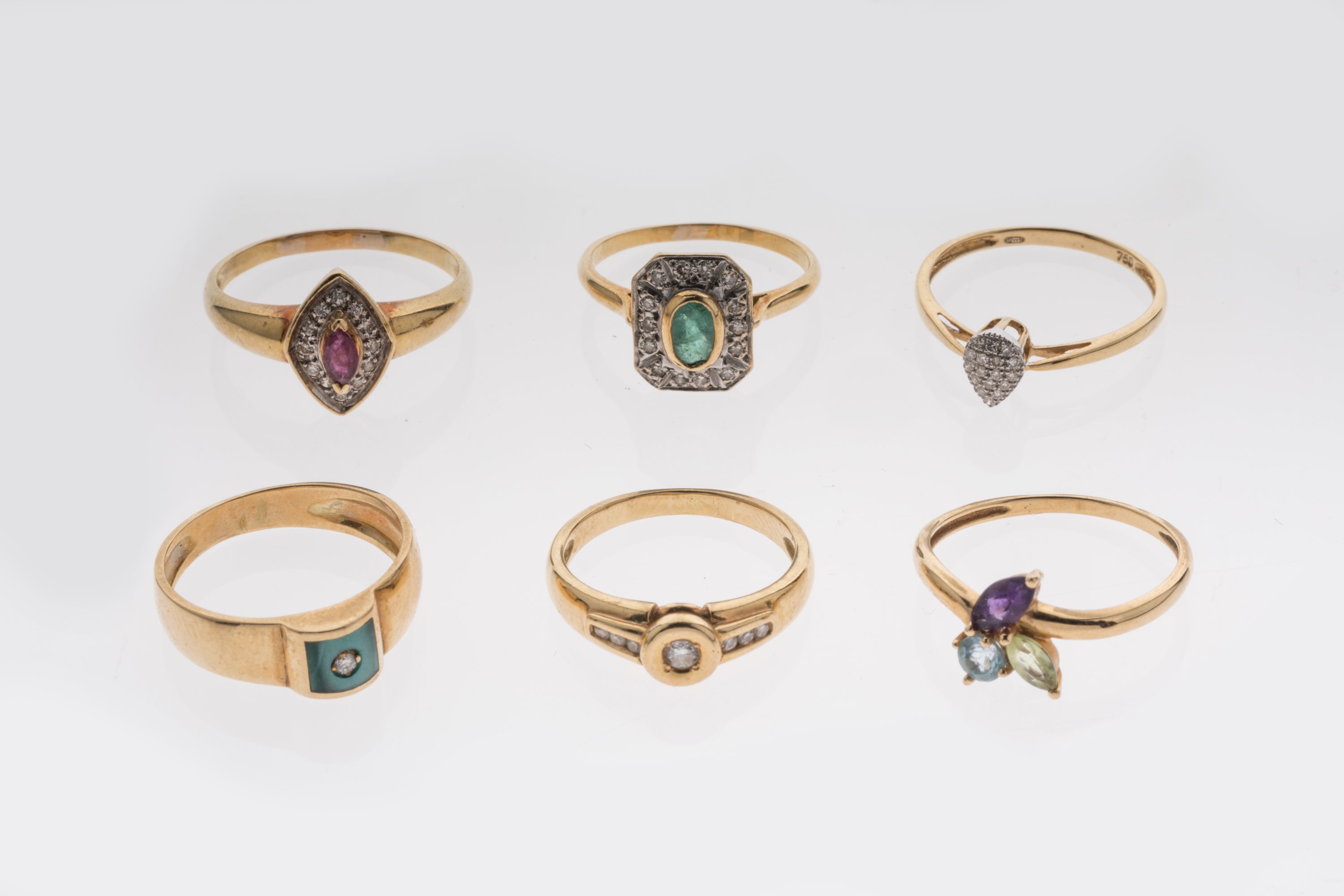 RÉUNION de SIX BAGUES en or jaune, ornées de pierres blanches et de couleurs.