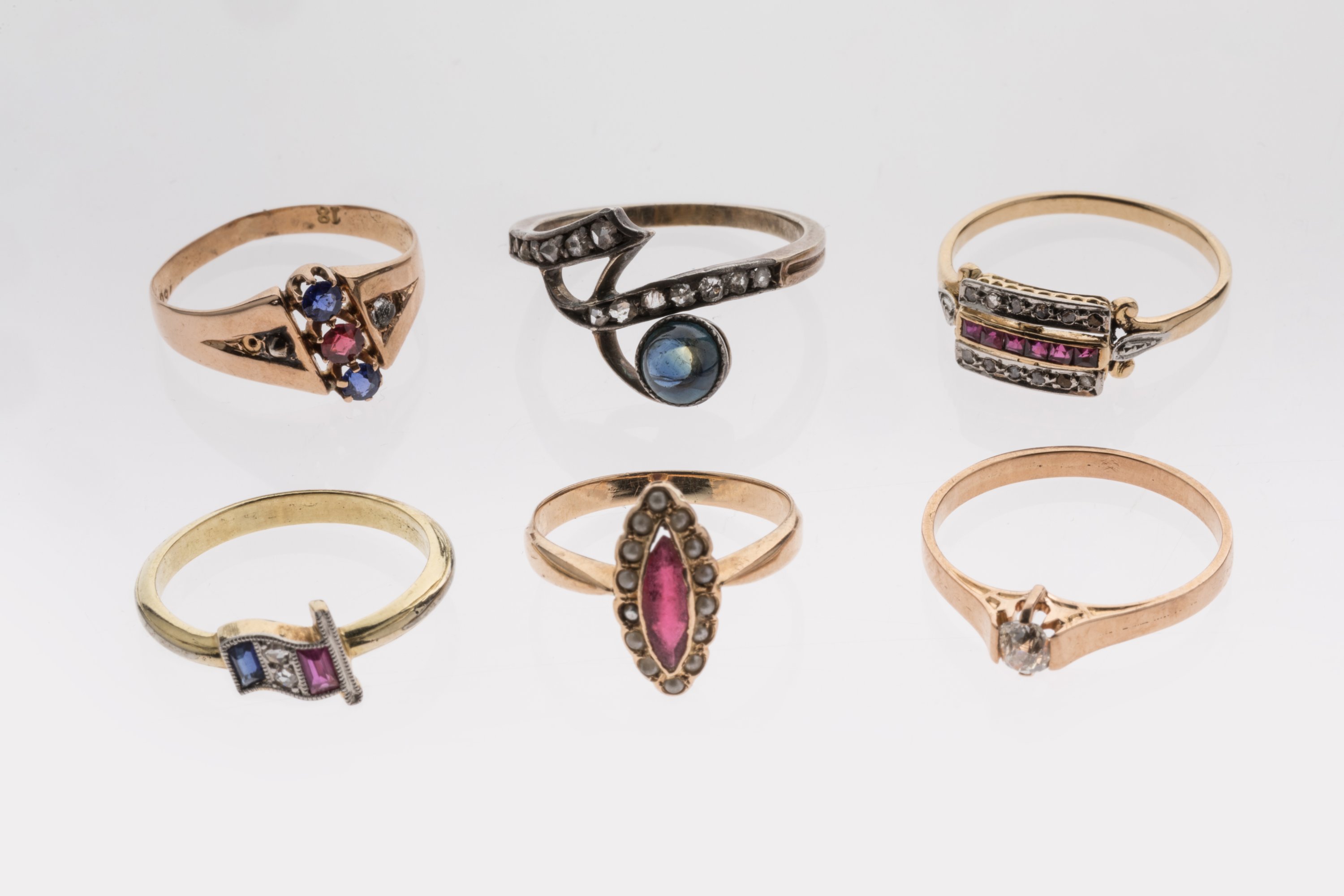 SIX BAGUES en or jaune 750 millièmes ornées de pierres blanches et de couleur :