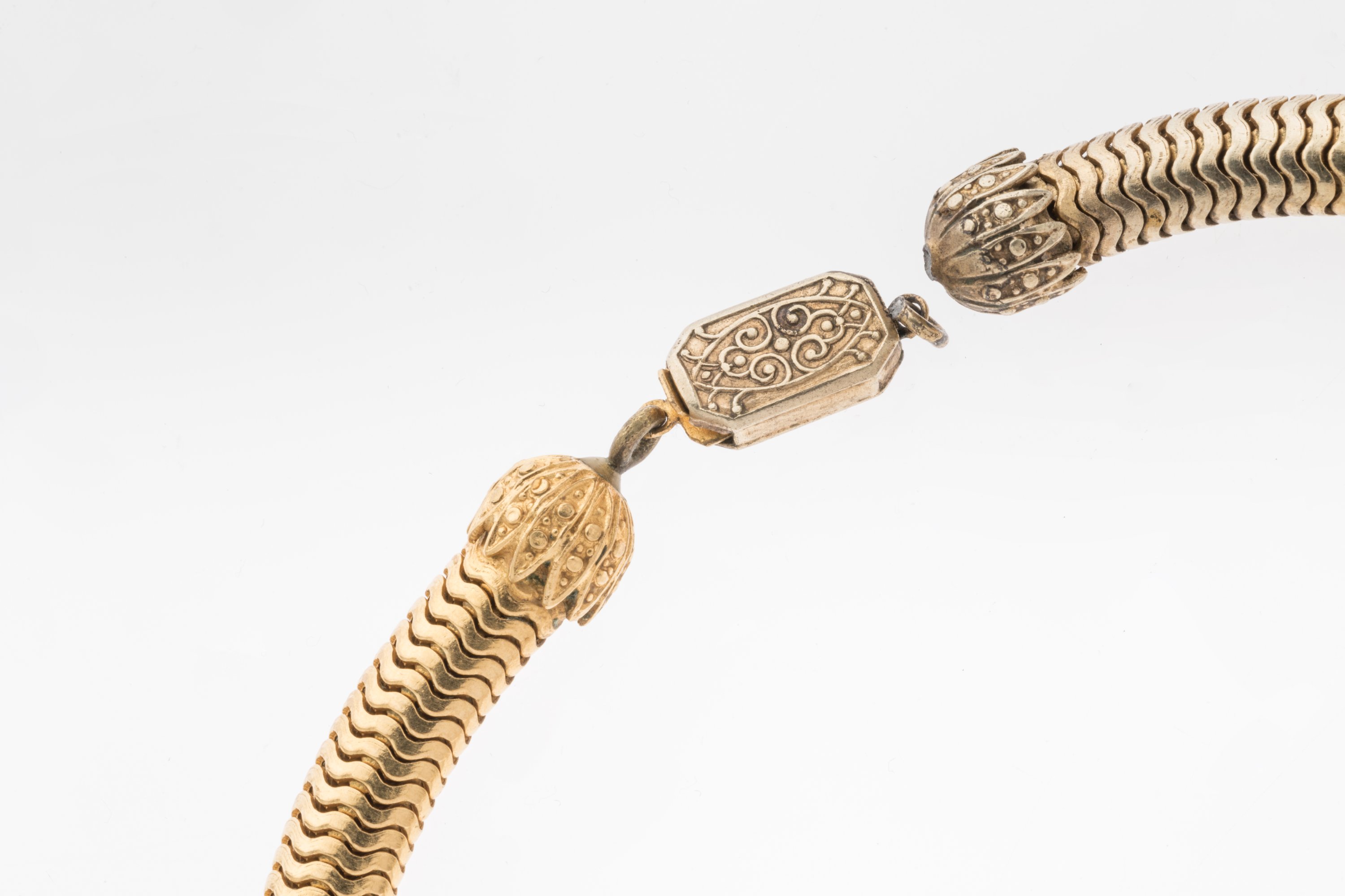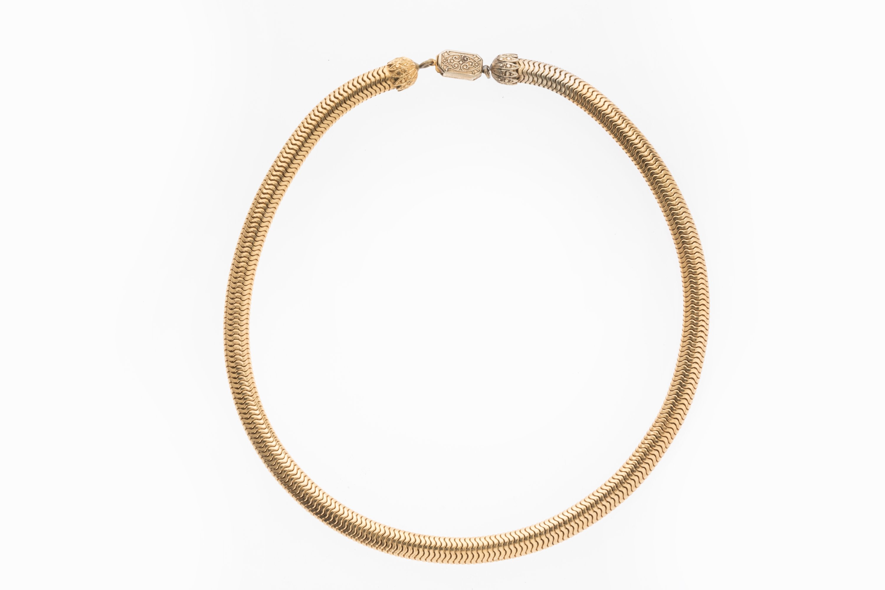 COLLIER en or jaune 375 millièmes, maille serpent. Fermoir doré (cassé).