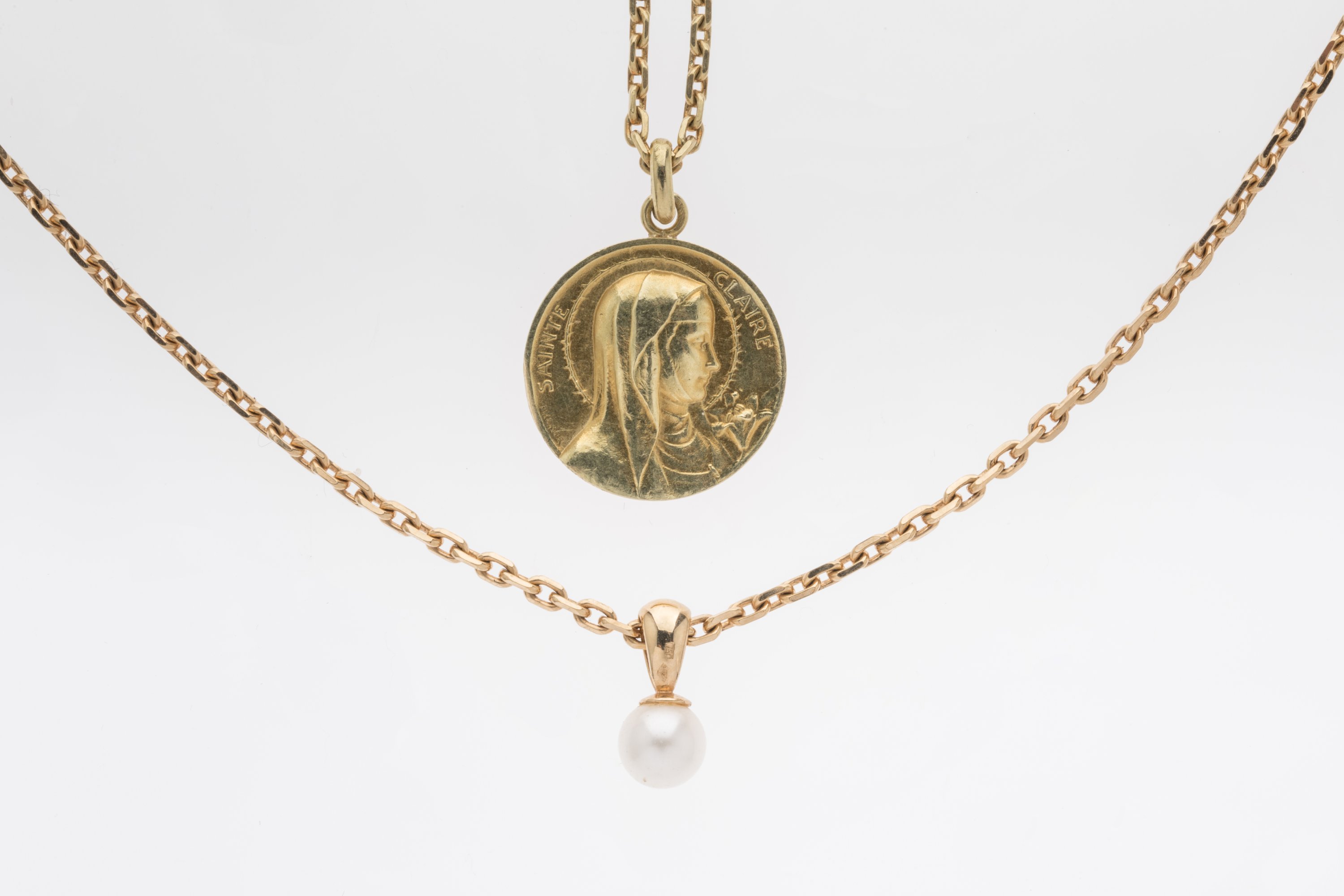 CHAÎNE, MÉDAILLE et PENDENTIF en or jaune 750 millièmes. Le pendentif se termine par une perle. La chaine est à mailles forçat. La médaille figure Sainte Claire sur l'avers et le Saint Sacrement " Paupere Domine" sur le revers.