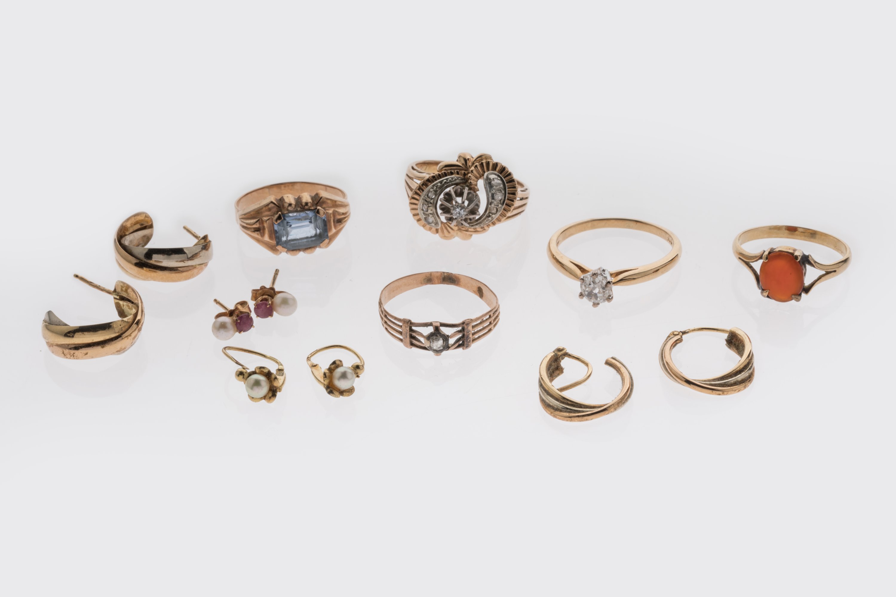 CINQ BAGUES, TROIS PAIRES de BOUCLES D'OREILLES, et une paire de CLOUS d'OREILLES en or jaune 750 millièmes. Trois sont surmontées d'un DIAMANT, la quatrième est ornée d'une AIGUE-MARINE en taille émeraude, la cinquième est ornée d'une pierre orange en taille cabochon.