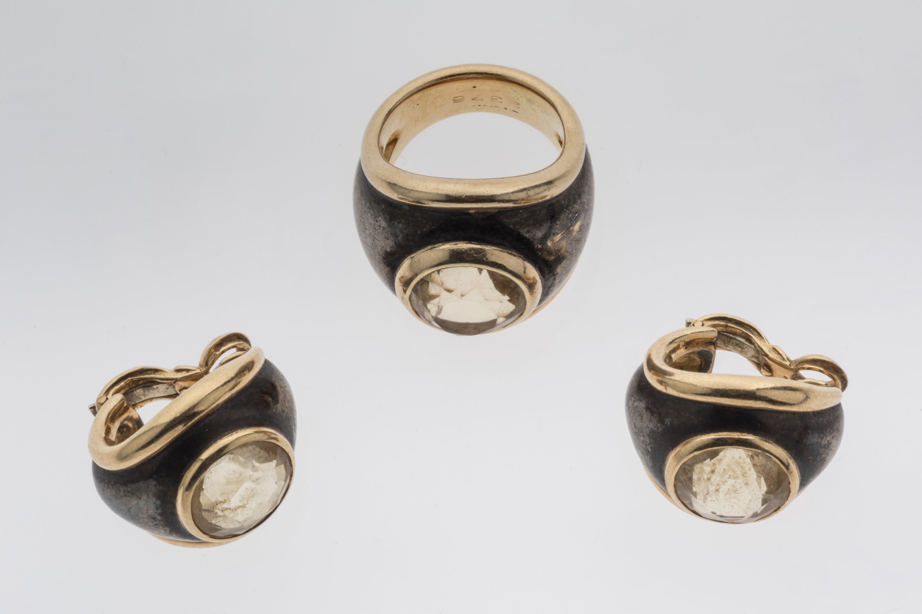 PARURE aux CITRINES (?) en or jaune 750 millièmes et patine noire, composée d'une BAGUE et d'une PAIRE DE CLIPS.