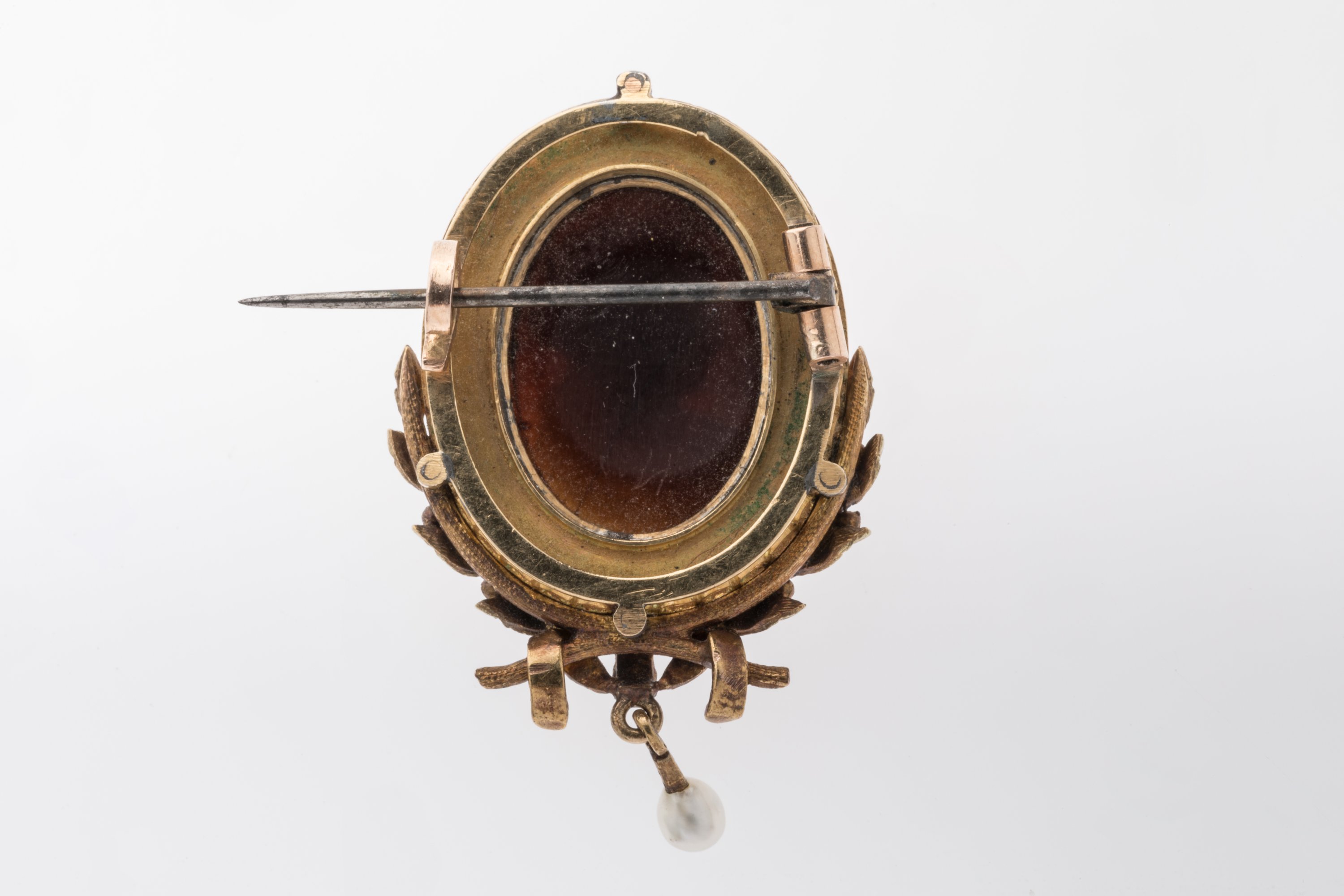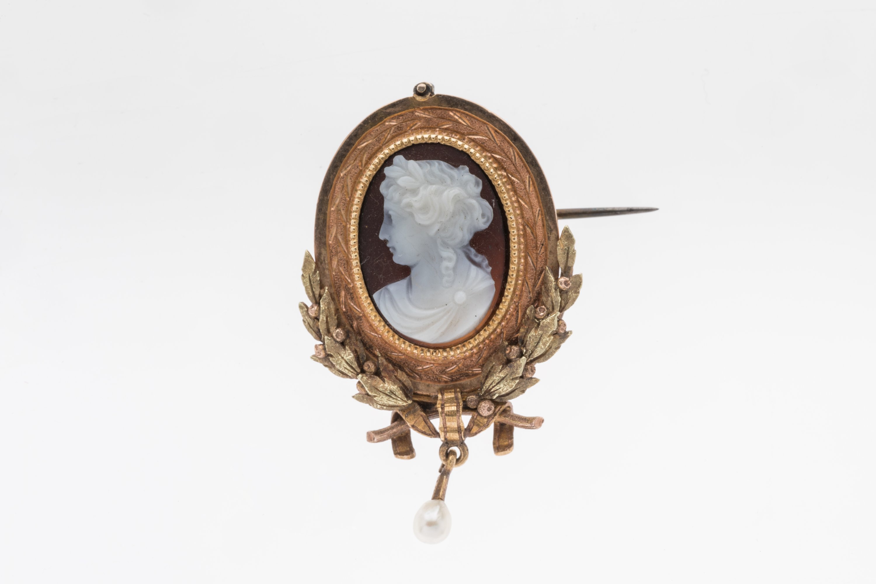 BROCHE en or jaune 750 millièmes à décor de gerbes de lauriers fleuris, ornée d'un CAMÉE pierre ou verre à profil de romaine et d'une pendeloque à semences de perles.