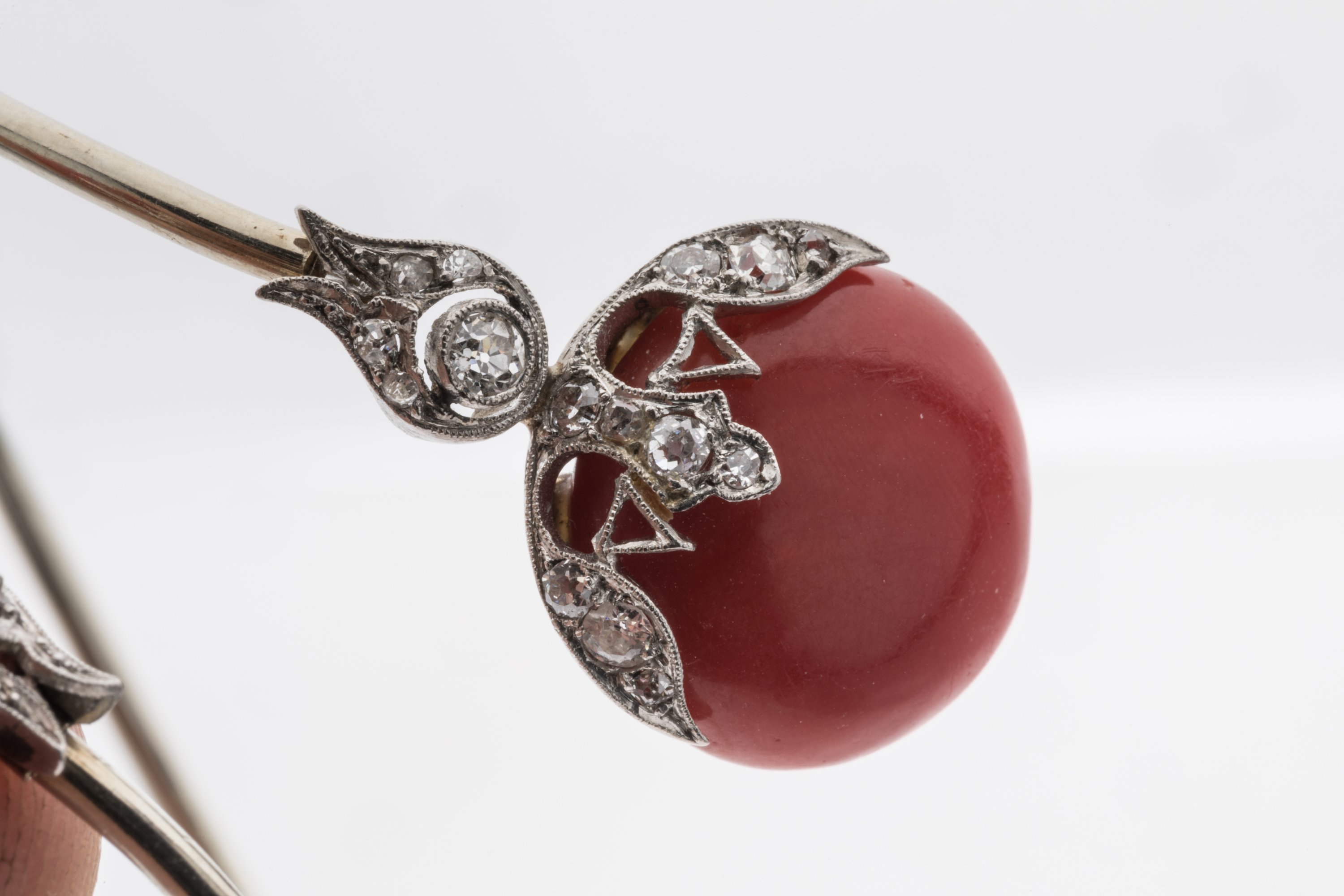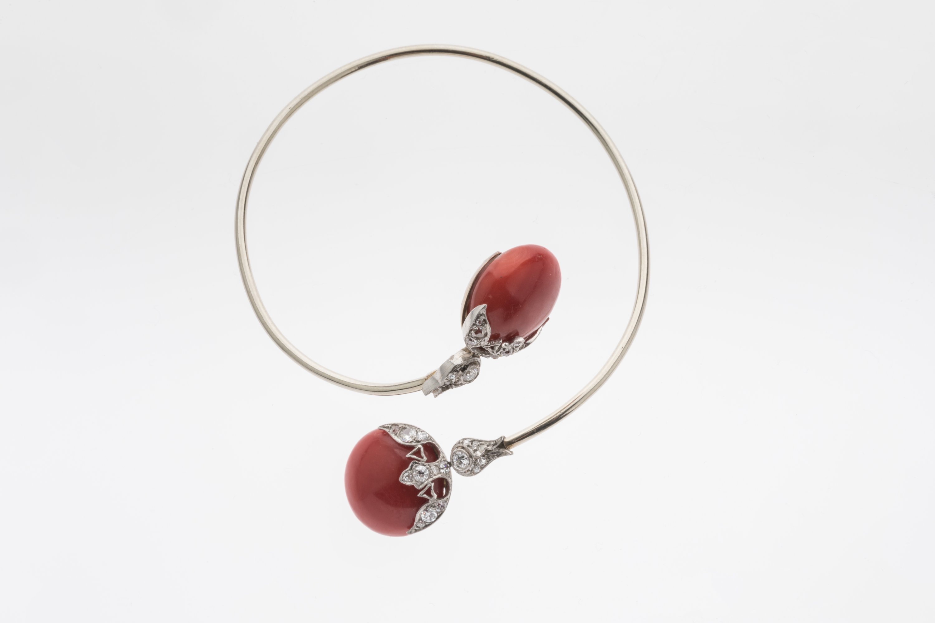 BRACELET JONC en or blanc 750 millièmes orné de deux coraux taillés en perle et huit DIAMANTS d'env. 0,7 ct dans un entourage de petits diamants.