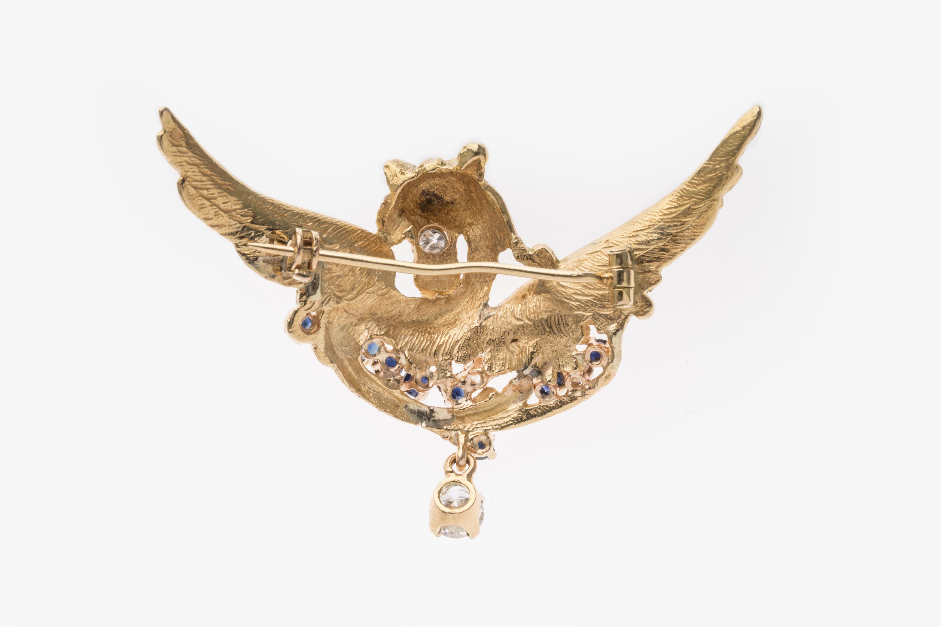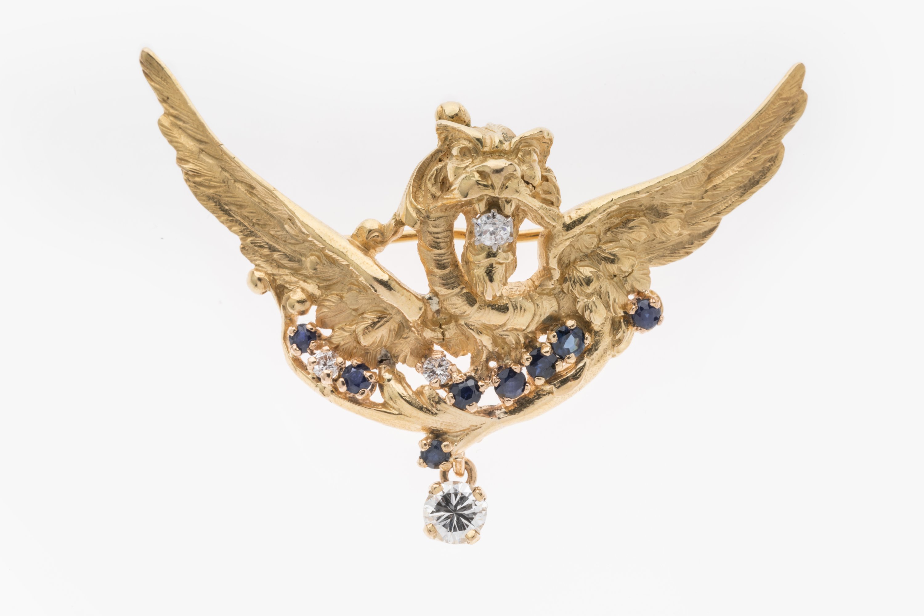 BROCHE AU DRAGON en or jaune 750 millièmes ornée de quatre DIAMANTS, le plus important d'environ 0,2 g et sept petits SAPHIRS.