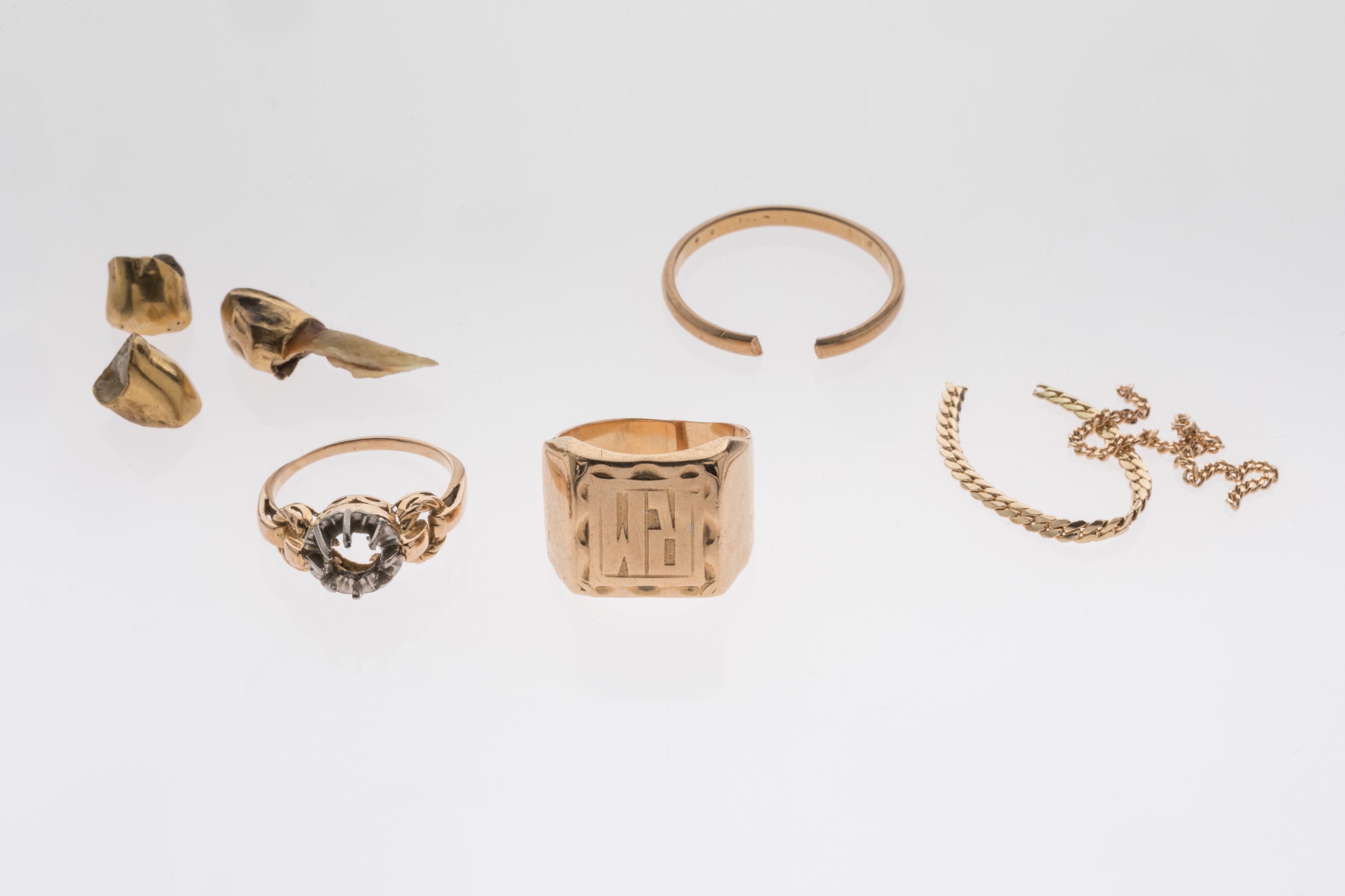 DÉBRIS D'OR jaune 750 millièmes : chevalière, maillons de chaînes, dents, alliance et monture de bague (et argent).