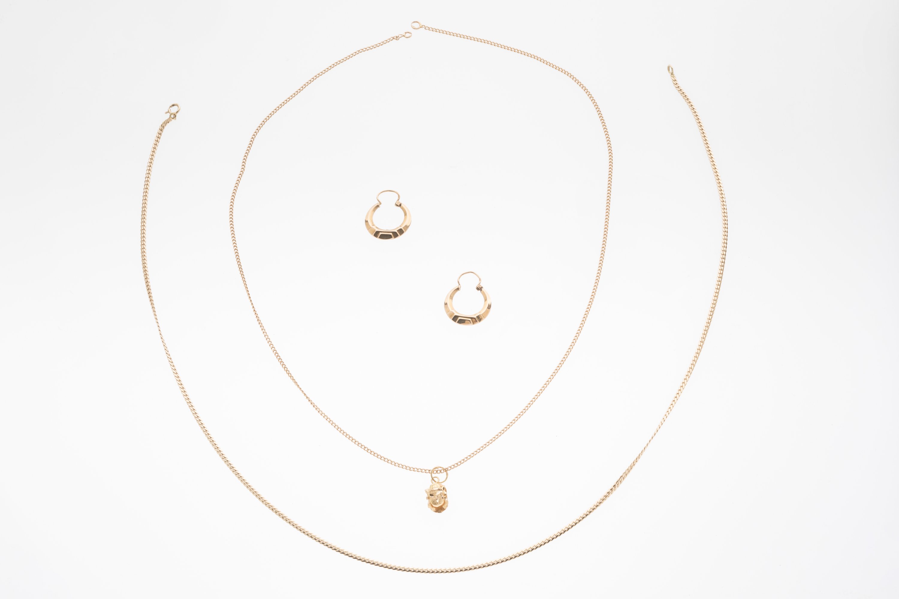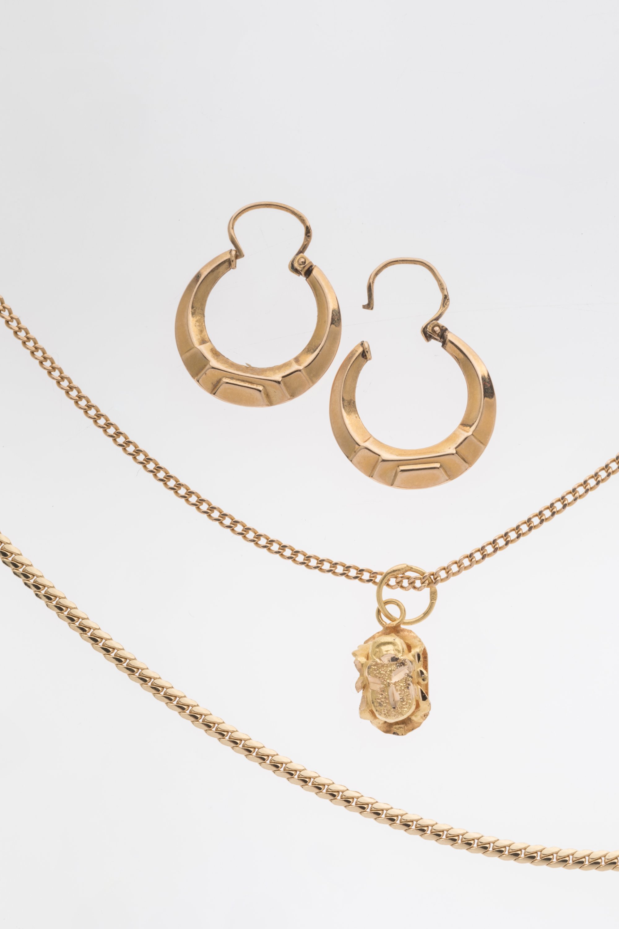 PAIRE de BOUCLES d'OREILLES CRÉOLES, CHAÎNE à mailles gourmettes (manque le fermoir) et PENDENTIF AU SCARABÉE en or jaune 750 millièmes.