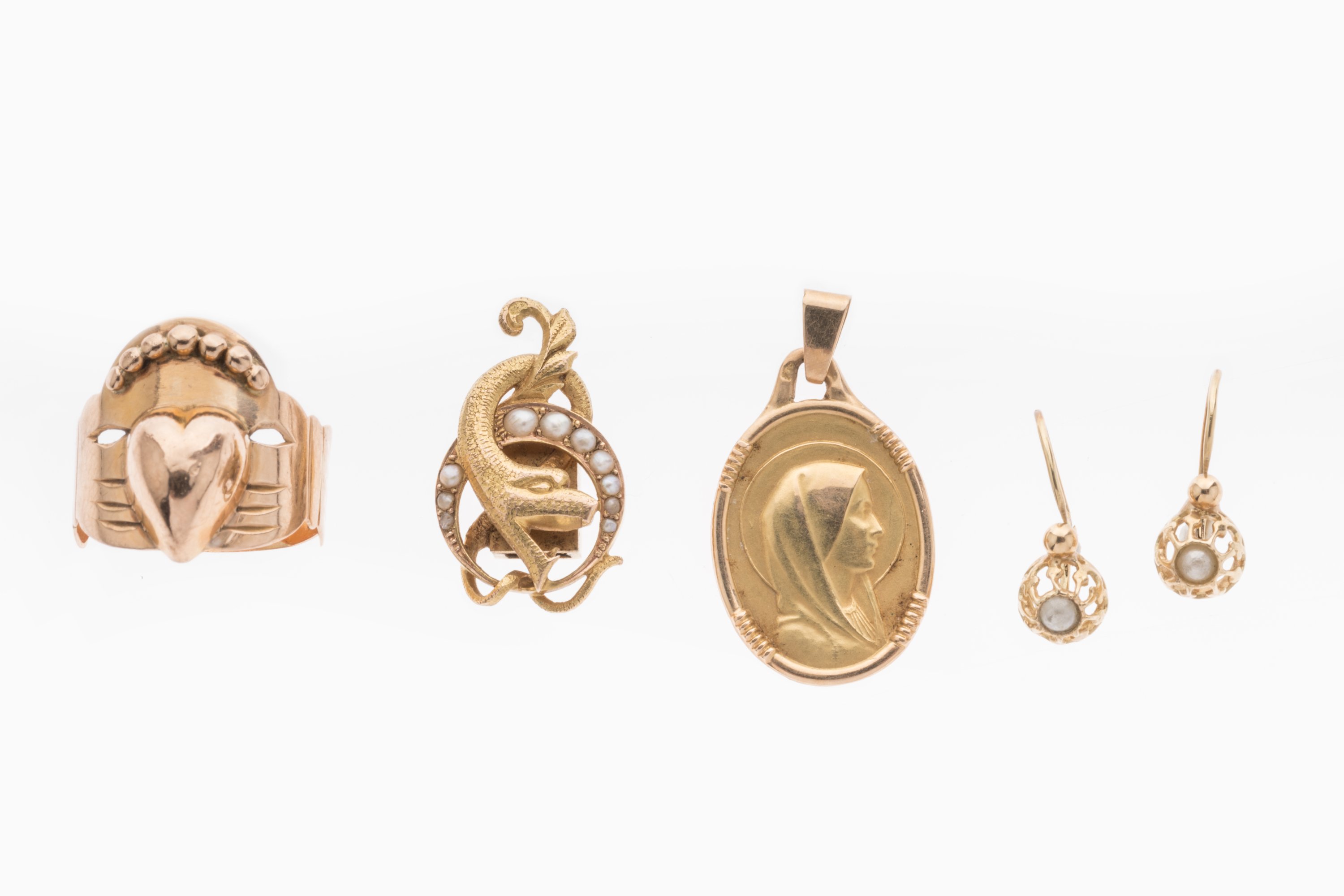 BAGUE DE FIANÇAILLES DITE FOI COEUR EN BRETAGNE en or jaune 750 millièmes ornée d'un couronne de sept sphères surmontant un cur (TDD 46. Poids 2,3 g), UNE MÉDAILLE DE LA VIERGE en or jaune 750 millièmes de forme ovale non gravée (Haut. 17 mm. Poids 1,1 g), UNE PAIRE DE BOUCLES D'OREILLES DORMEUSE en or jaune 750 millièmes ornées de perles (Poids brut 0,9 g) et UN ÉLÉMENT DE BIJOUX À COMBINAISON en or jaune 750 millièmes ornés de perles (poids brut 2,2 g).