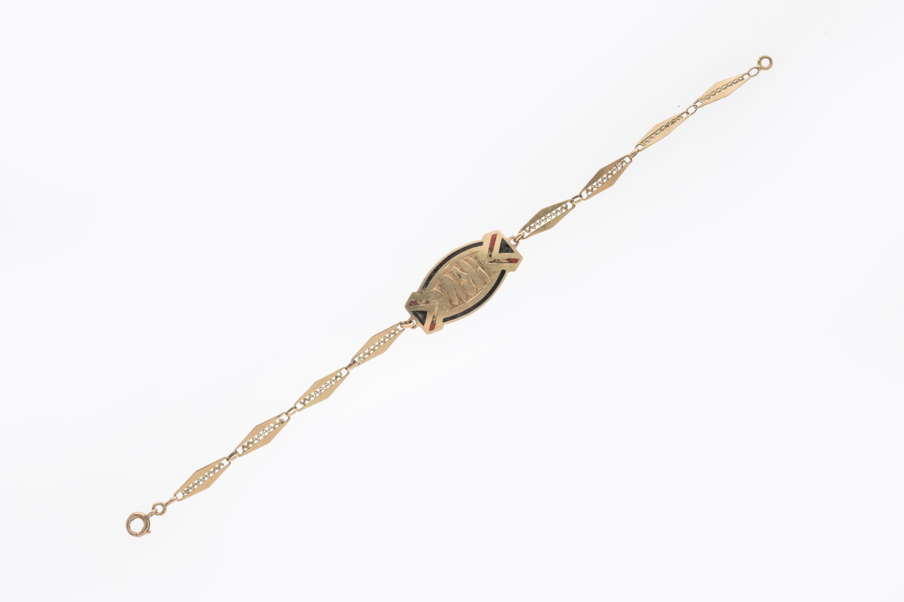 BRACELET vers 1916 en or jaune 750 millièmes à huit maillons losangiques entourant le prénom LEA dans un cartouche émaillé.