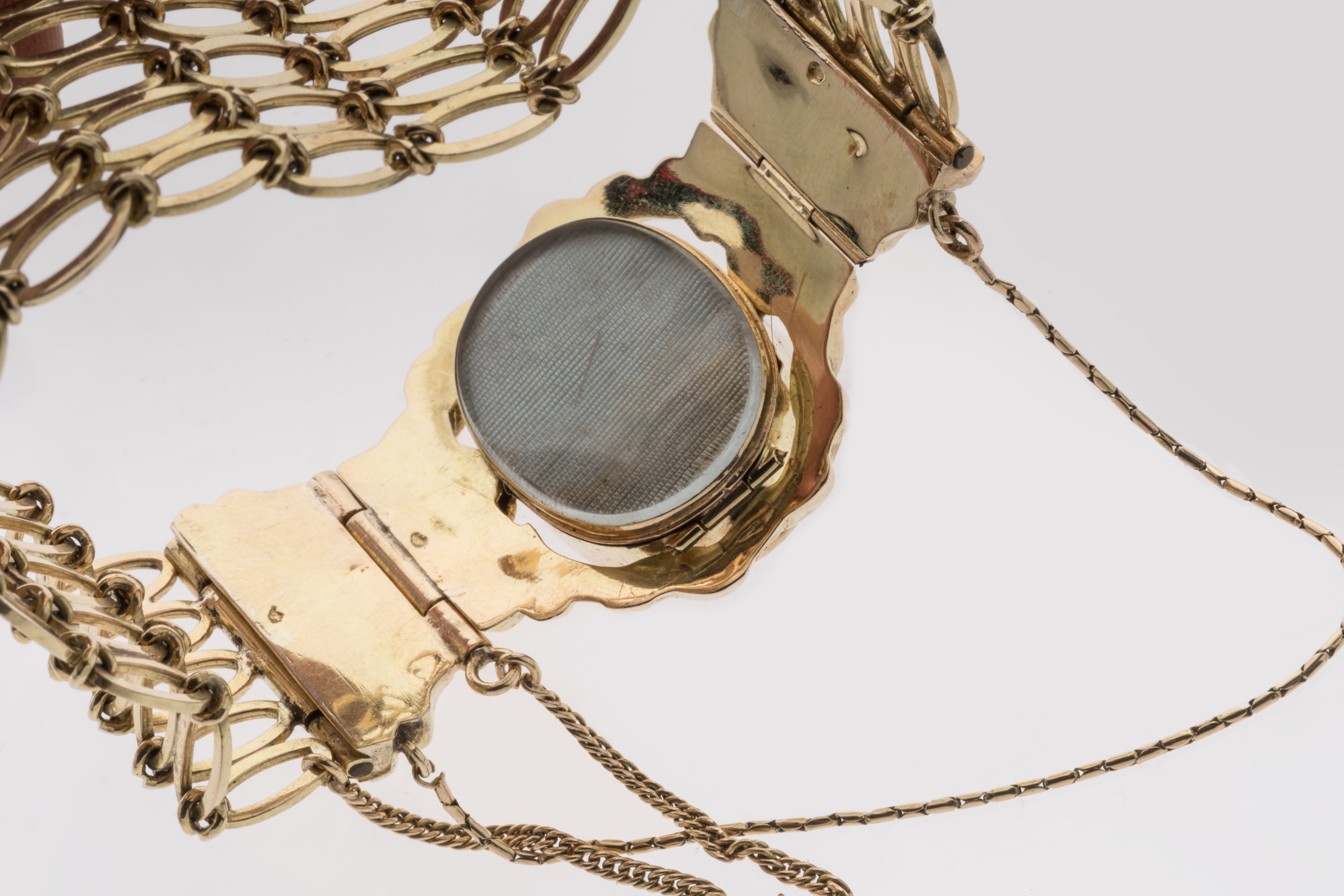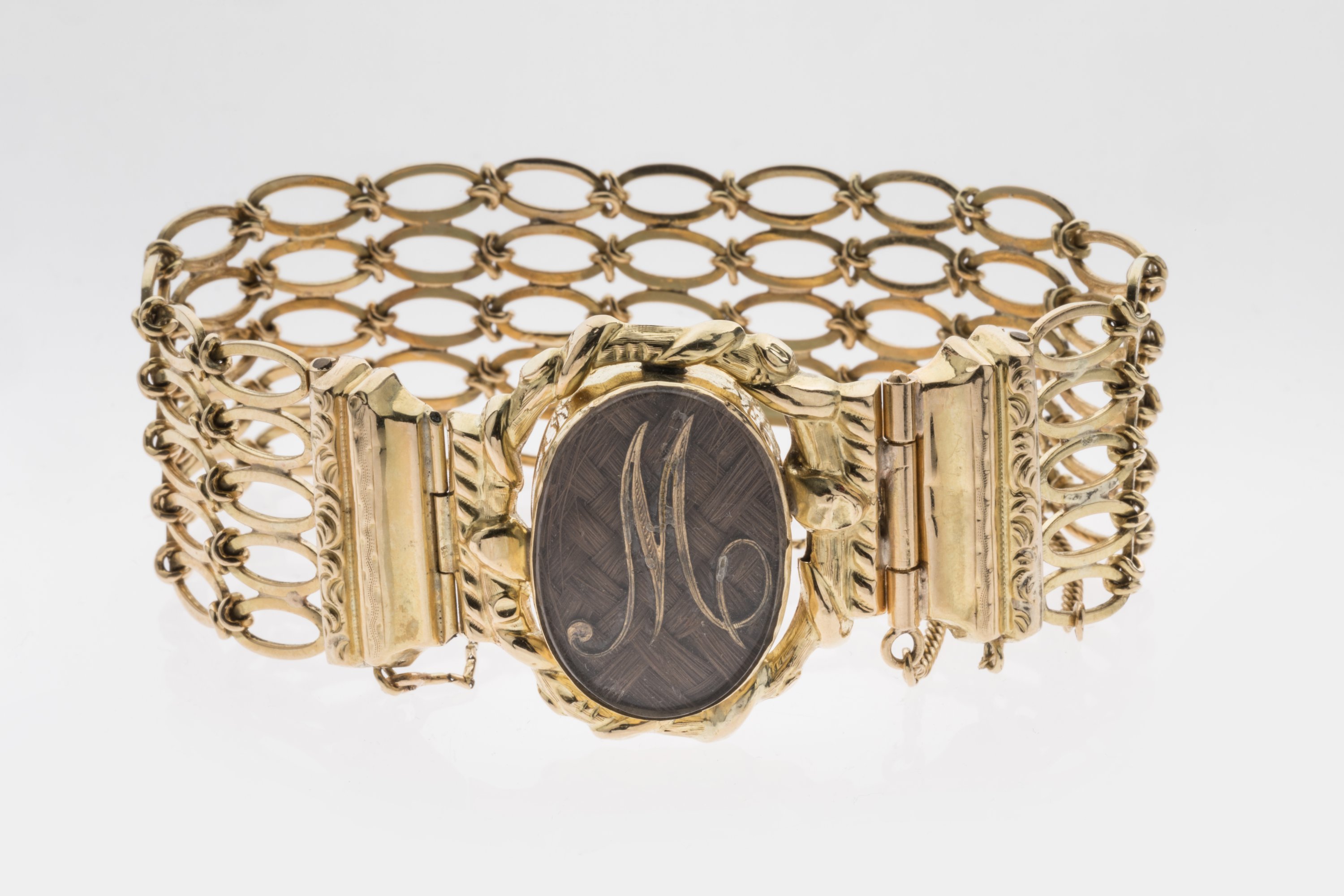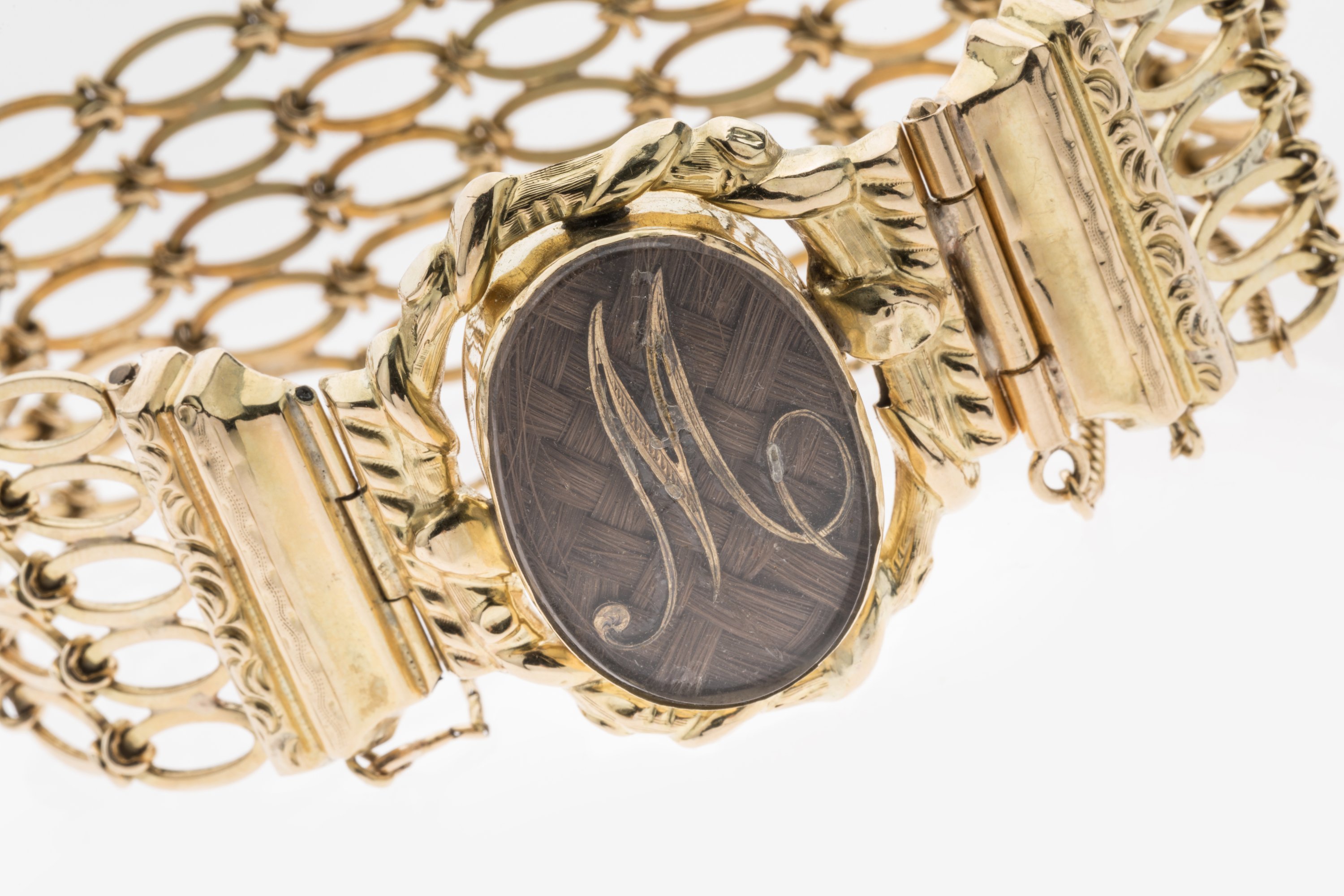 BRACELET en or jaune 750 millièmes dont le fermoir est un médaillon renfermant un monogramme "M" en or sur fond à décor de cheveux tressés.
