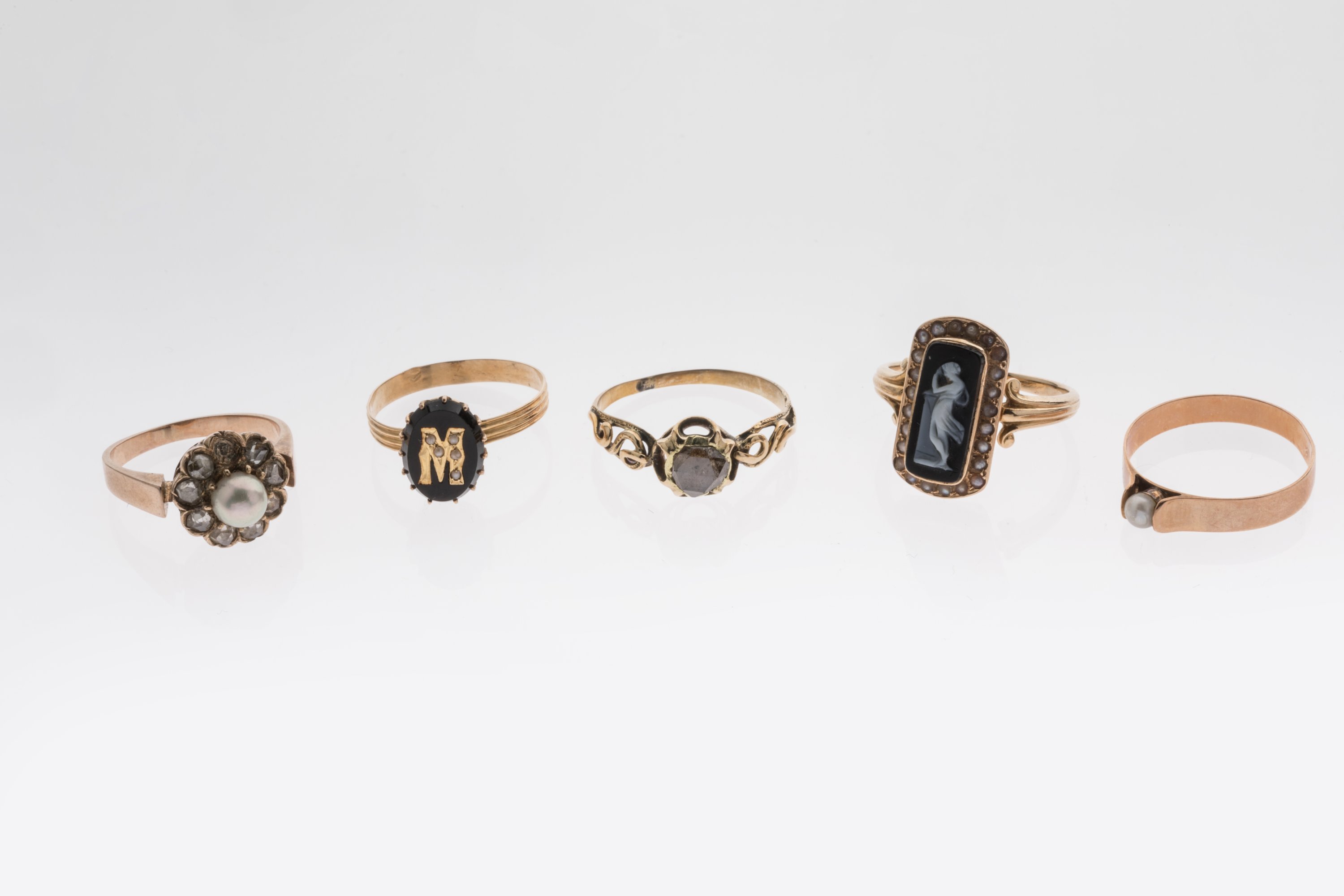 CINQ BAGUES en or jaune 750 millièmes ornées d'une perle de culture entourée de DIAMANTS (dont un manquant), d'un camée coquille noir en taille baguette figurant un femme au pilastre, l'ensemble entouré de petites perles de culture, d'un monogramme "M" doré et perlé sur pierre noire, d'une perle de culture, d'un DIAMANT sur griffe ajourée.