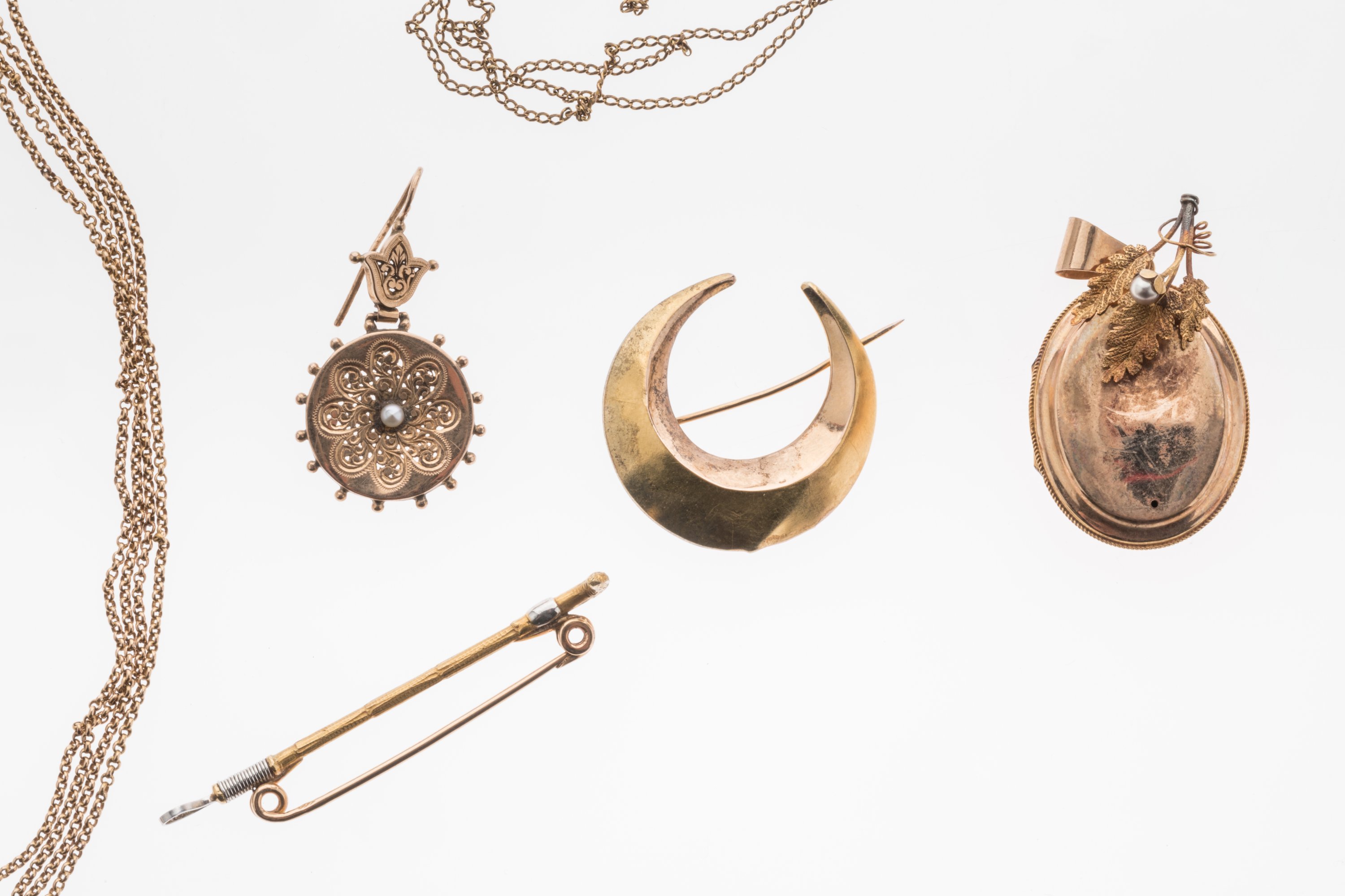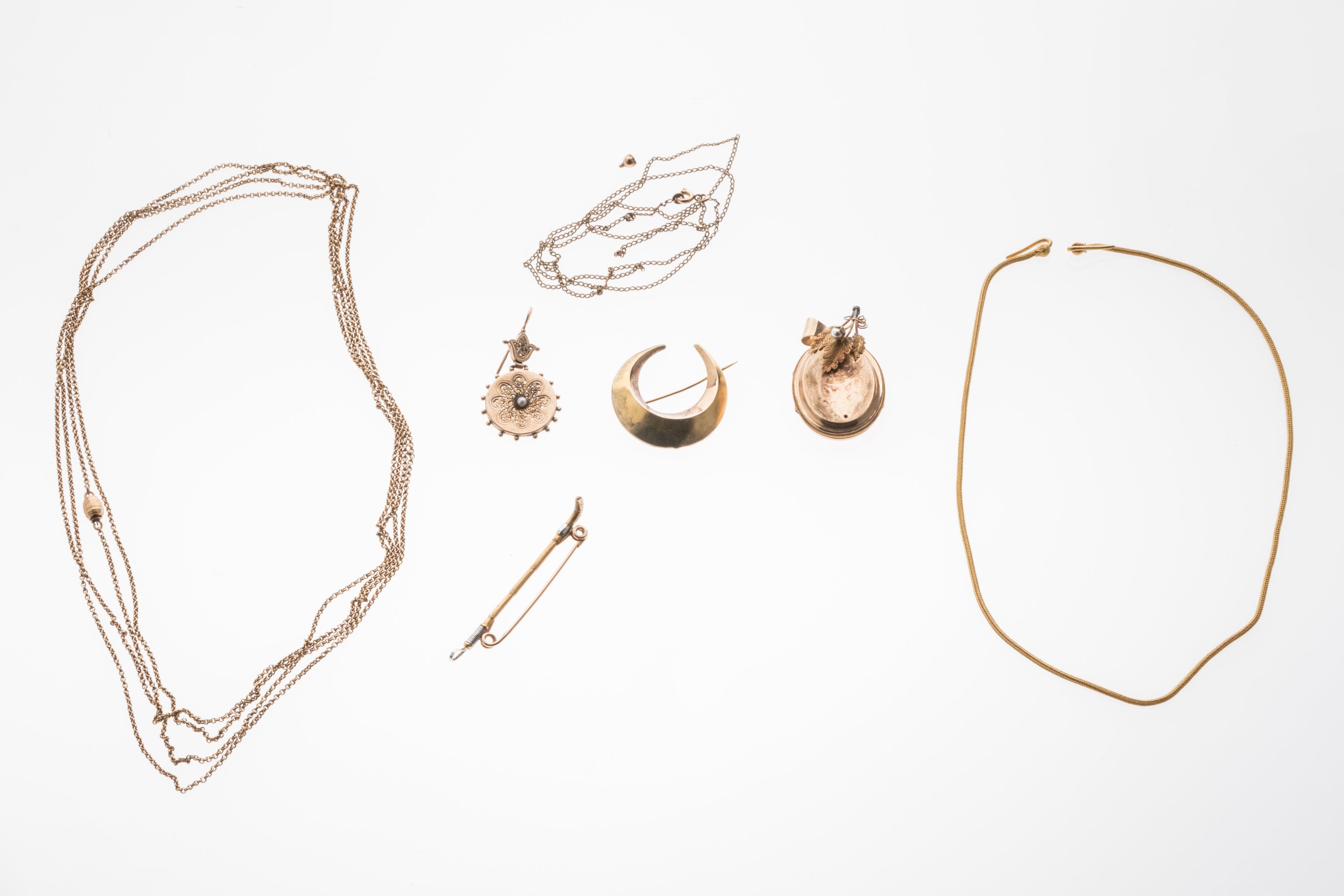 Trois CHAÎNES, un MÉDAILLON, deux BROCHES, une BOUCLE d'OREILLE en or jaune 750 millièmes.