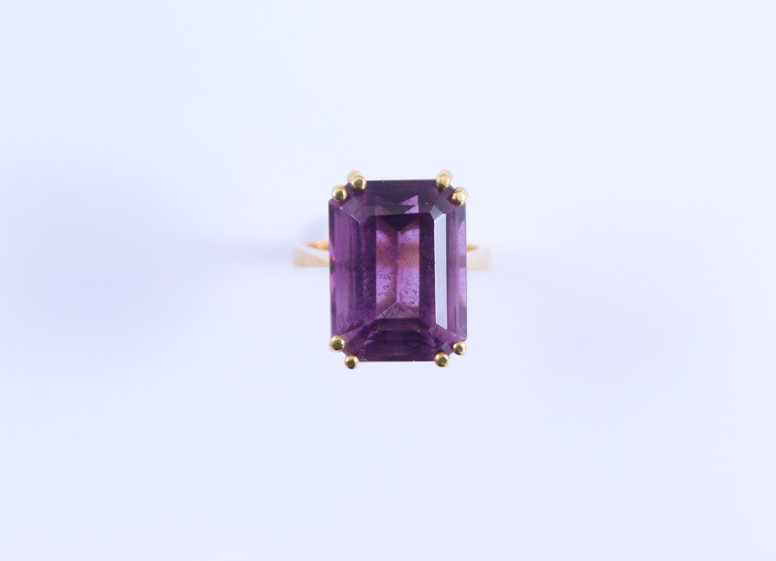 BAGUE en or jaune ornée d'une améthyste de taille émeraude.