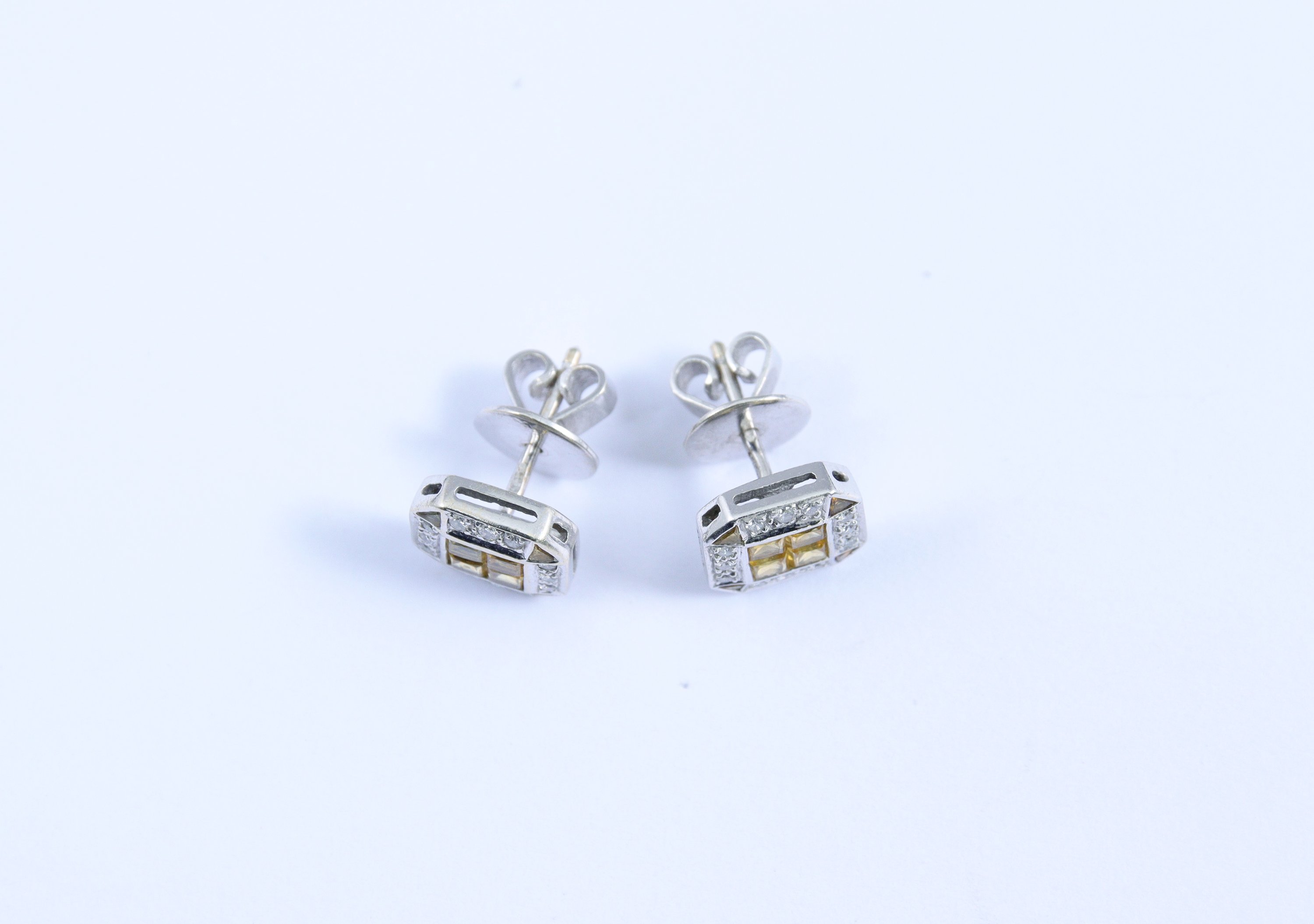 PAIRE de BOUCLES d'OREILLES en or gris 750 millièmes chacune de forme octogonale ornée de SAPHIRS jaunes calibrés et de DIAMANTS ronds de taille brillant.