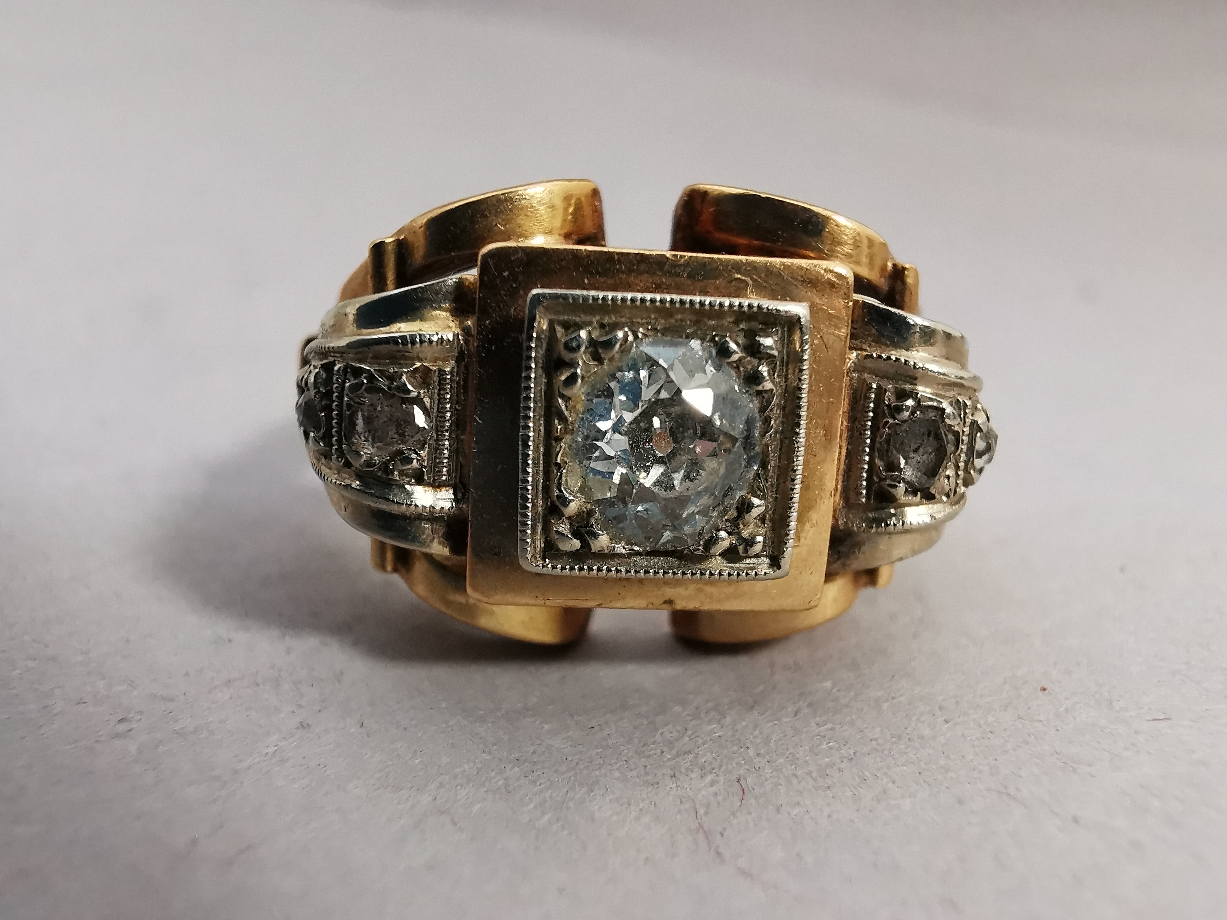 Belle BAGUE en or jaune et or blanc 750 millièmes ornée d'un DIAMANT de taille en ancienne dans un entourage d'une ligne de petits brillants.