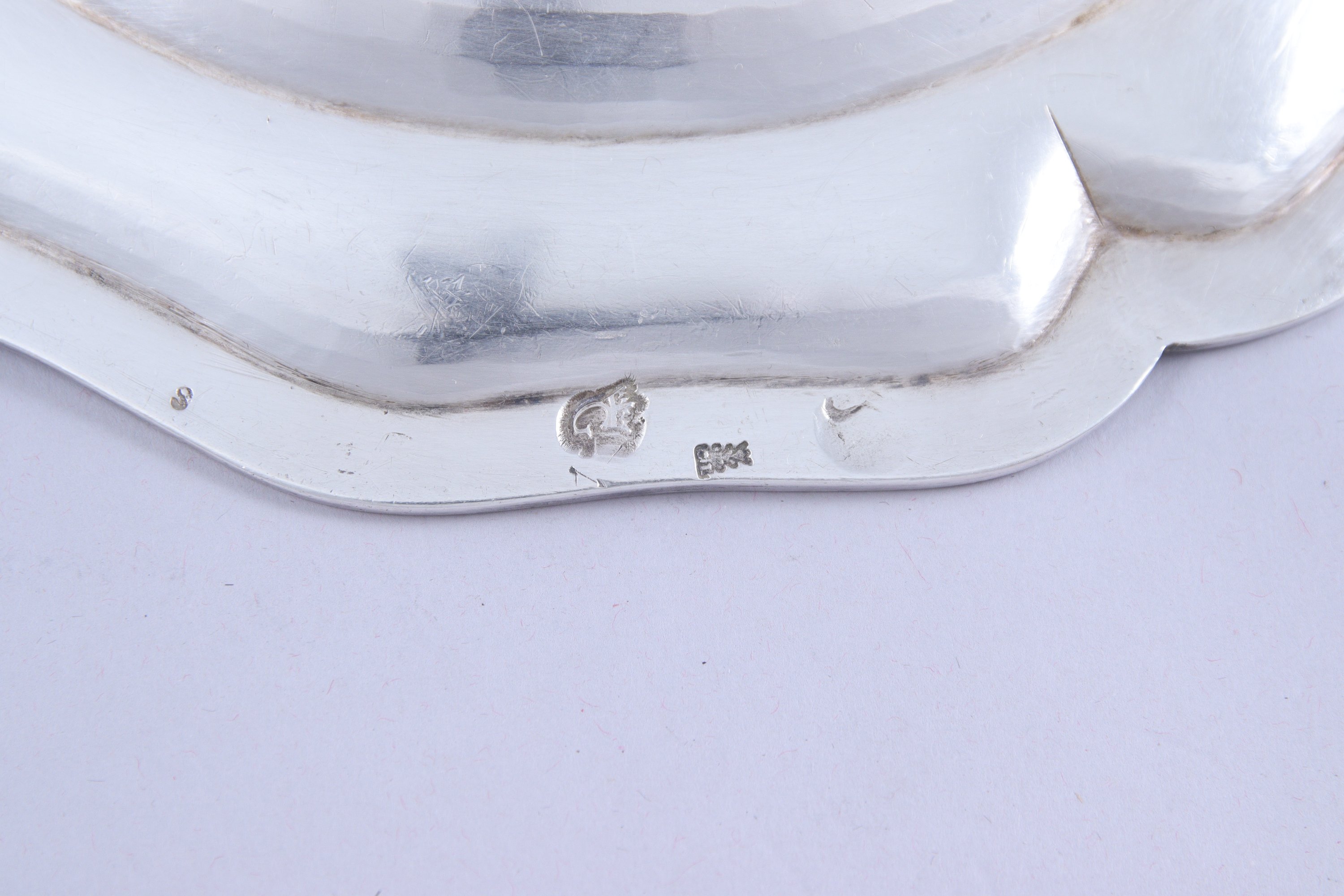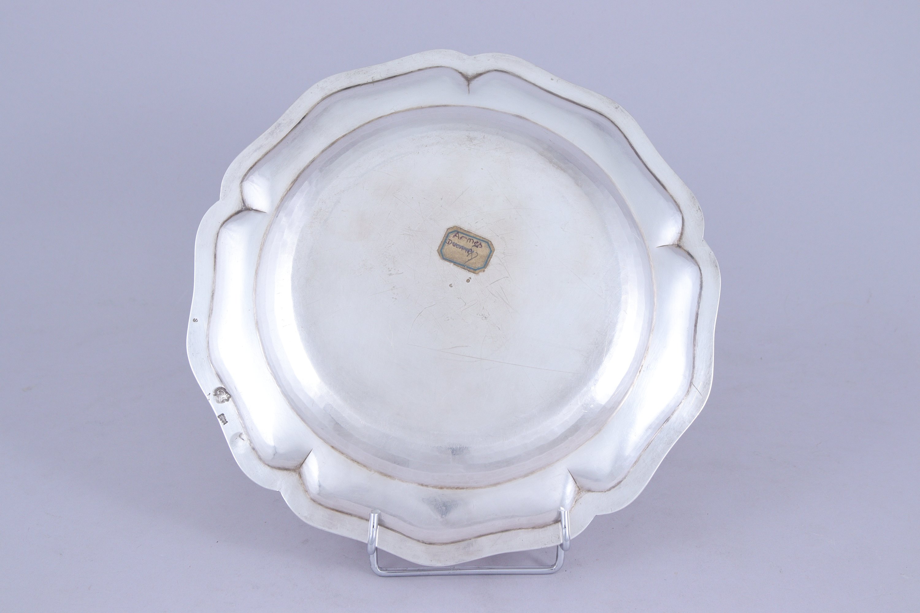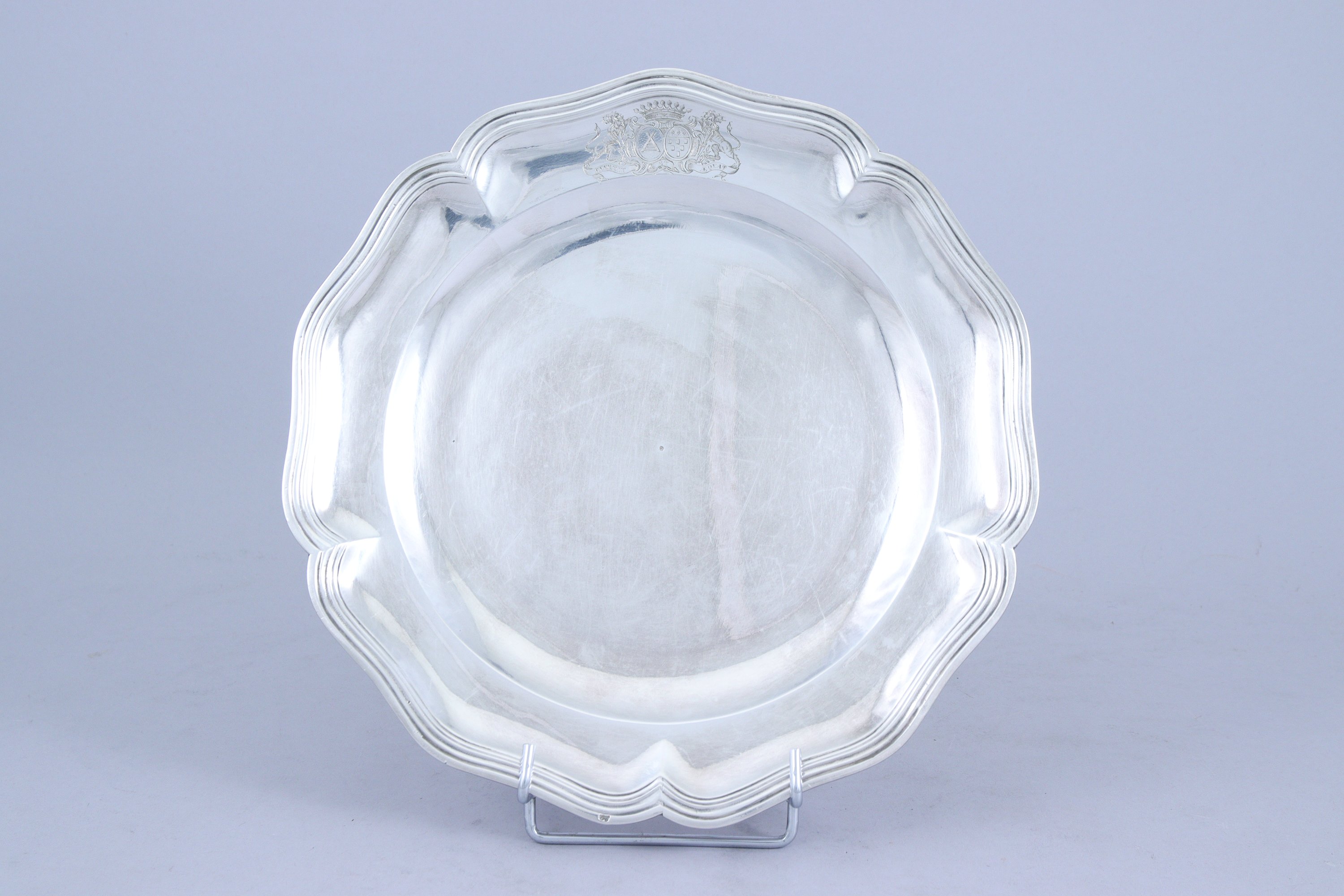 ANGERS ? PLAT de forme ronde en argent. Bordure chantournée à batte contour, l'aile gravée d'armoiries timbrées d'une couronne comtale.