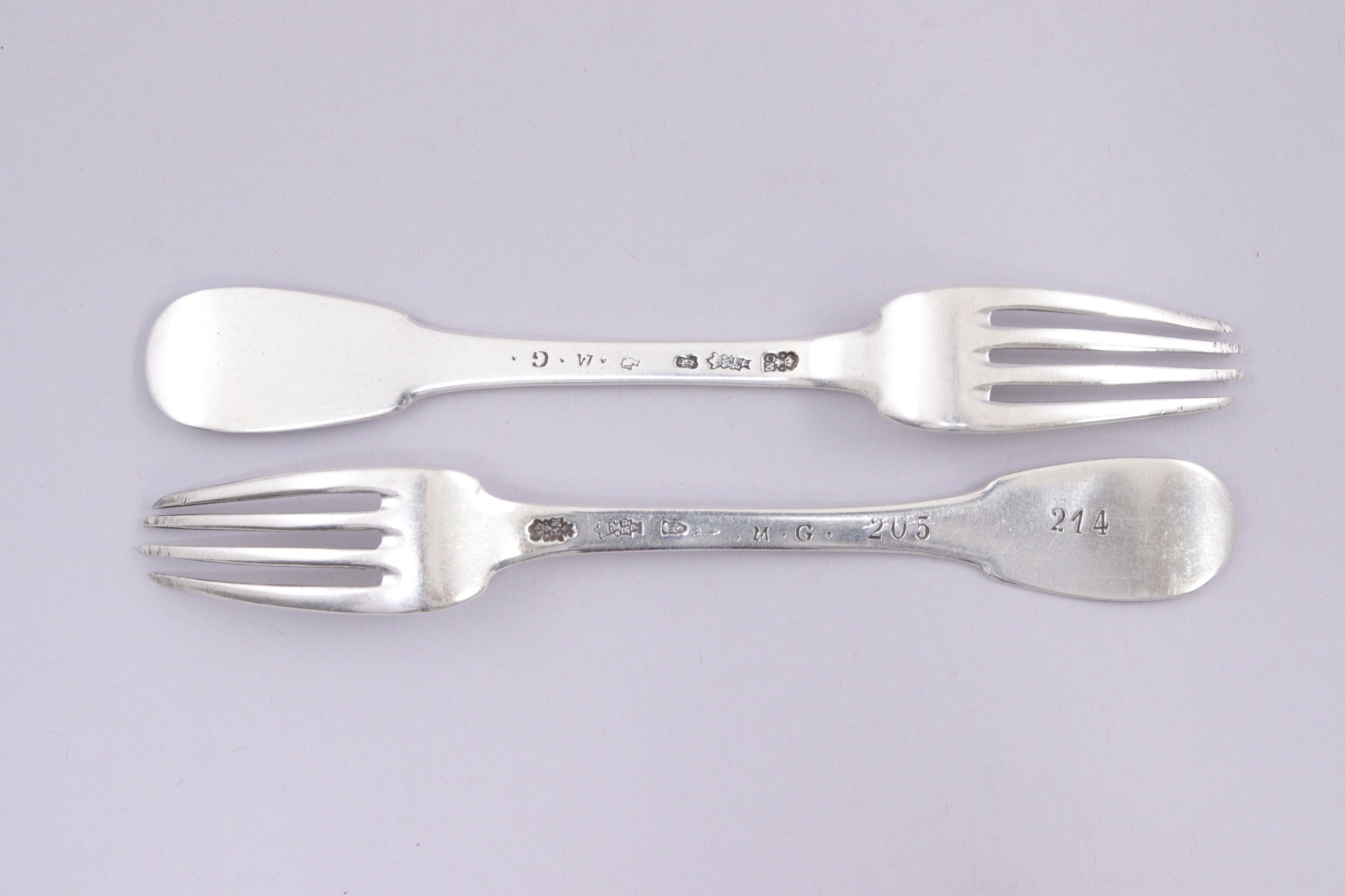 DEUX FOURCHETTES de TABLE en argent modèle Uniplat monogrammées M.G. L'une portant les numéros "205" 214" et poinçons aux Fermiers Généraux dont "P.M" couronné et "YP.PP", l'autre CM couronnée et "YP.PP"