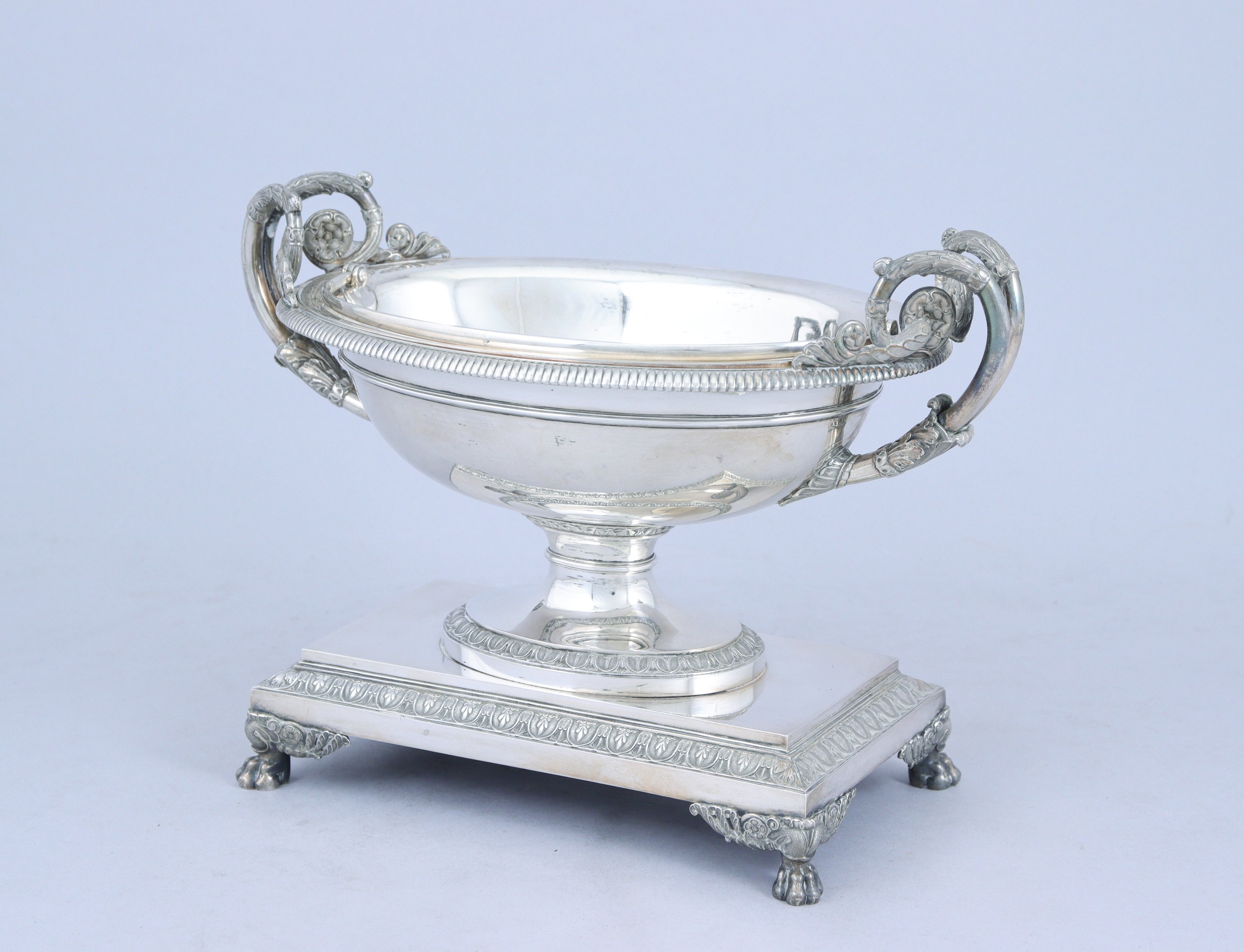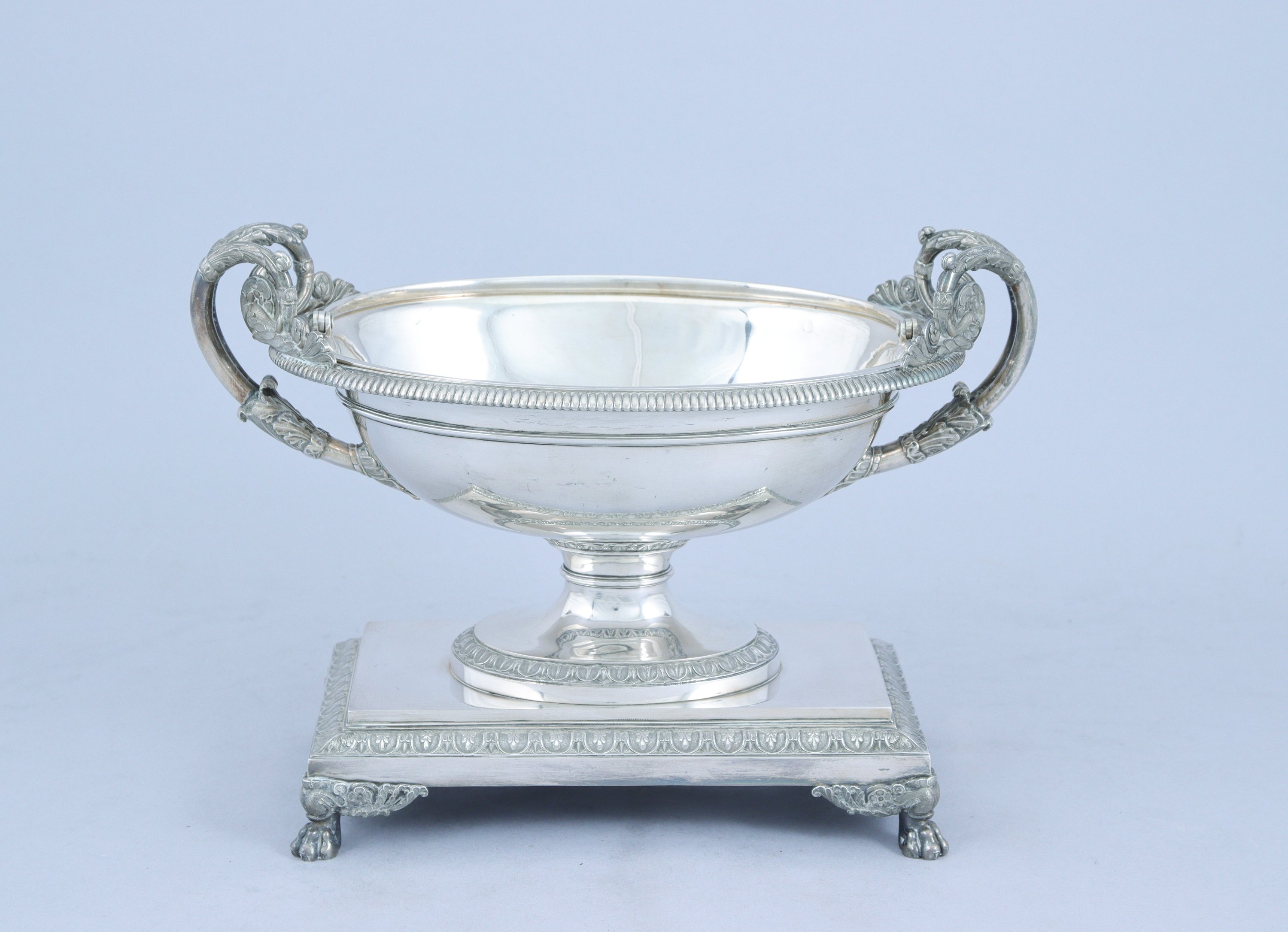 COUPE sur PIÉDOUCHE en argent. La coupe au décor de godrons et de palmettes, les anses à double enroulements. Elle repose sur une base rectangulaire terminée par des griffes de lion. Le bassin indépendant en argent à anse mobile.