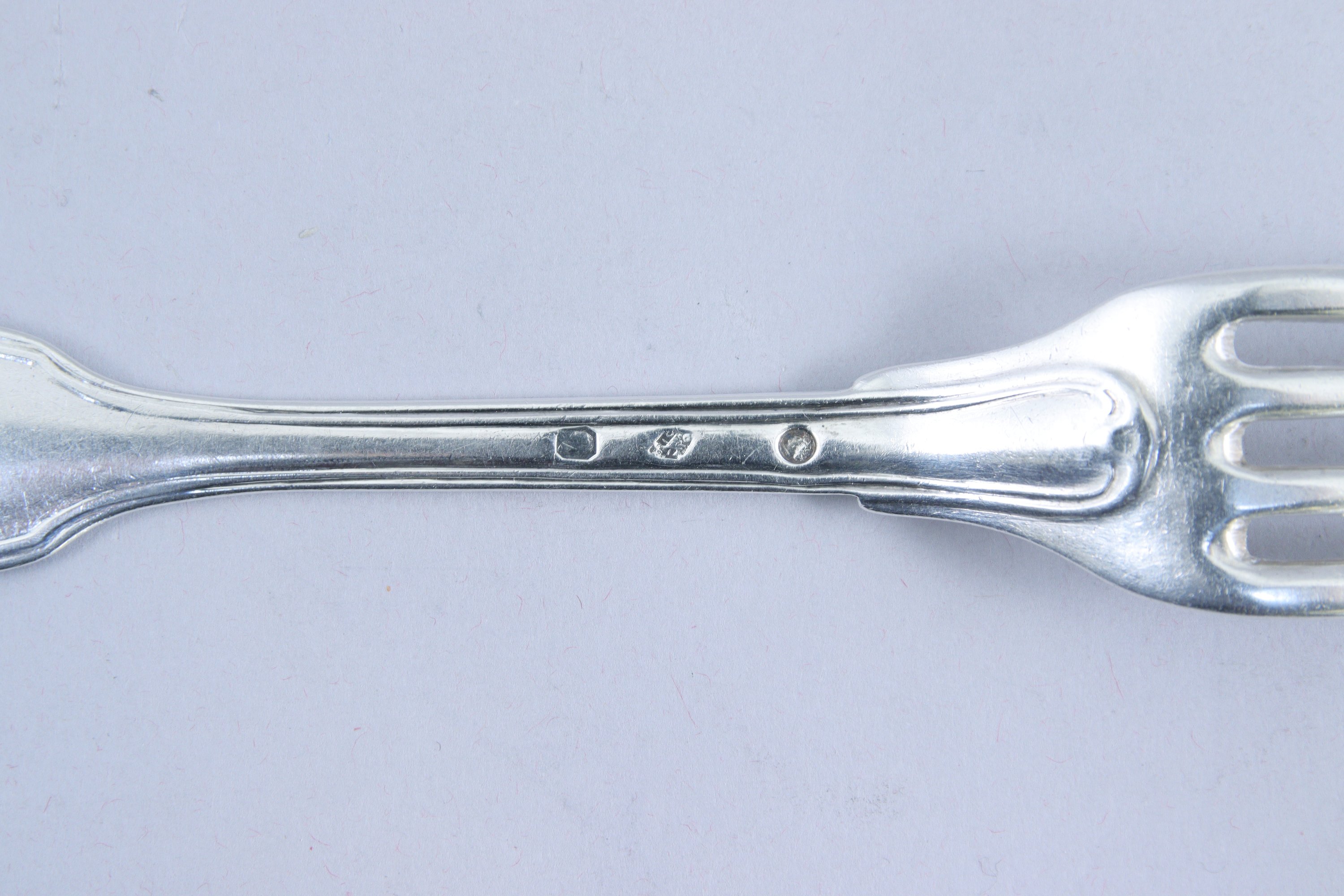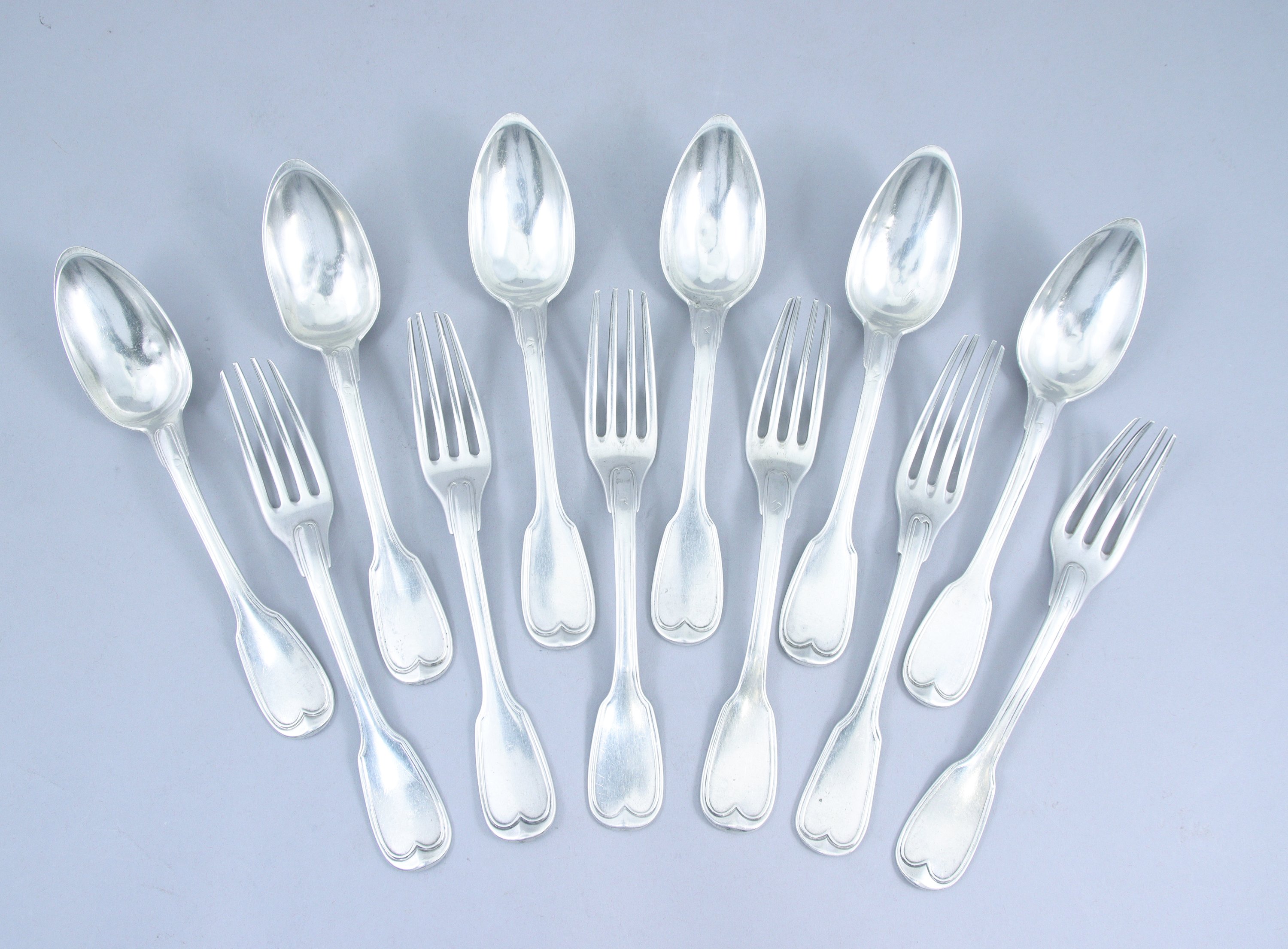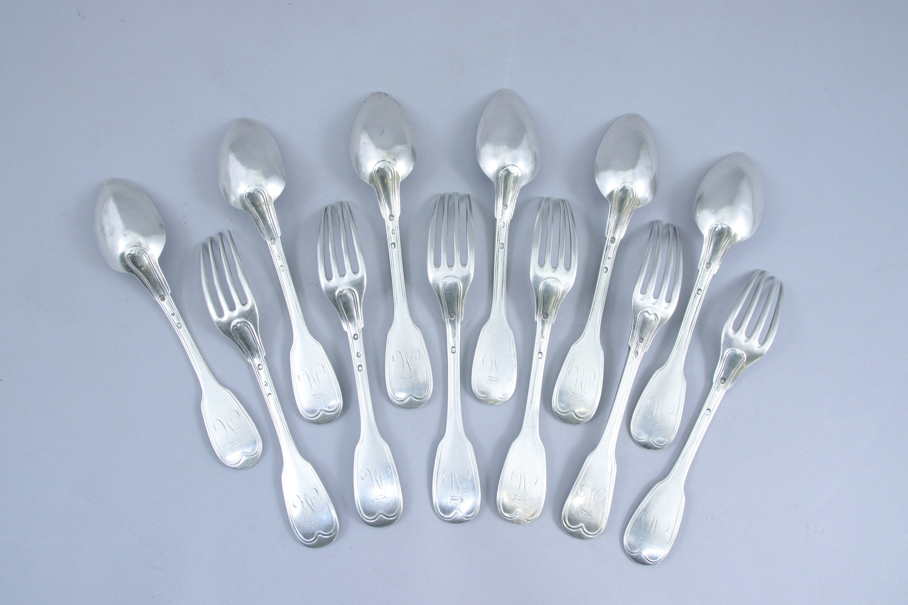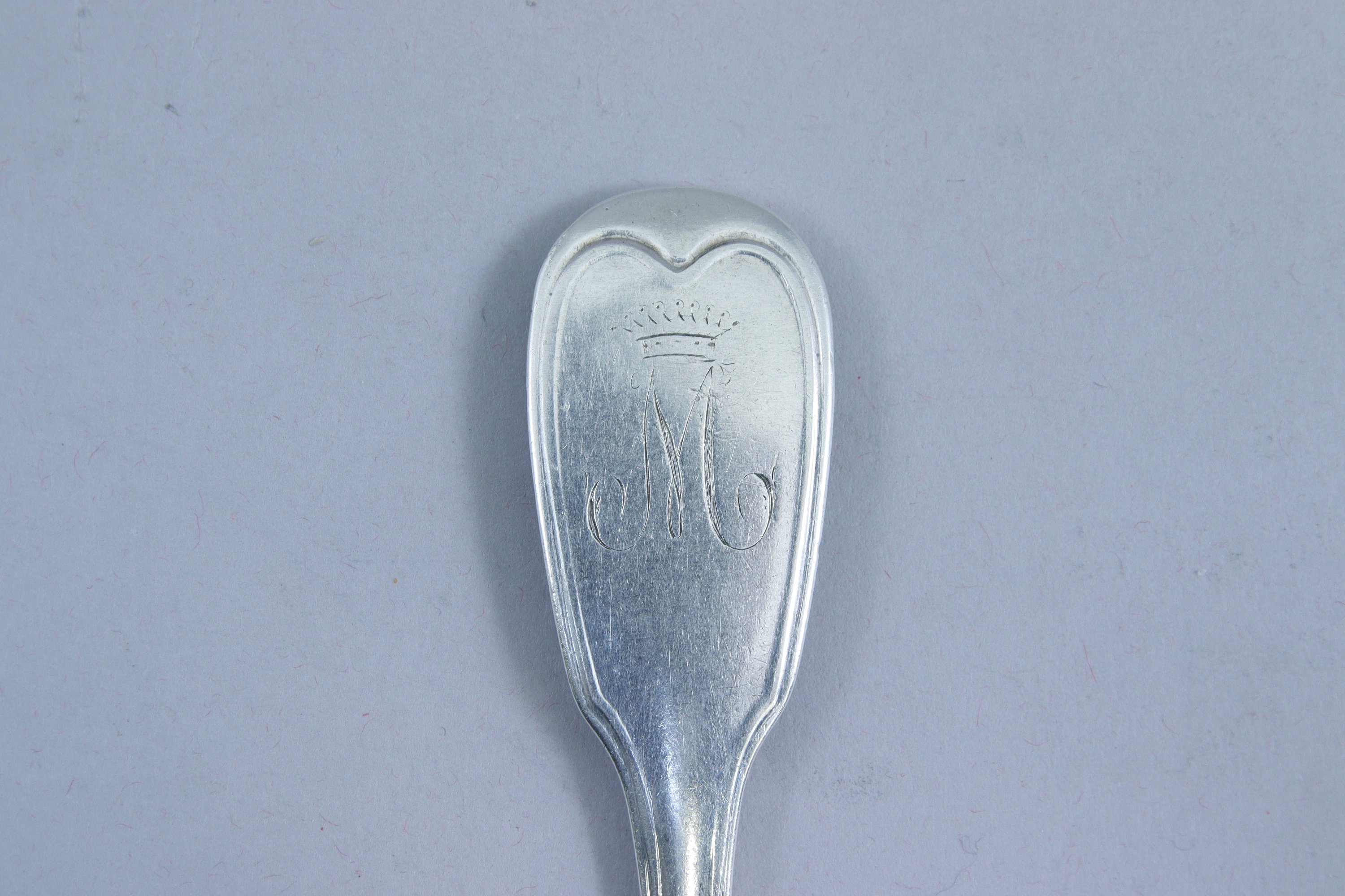 PARIS. SIX COUVERTS en argent, modèle filet. Gravés de la lettre "M" et surmontés d'une couronne comtale.