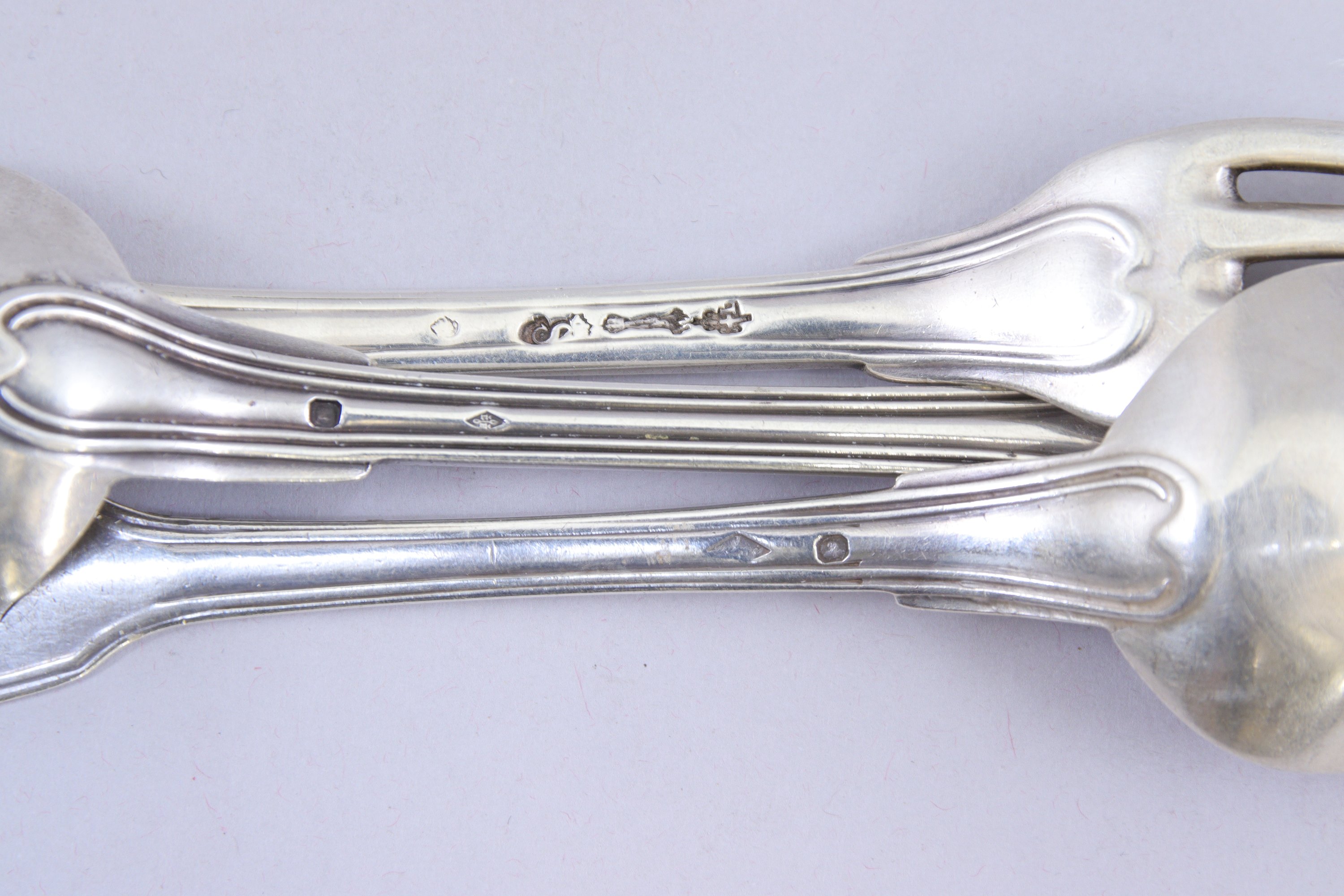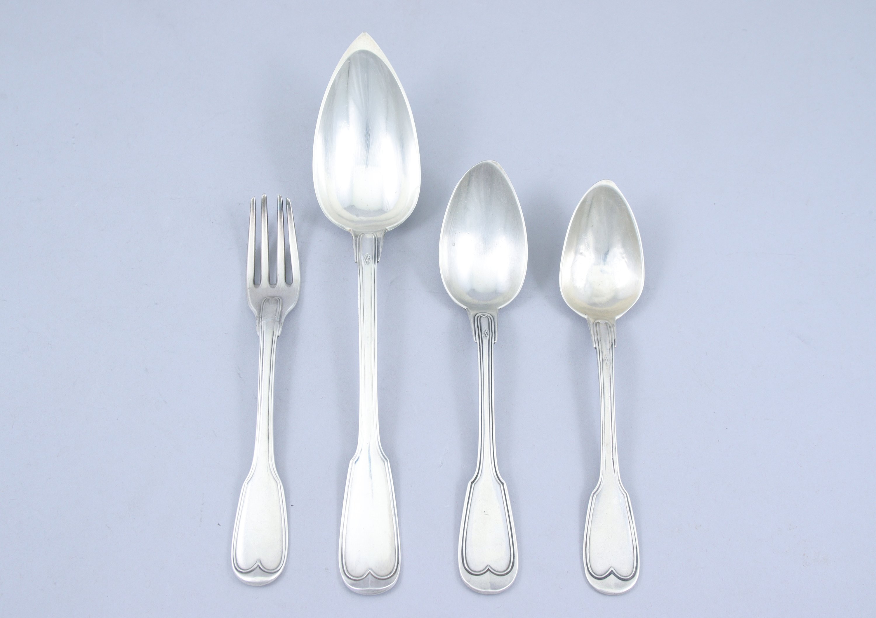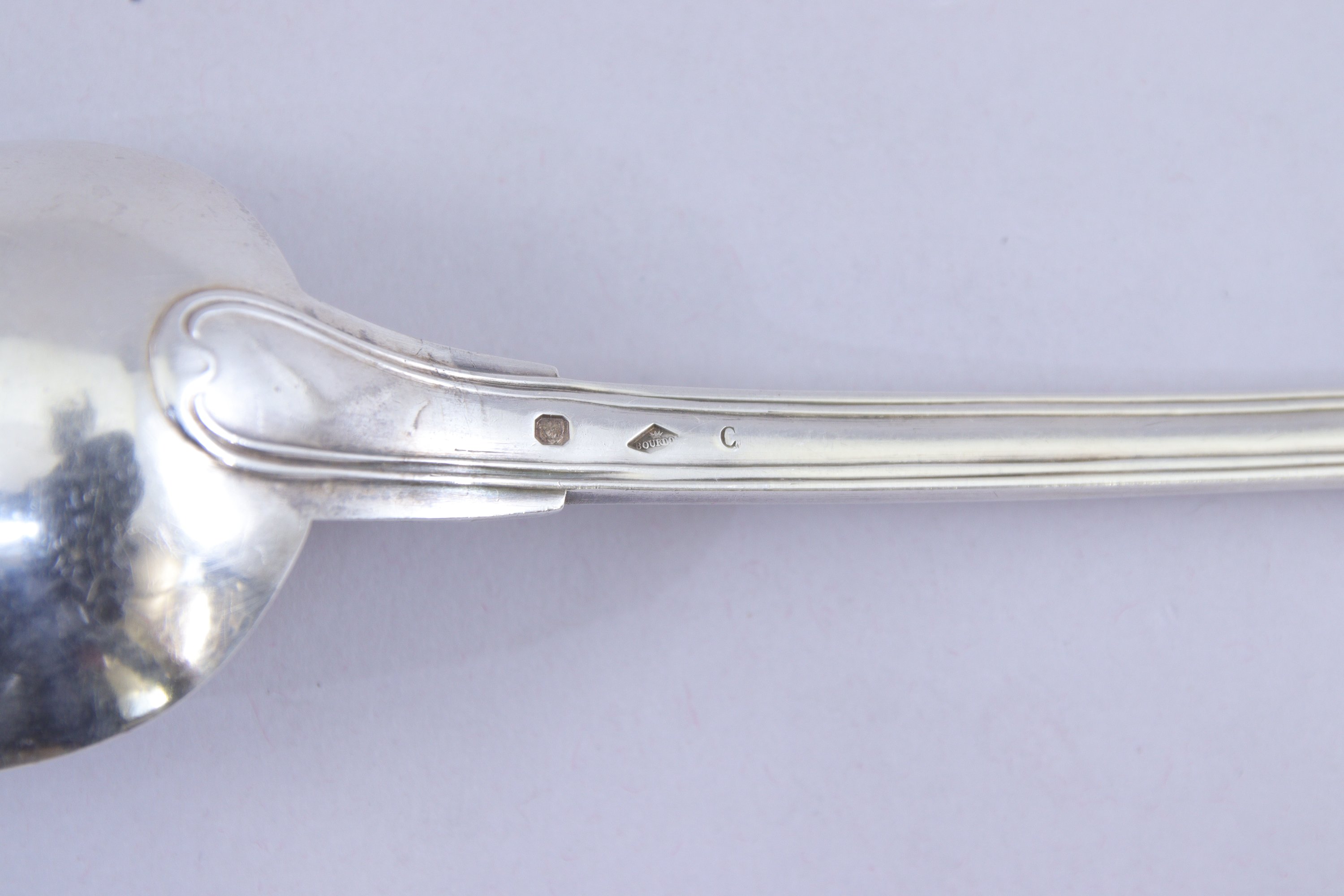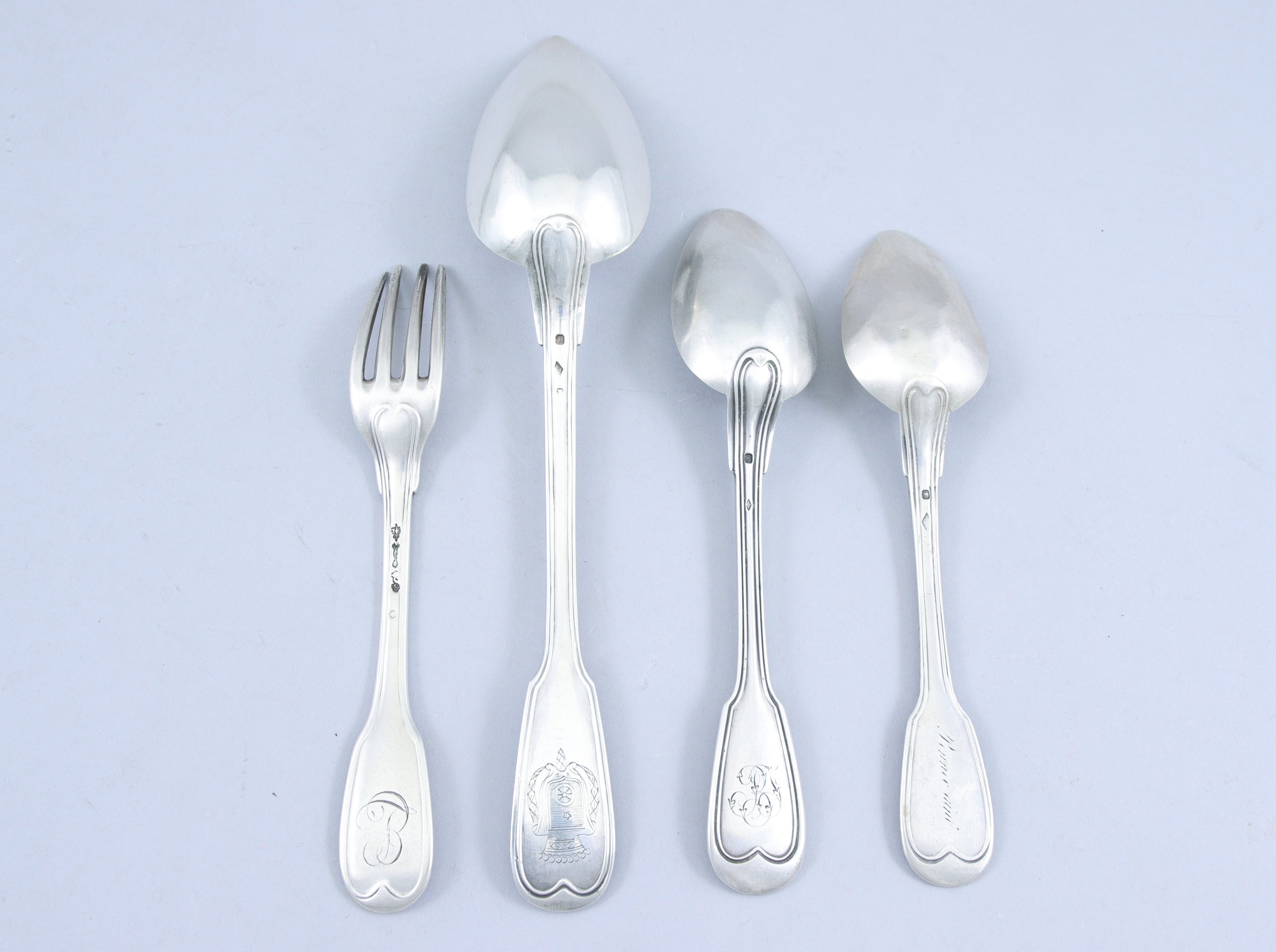 TROIS CUILLERS et UNE FOURCHETTE en argent, modèle filets : 1 CUILLÈRE à RAGOUT, 2 CUILLÈRES de TABLE, 1 FOURCHETTE de TABLE (aux Fermiers Généraux).