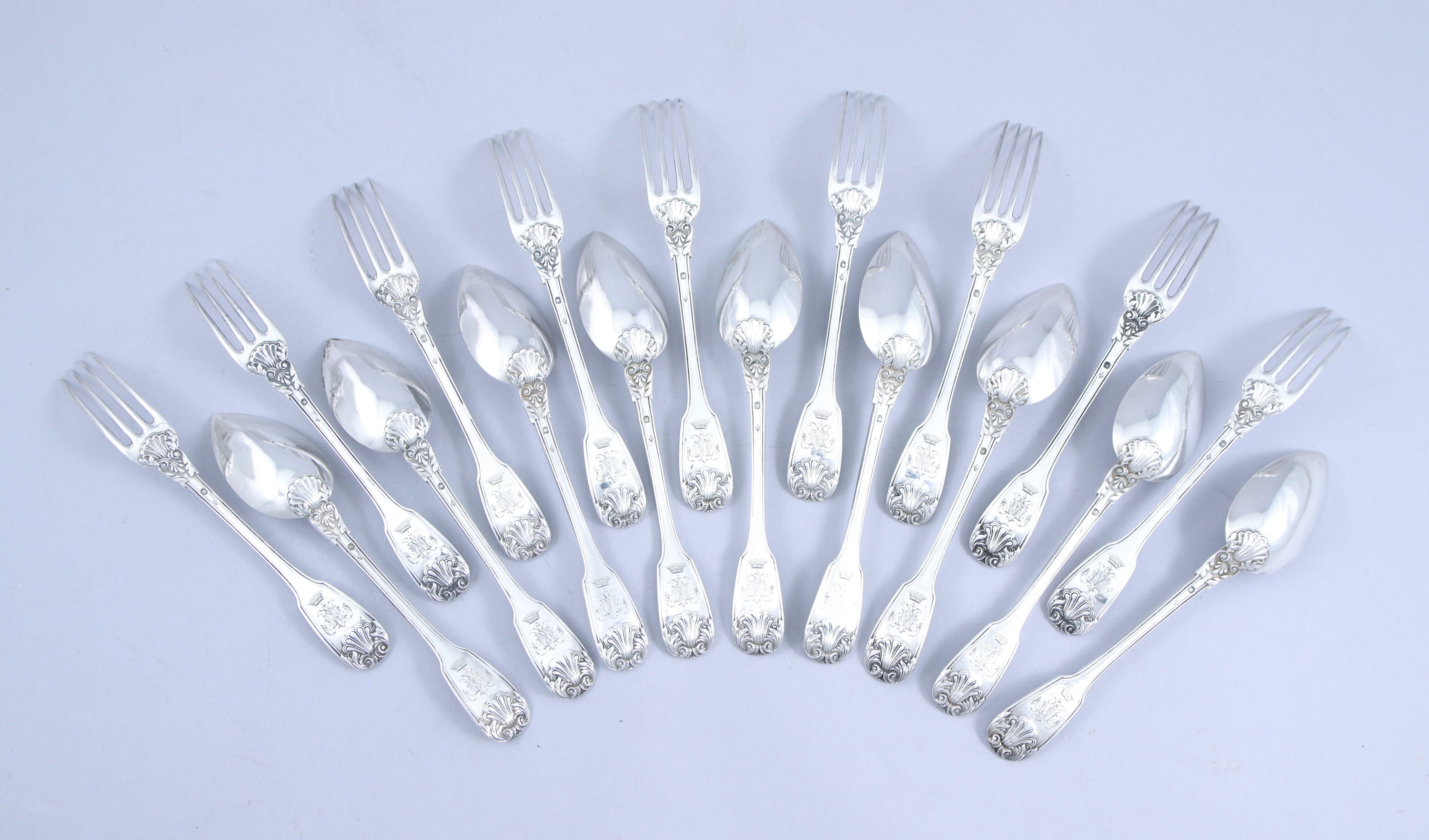 NEUF COUVERTS à dessert en argent. Riche modèle coquilles. Couronne comtale et initiales.