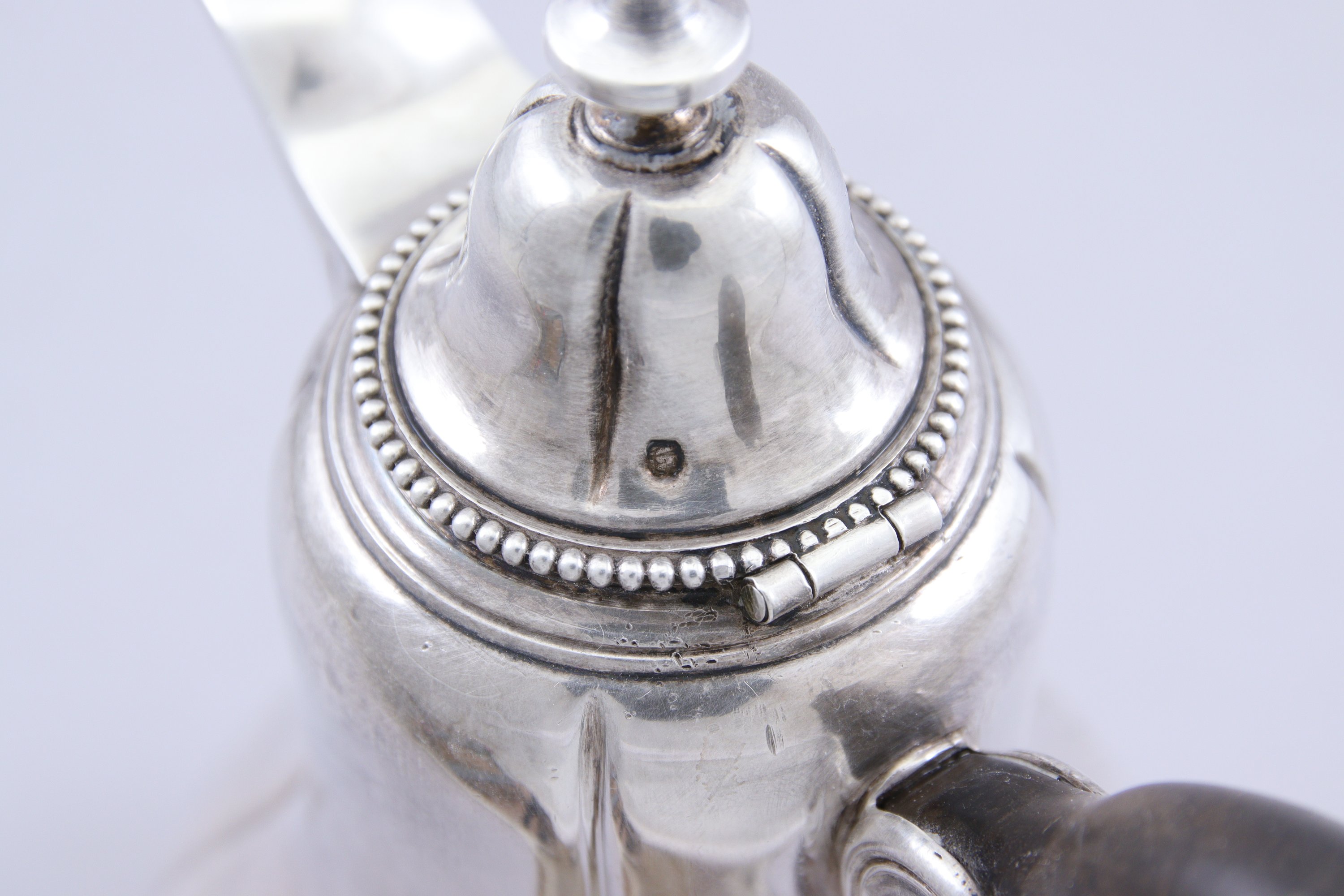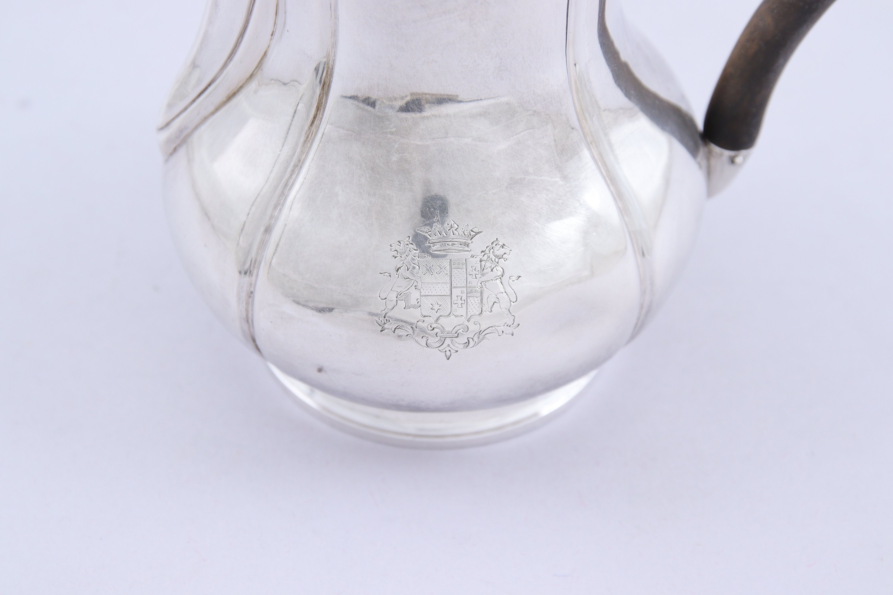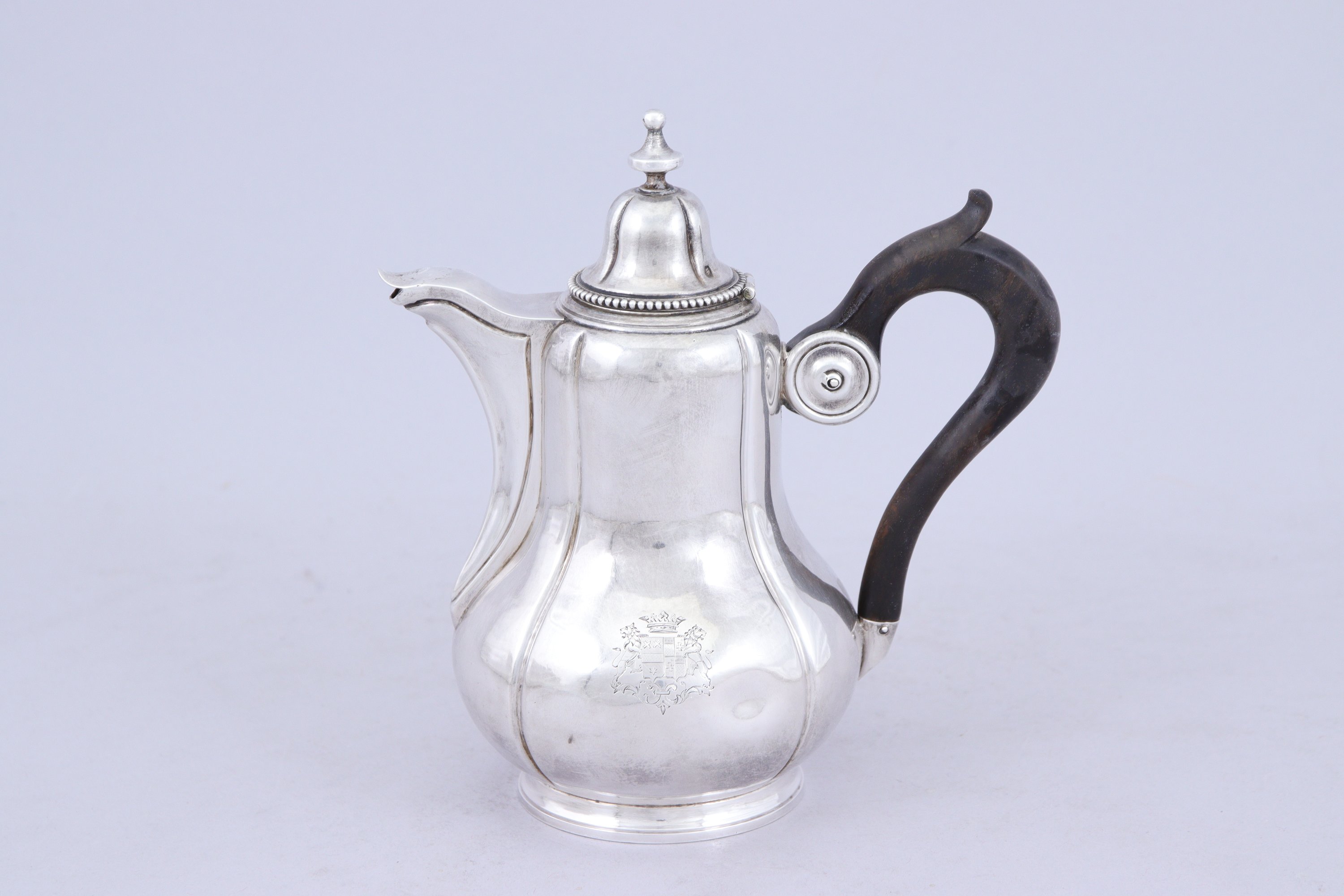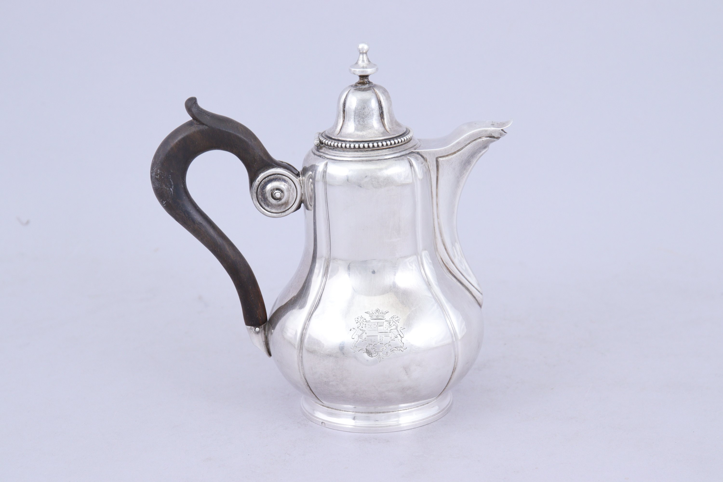 VERSEUSE à FOND PLAT en argent sur un léger piédouche, à décor de rangs de perles et de filets. Le fretel en toupie, le bec verseur ciselé de forme mouvementée. Manche en bois noirci. Panse gravée d'armoiries surmontées d'une couronne marquisale.