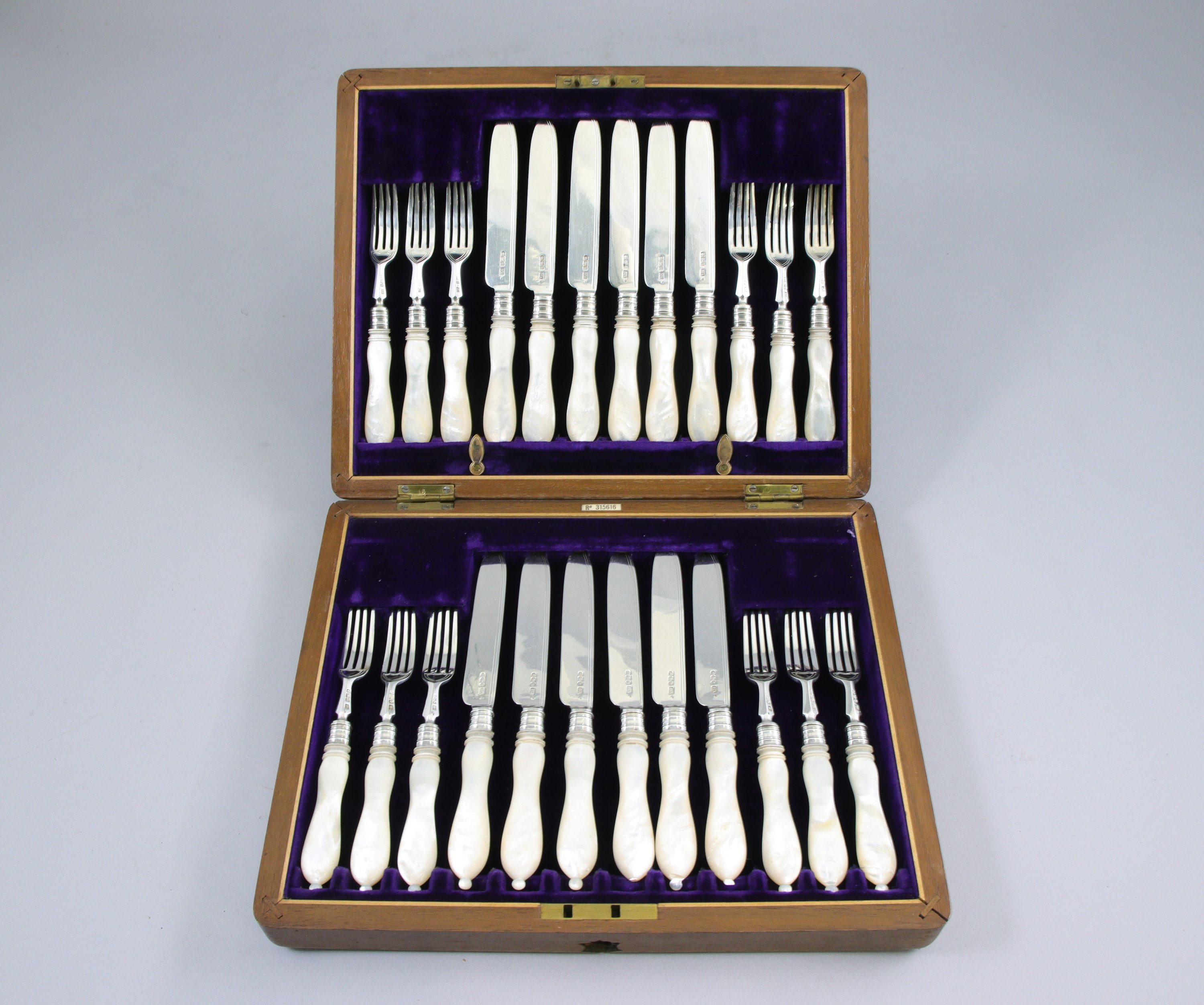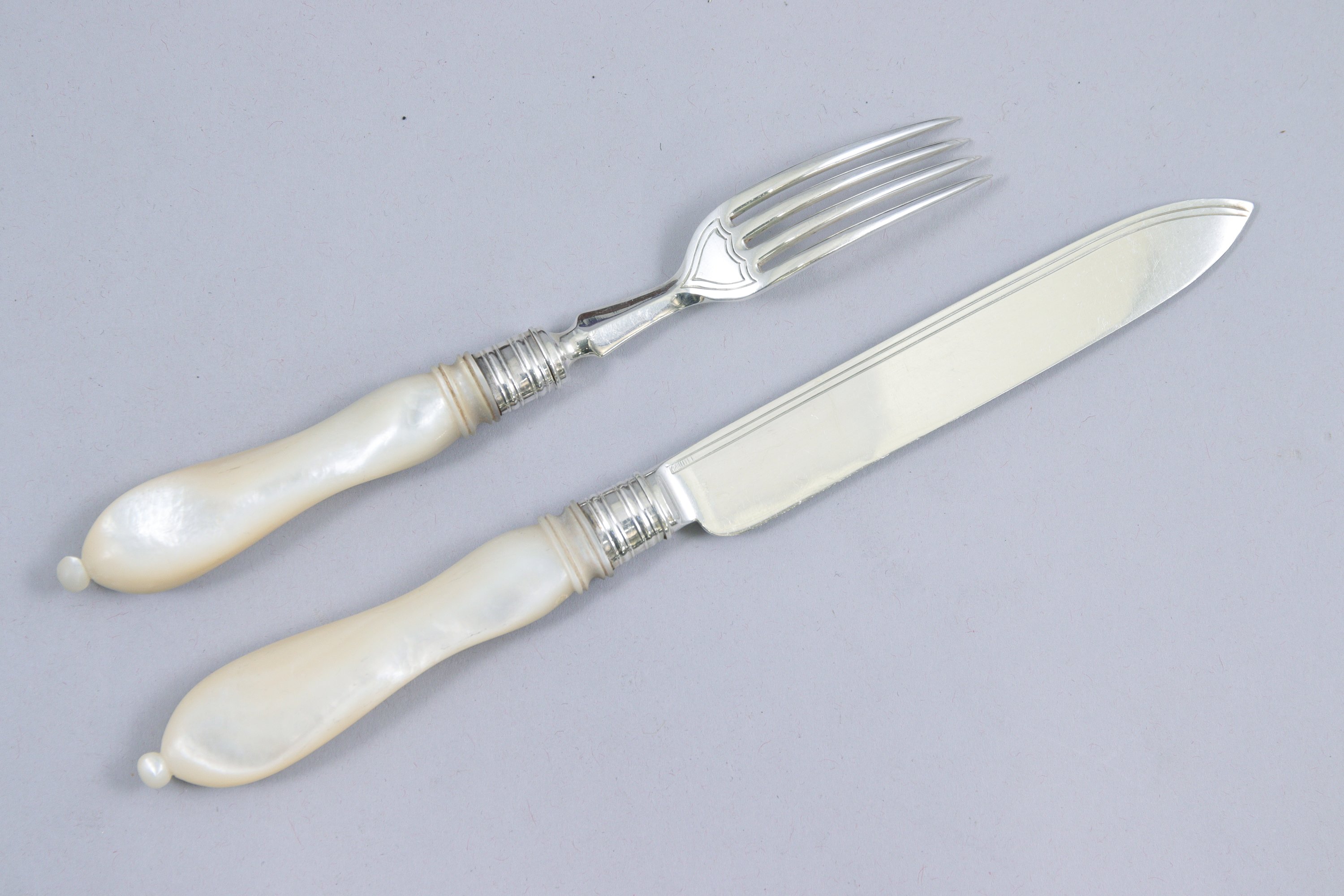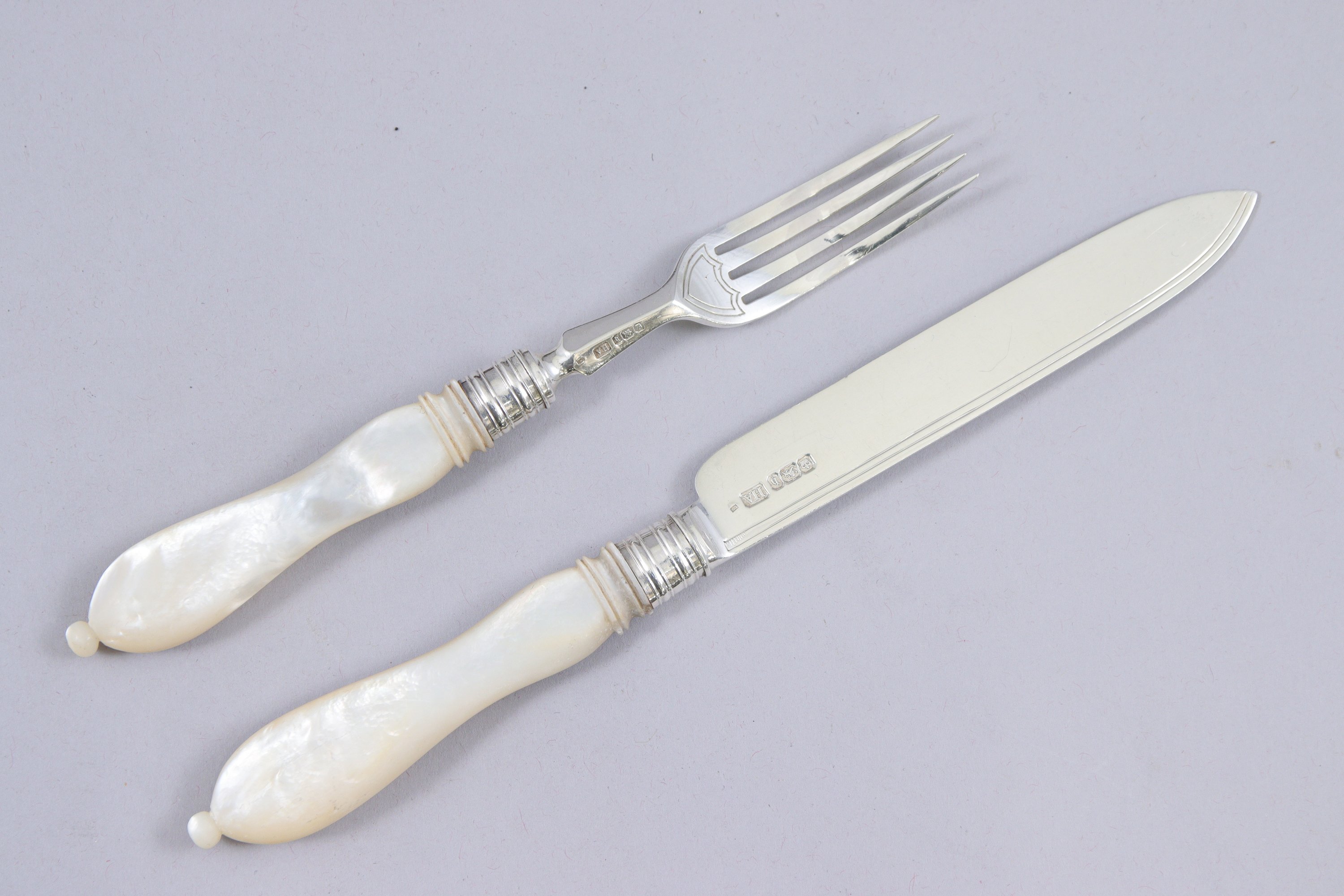 ANGLETERRE, 1900. DOUZE COUVERTS à FRUITS en argent et manches en nacre comprenant douze FOURCHETTES et douze COUTEAUX. Les manches se terminant par des boules.