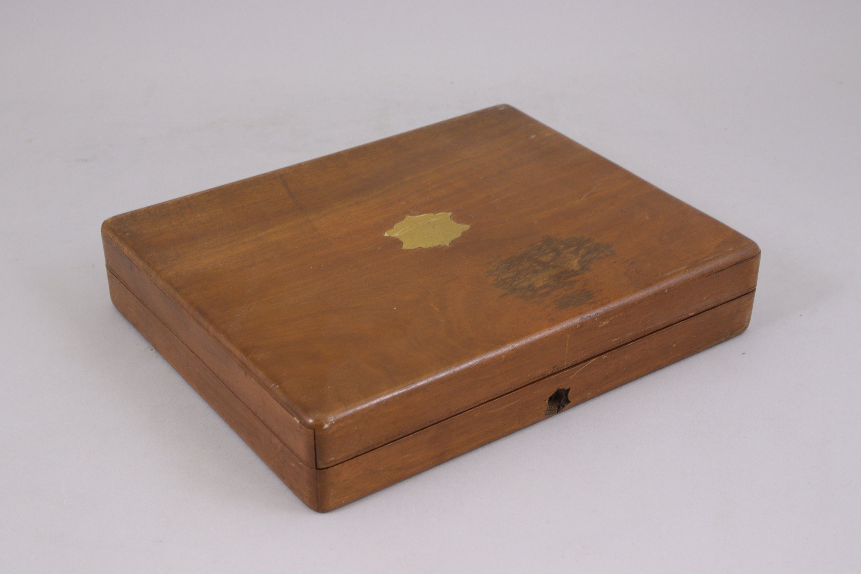 Dans un coffret en bois orné au centre d'un cartouche en laiton 31 X 25 cm. (manque l'entrée de serrure).