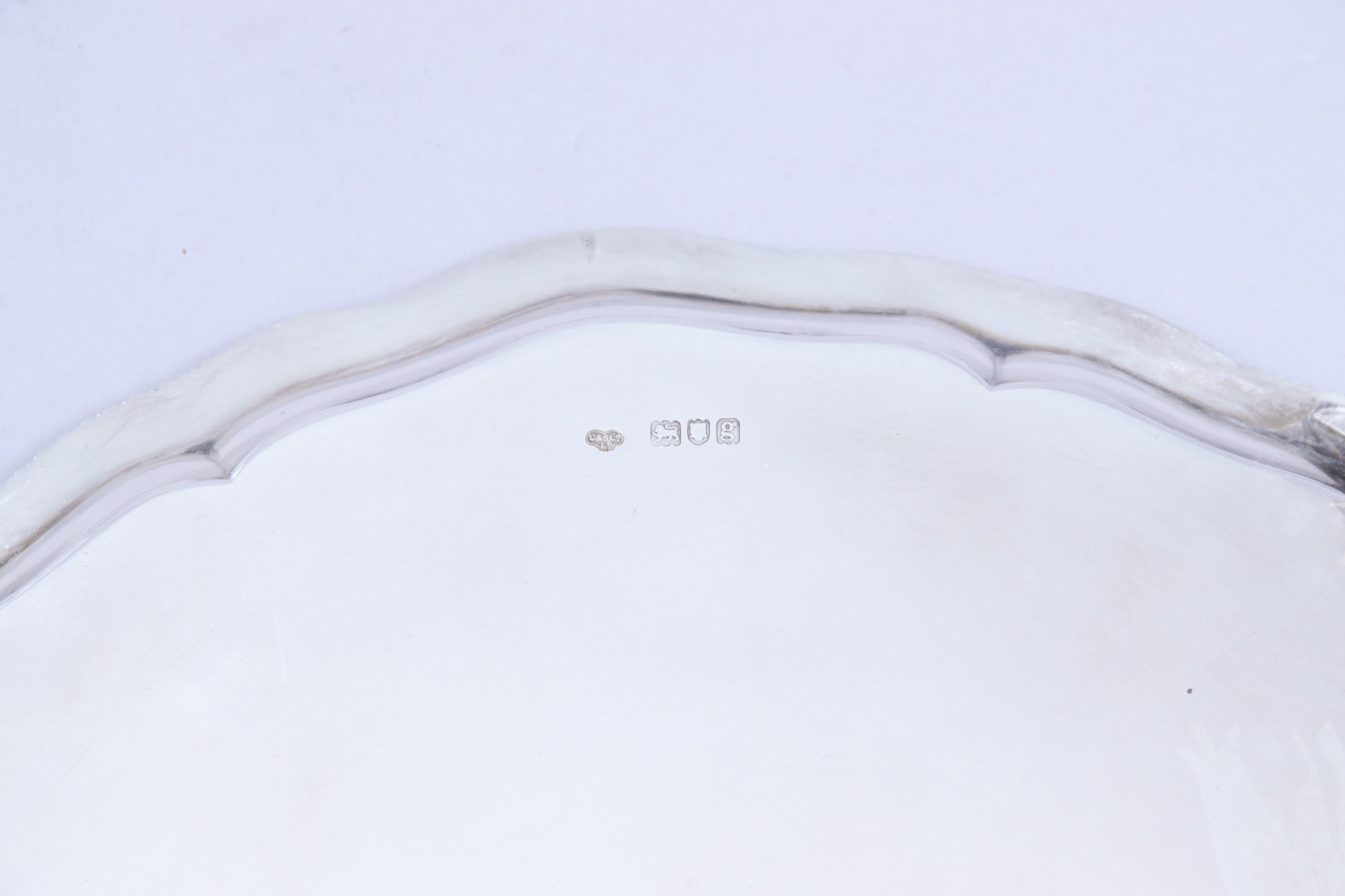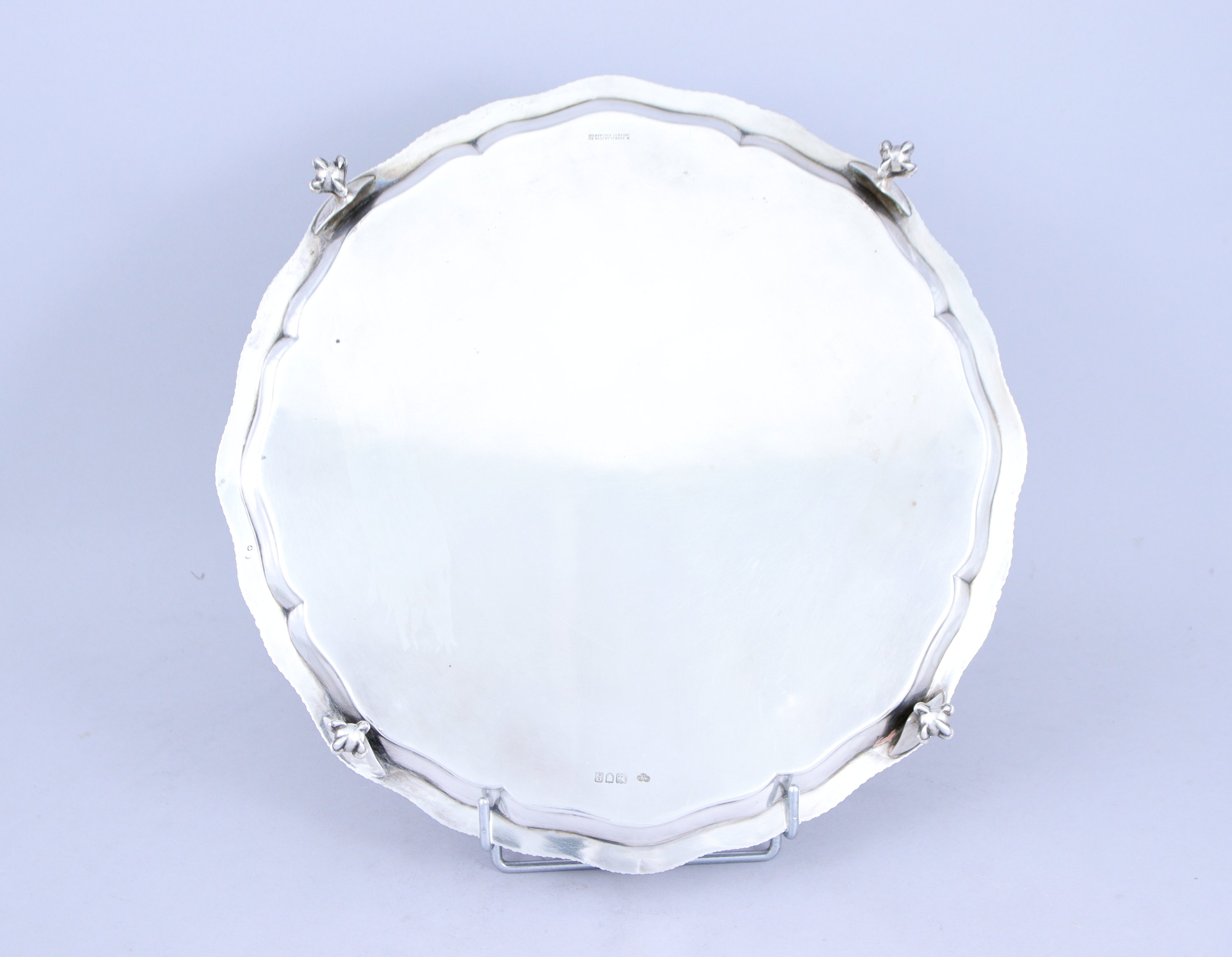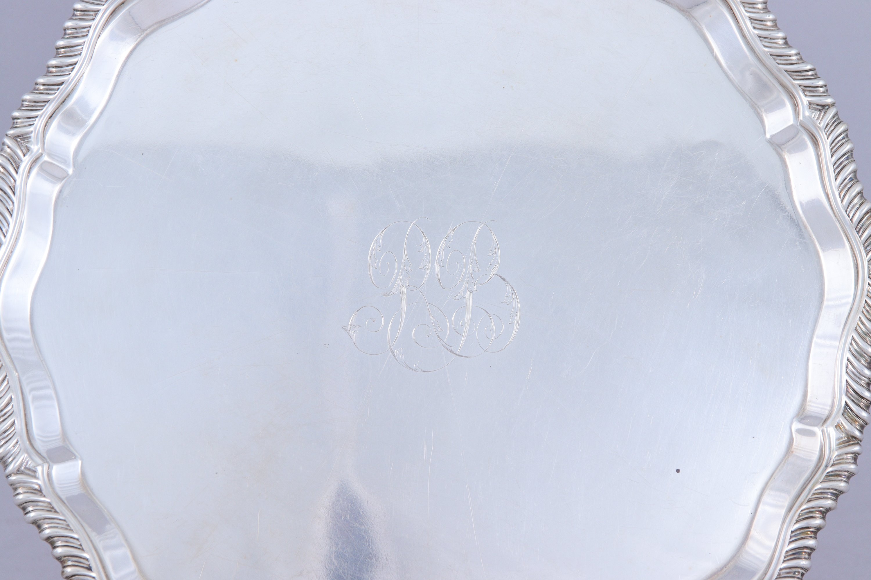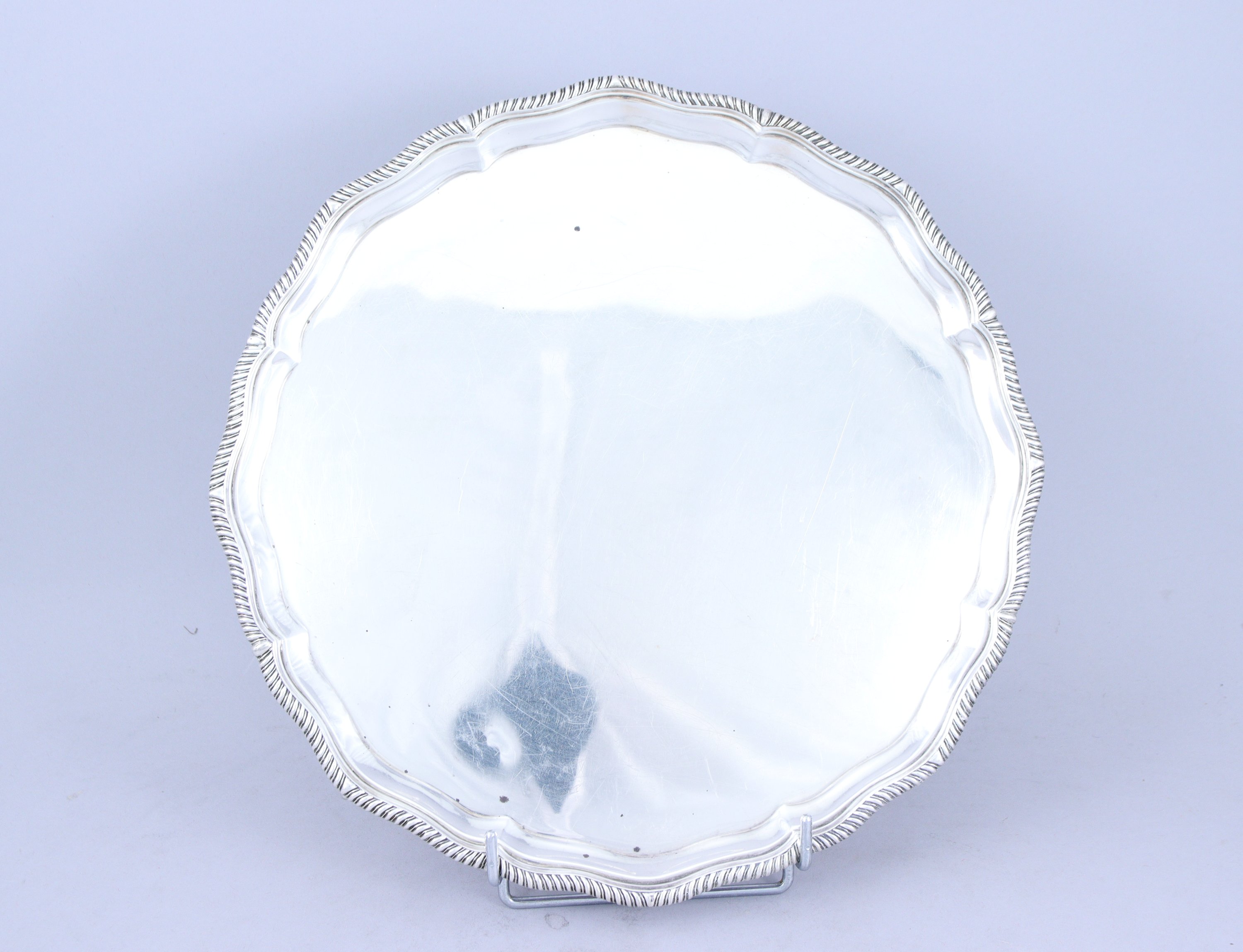 ANGLETERRE, 1902. PLAT en argent de forme circulaire, l'aile chantournée à décor de frise de godrons surmontant des moulures. Il repose sur quatre pieds en forme de serres d'oiseau enchâssant une sphère.