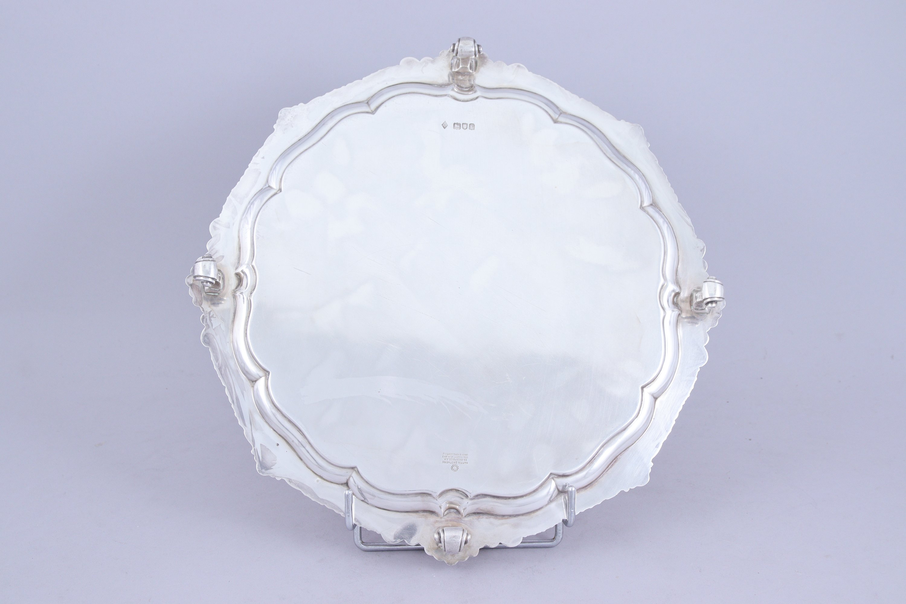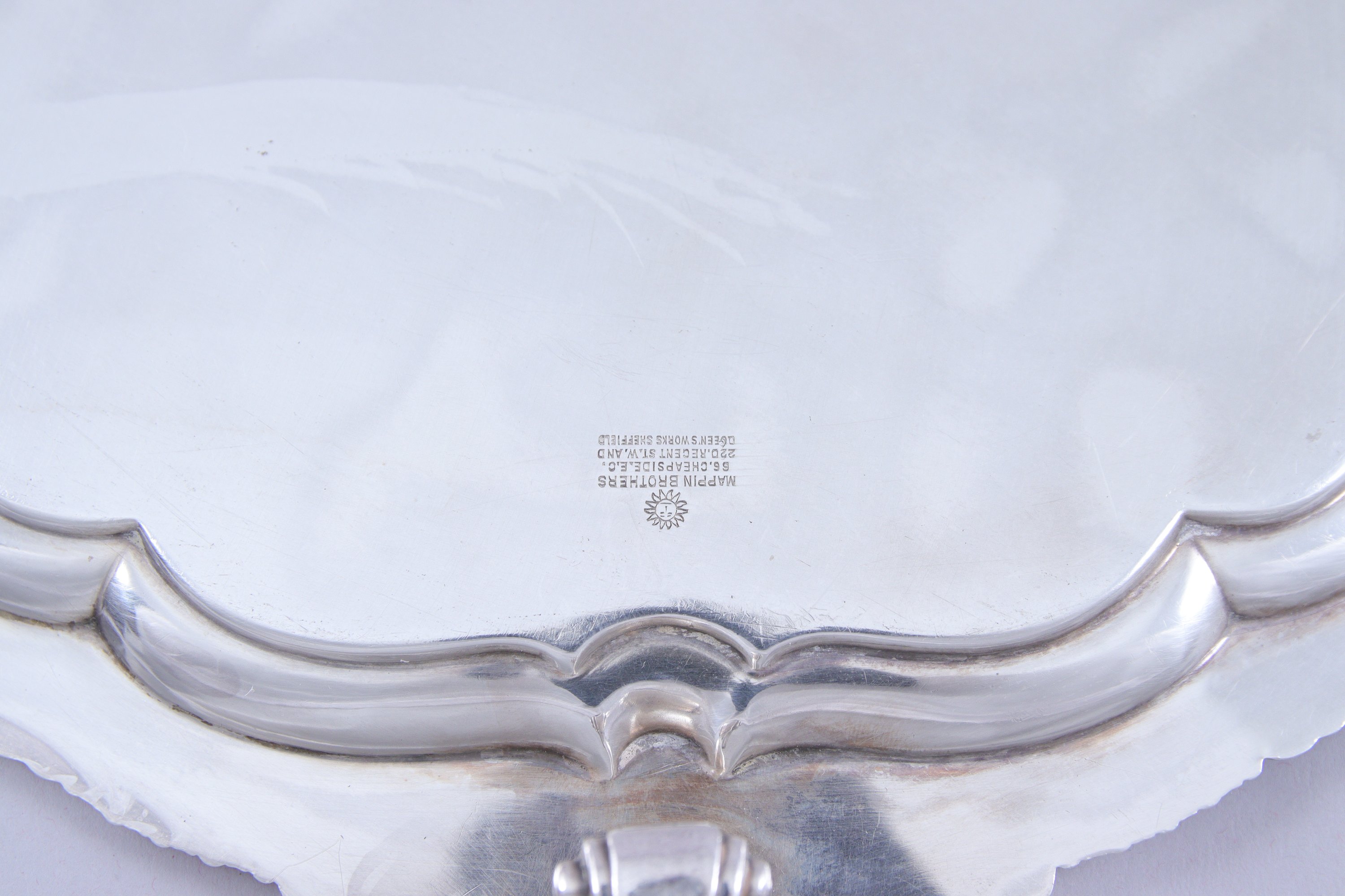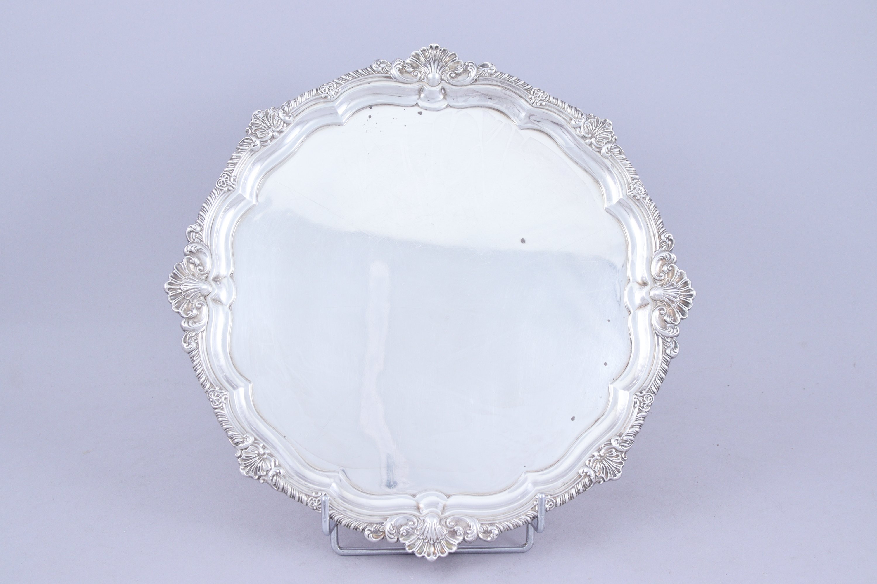 ANGLETERRE, 1902. PLAT en argent de forme circulaire, l'aile à décor de coquilles et rinceaux. L'intérieur est gravé d'une étoile à douze branches ornée d'une guirlande fleurie et inscrit dans un cartouche polylobé. Il repose sur trois pieds.