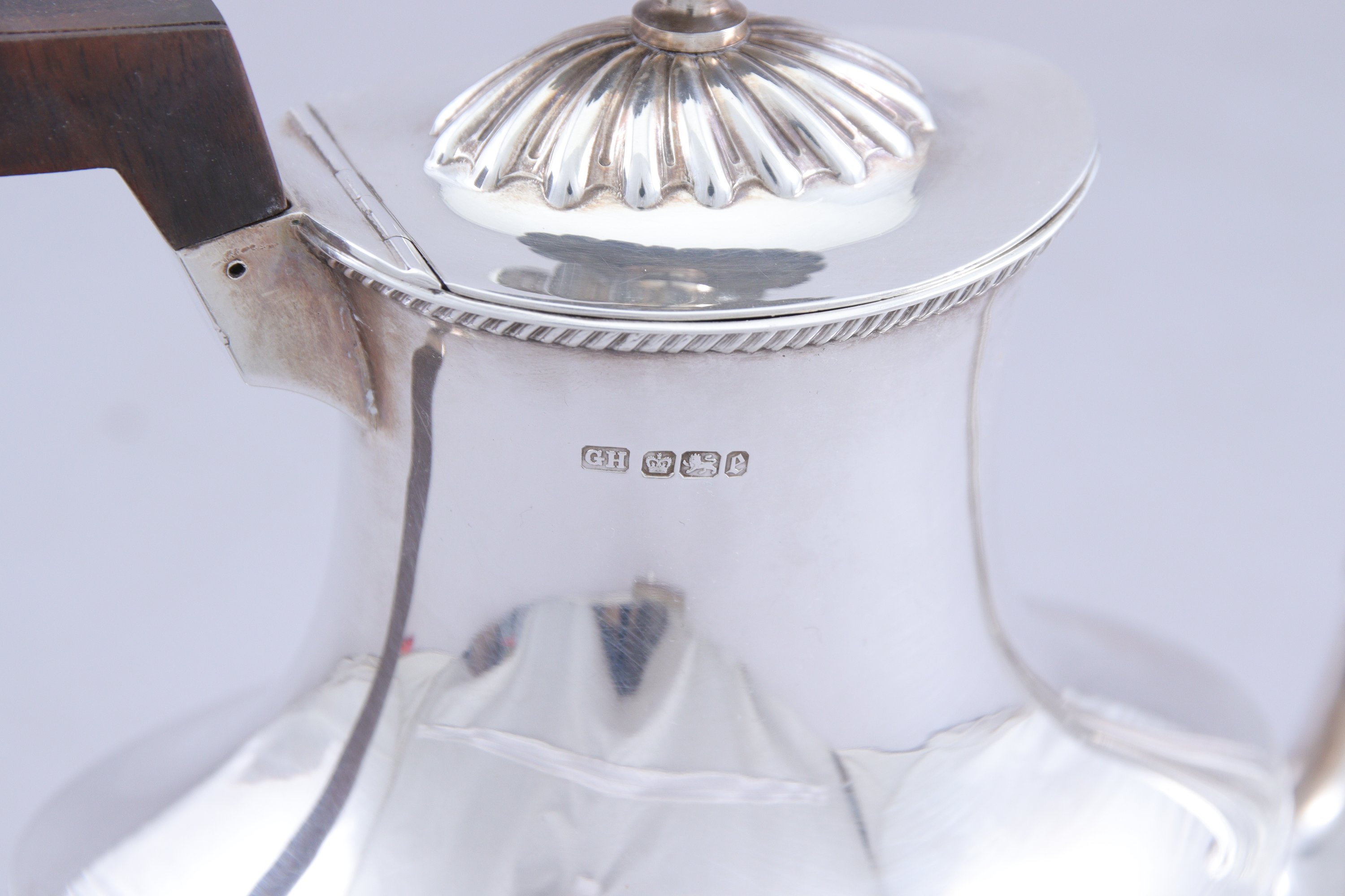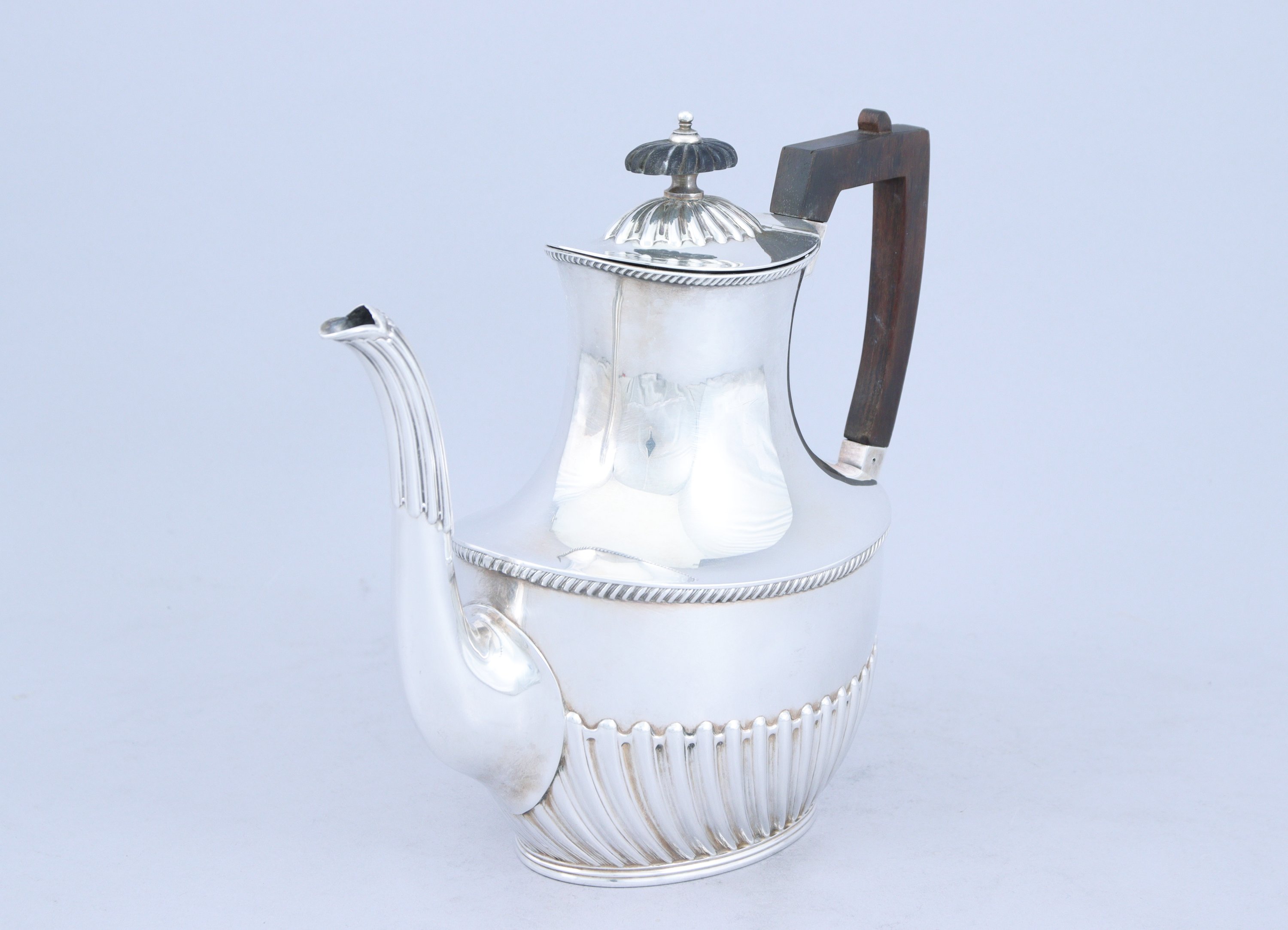 ANGLETERRE, 1922. VERSEUSE en argent, le fretel et l'anse en bois, la terrasse et la partie inférieure de la panse à décor godronné. La lèvre et le col sont ornés de frises de godrons.