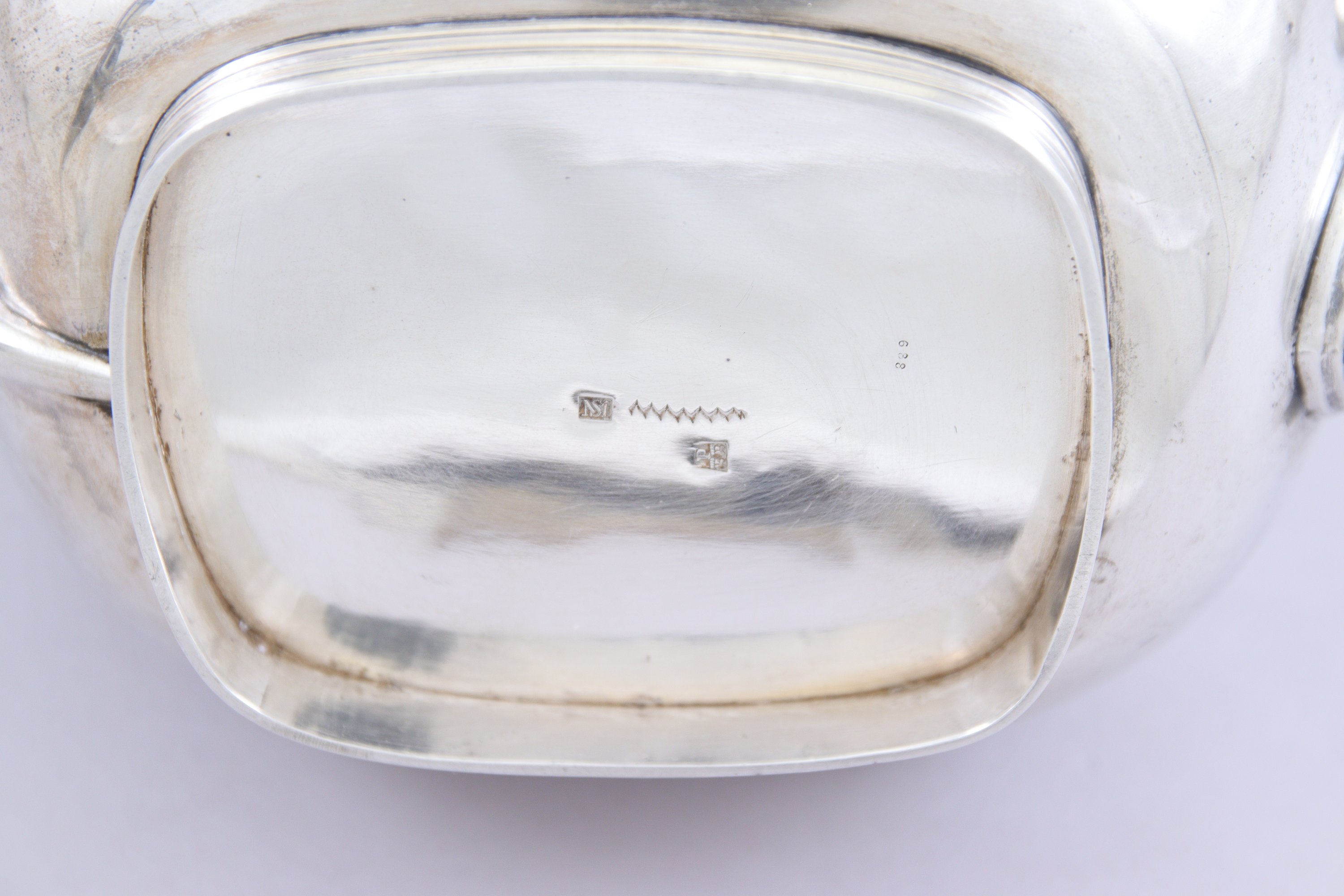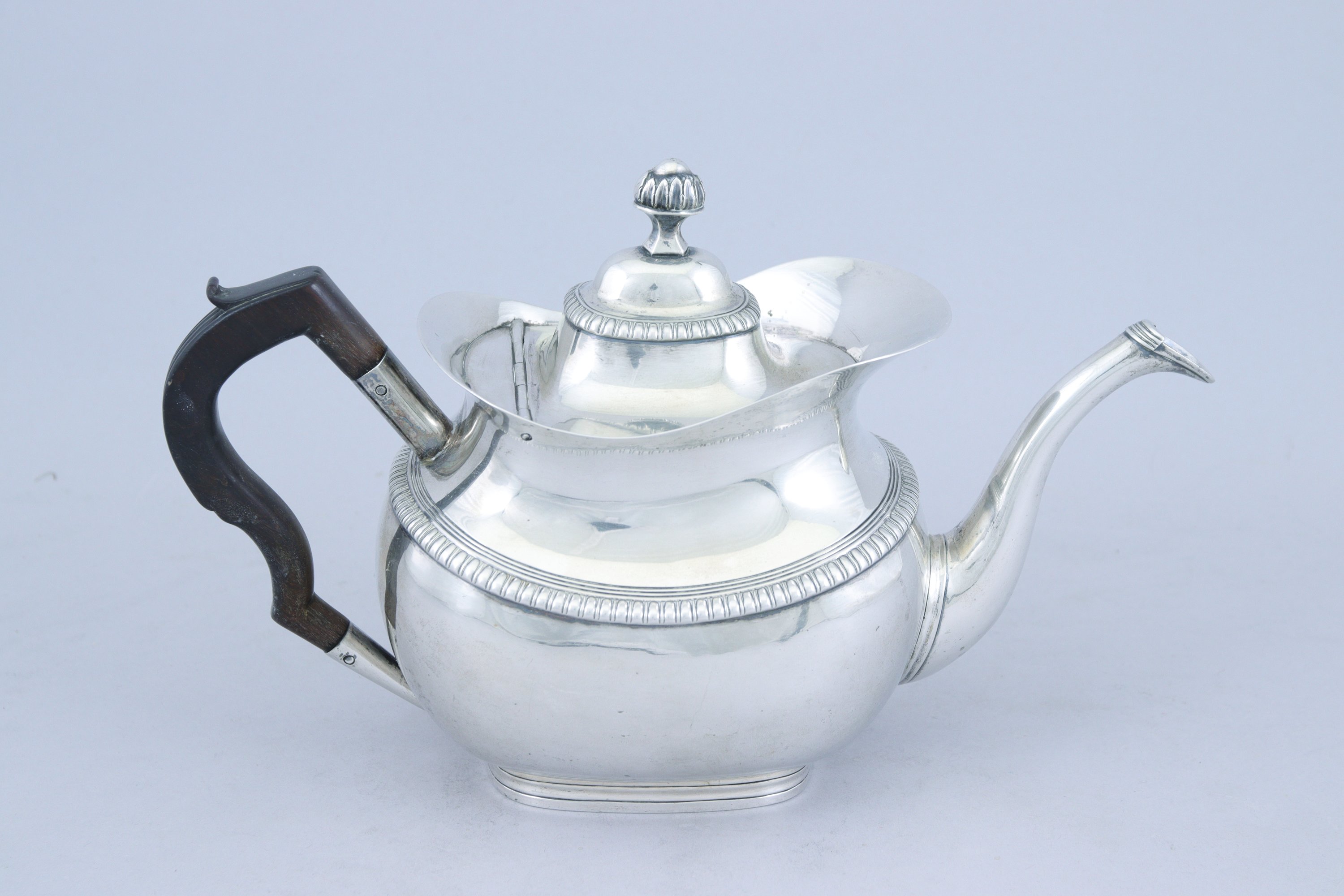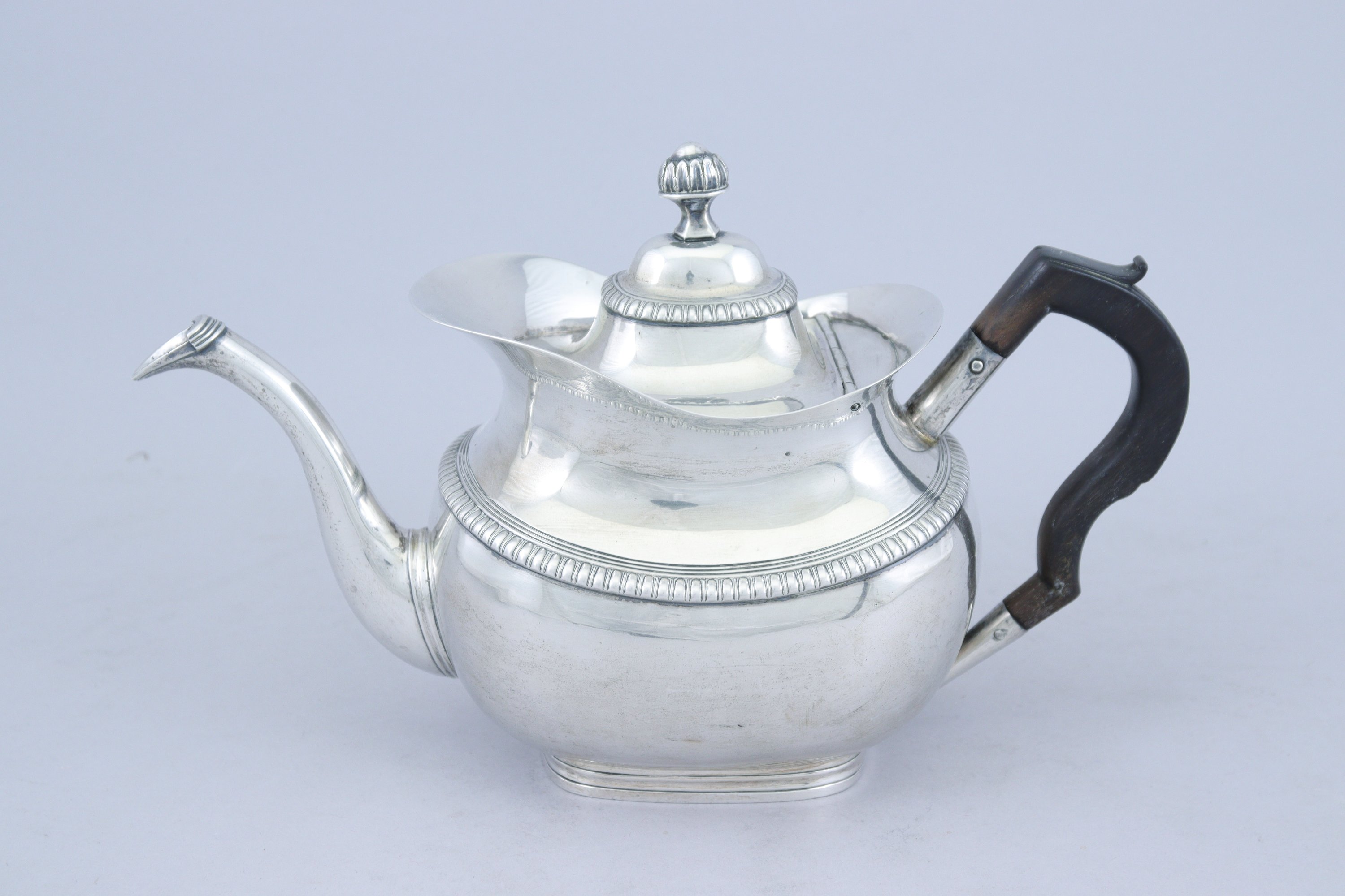 ANGLETERRE, XIXe ? THÉIÈRE en argent, corps et couvercle ornés de filets et de frises de godrons. Base rectangulaire ornée de filets. Col évasé. Fretel à godrons imitant des feuilles d'eau. Monogramme "MS" entrelacés. Anse en bois noirci mouluré.